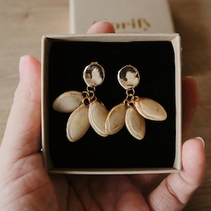 These delicate earrings combine natural beauty with a charming, sweet shape. The small, shimmering elements are reminiscent of delicate pearls and add an elegant yet sweet touch to any outfit. They are lightweight, lustrous, and wonderfully versatile – perfect for everyday wear or special occasions.