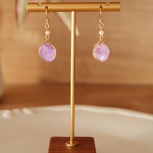 These unique earrings were handcrafted in 2019 from real forget-me-not blossoms and are little time capsules from nature. Their color has naturally changed over the years—they're no longer as fresh as they were back then, but that's precisely what makes them so special.