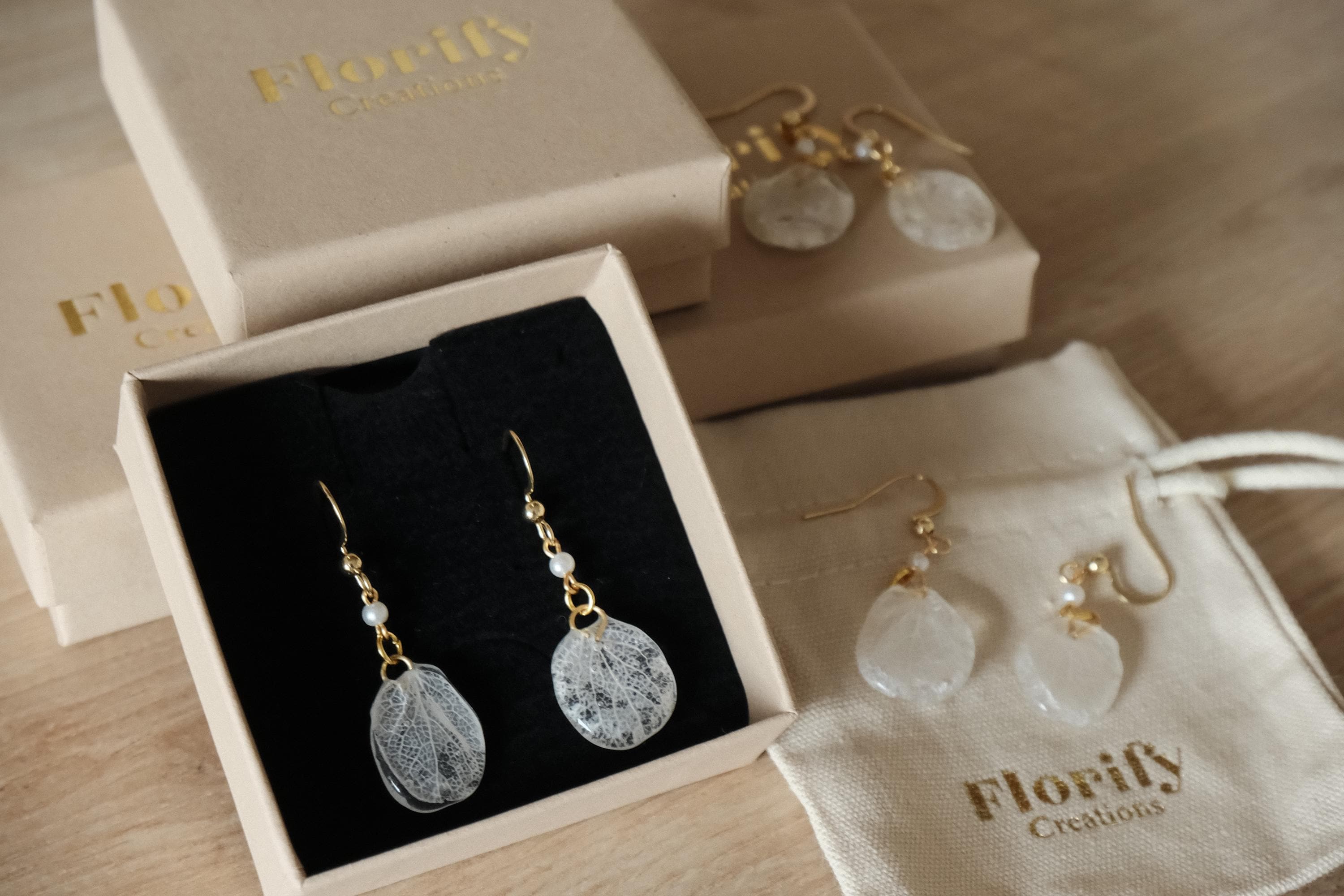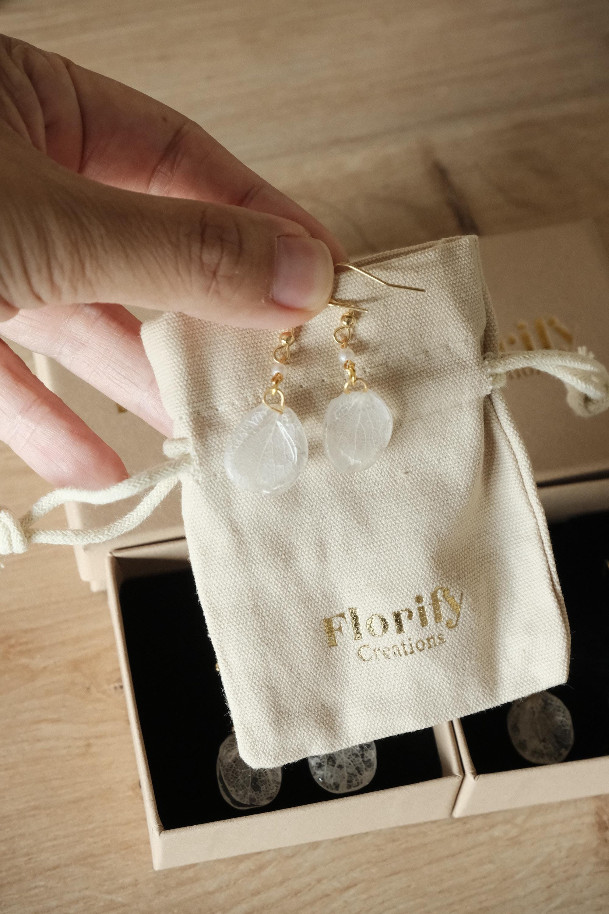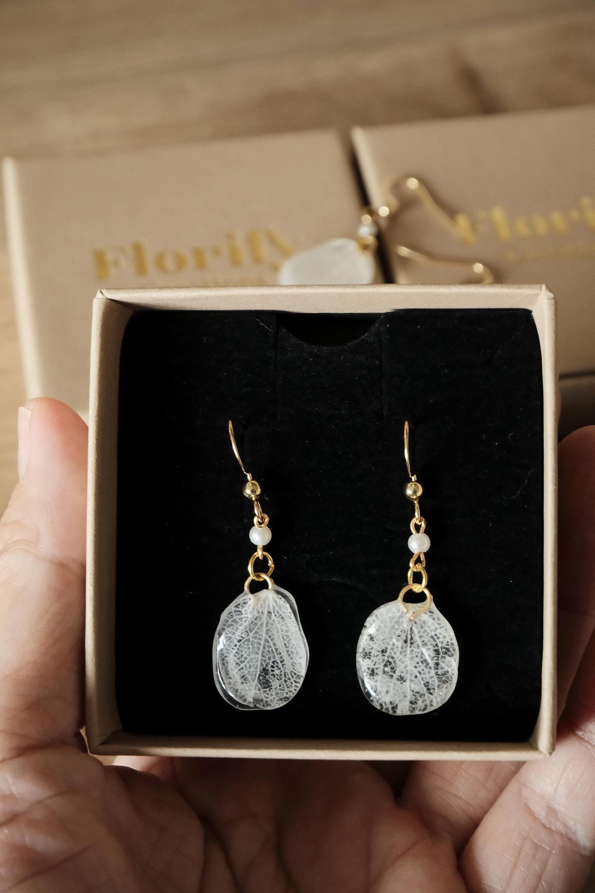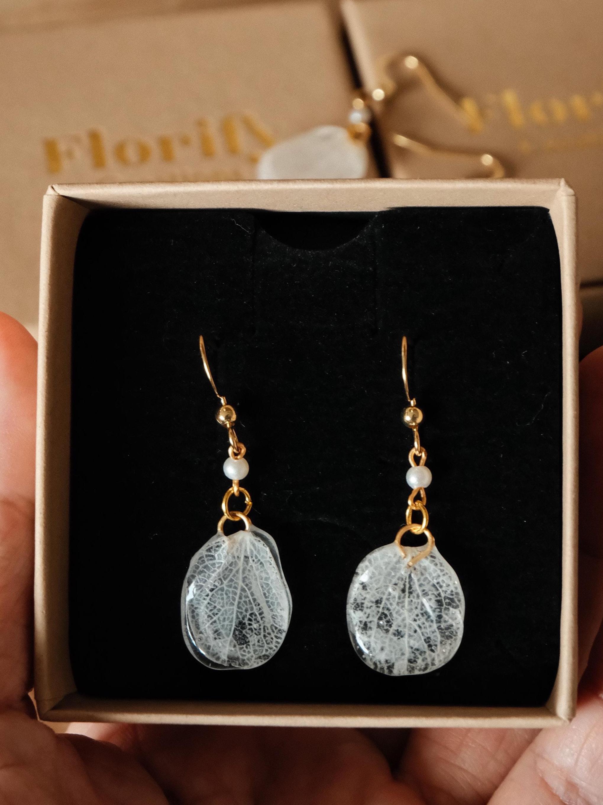 These delicate white earrings are handcrafted from real hydrangea petals, preserved in clear resin to showcase their natural beauty. Each petal is carefully selected for its unique shape and texture, creating a pair of earrings that is light, elegant, and versatile.