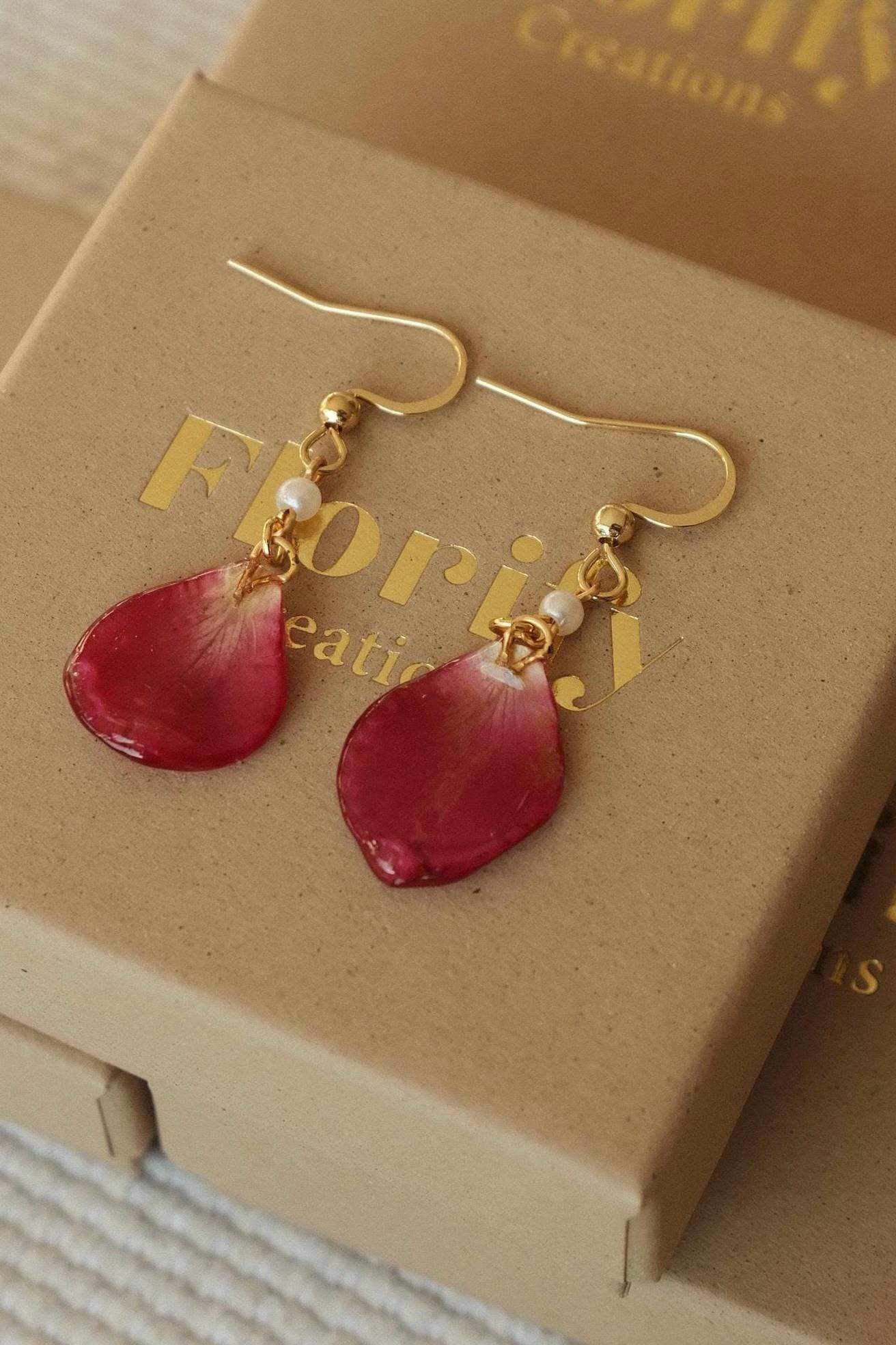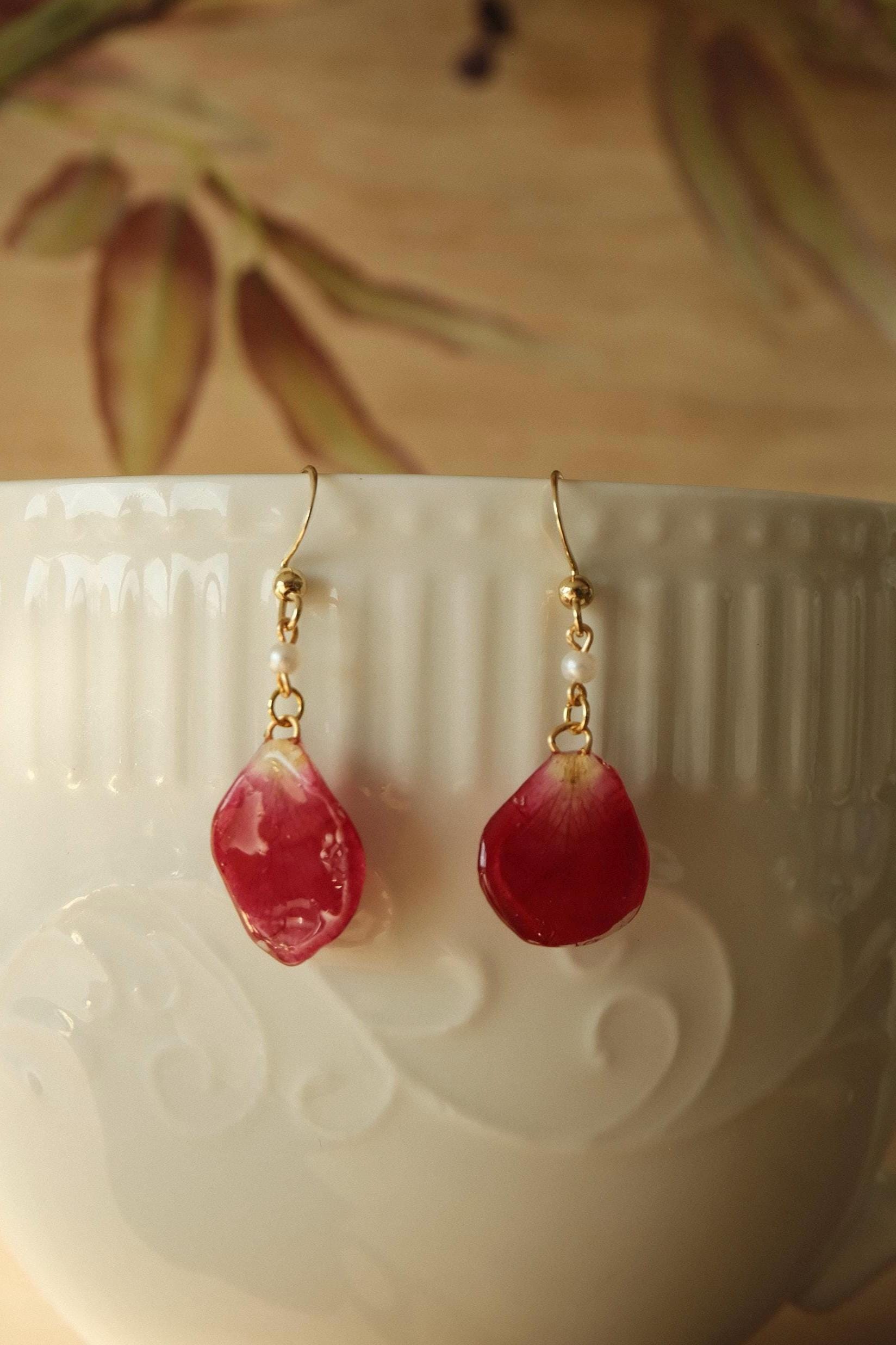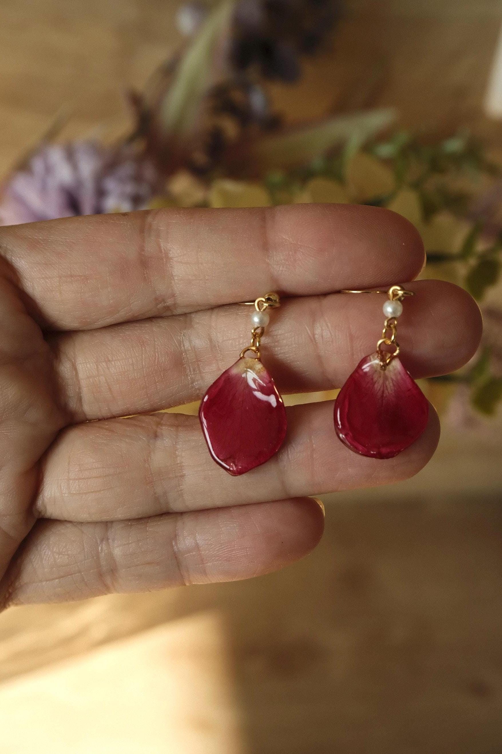 📐 Size & Materials: • Material: Real rose petal, resin, stainless steel hooks • Size: Approx. 3.5 cm long • Lightweight and comfortable to wear