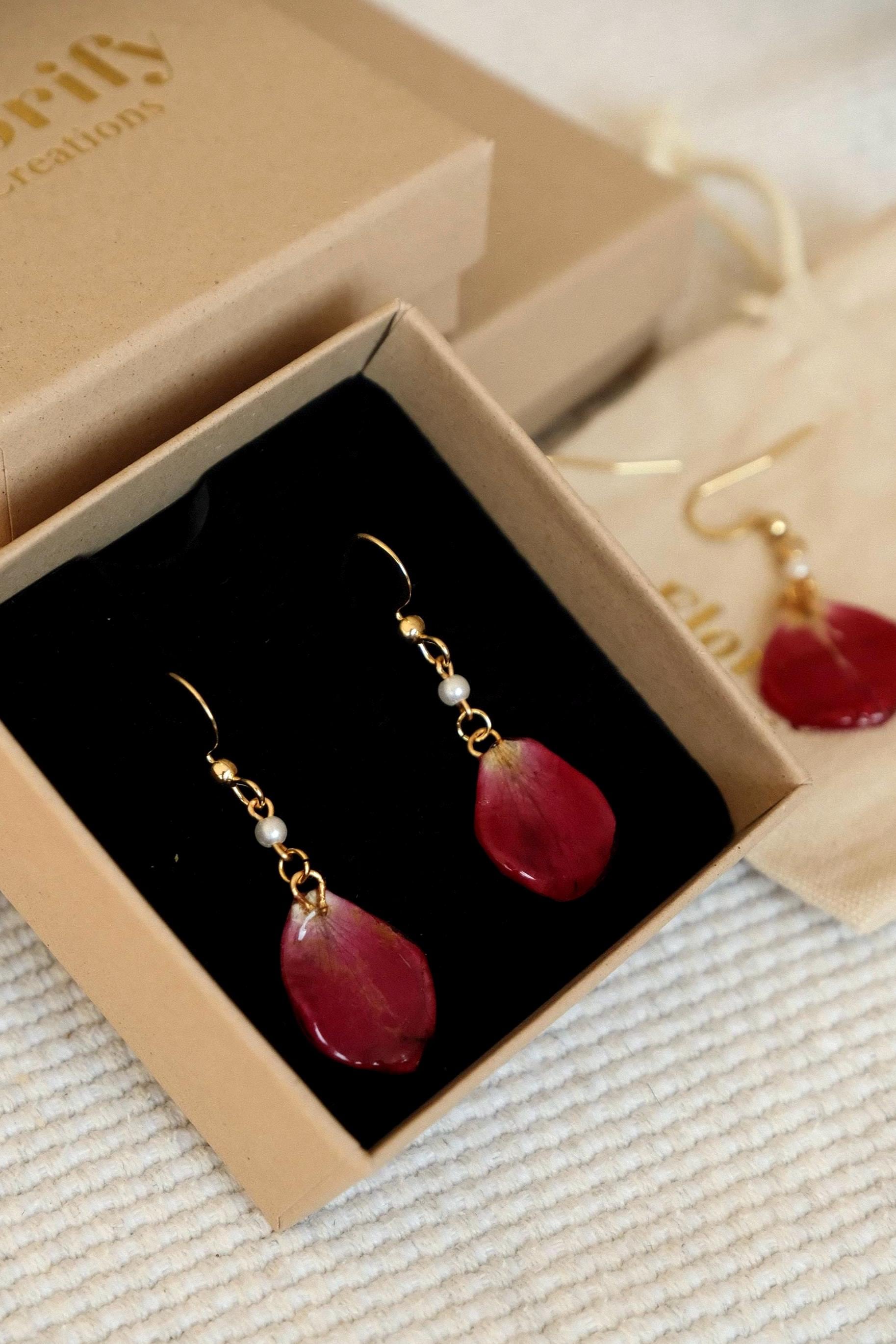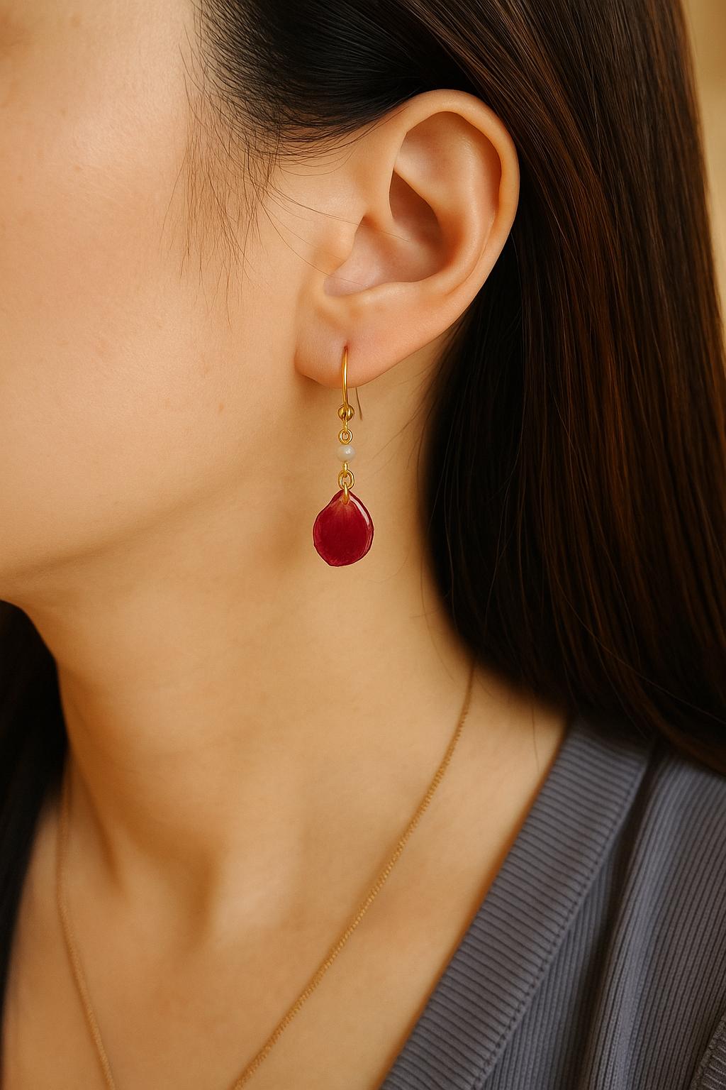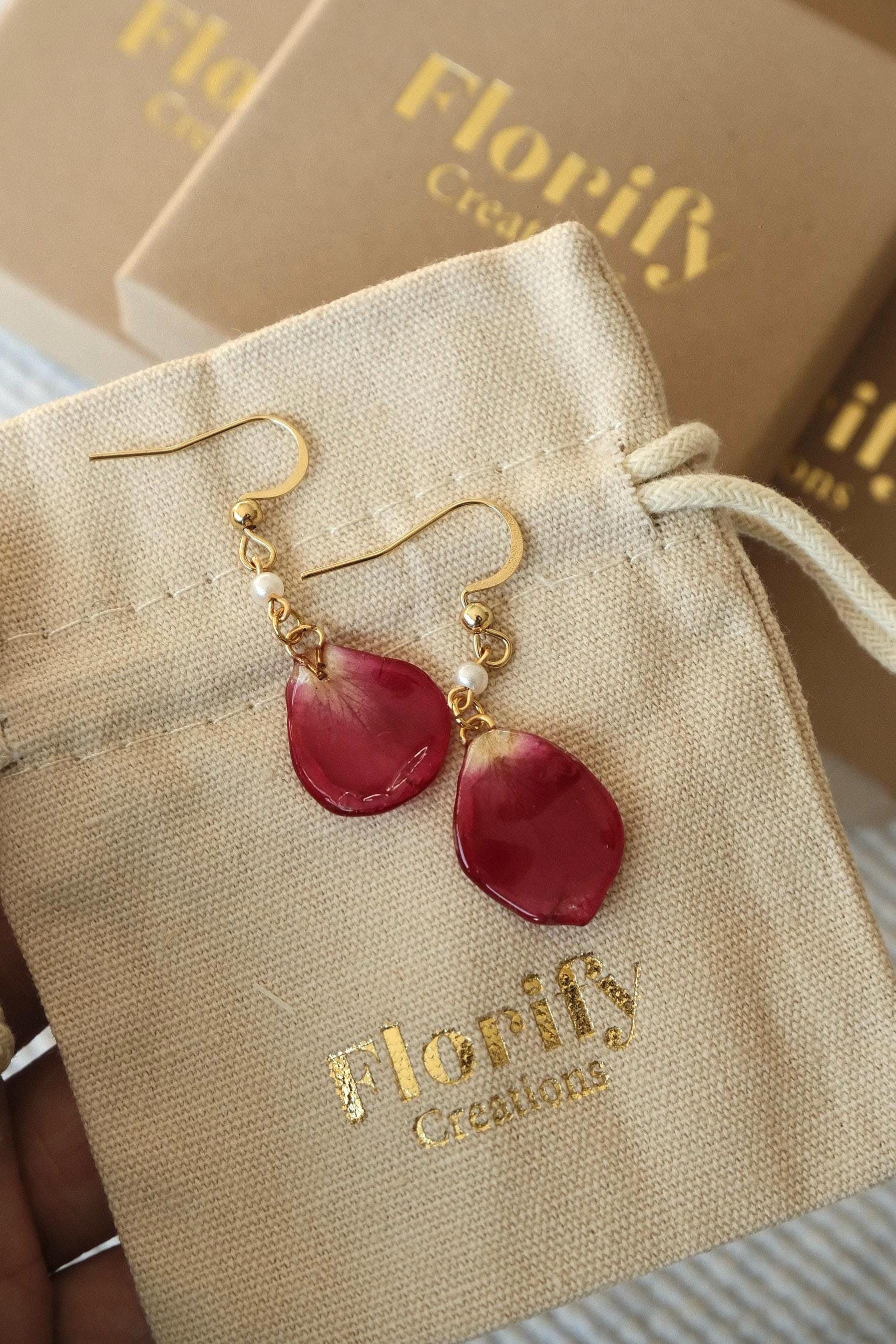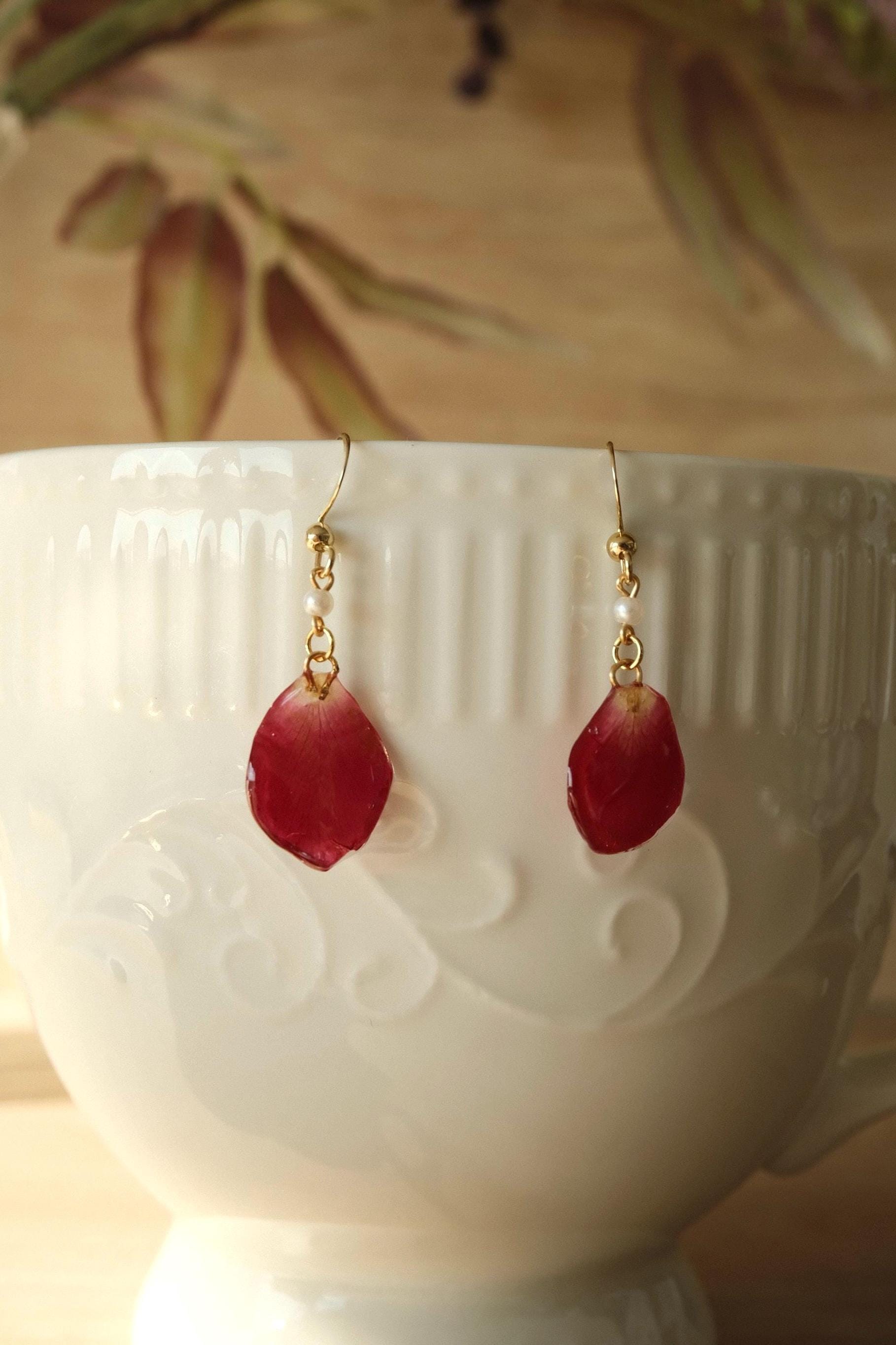 📐 Size & Materials: • Material: Real rose petal, resin, stainless steel hooks • Size: Approx. 3.5 cm long • Lightweight and comfortable to wear