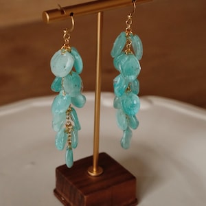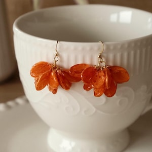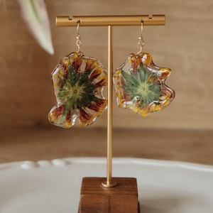 These delicate earrings are made from real purple hydrangea petals, carefully preserved in resin to keep their natural texture and color. Each earring features 11 translucent petals, making a total of 22 for the pair. The petals are hand-arranged and strung with gold-tone findings, creating a graceful, cascading shape.