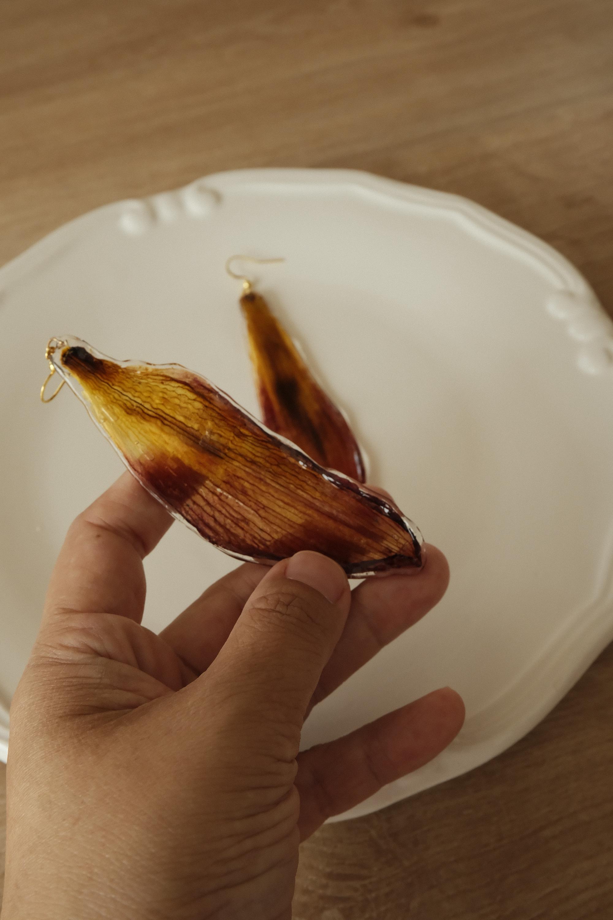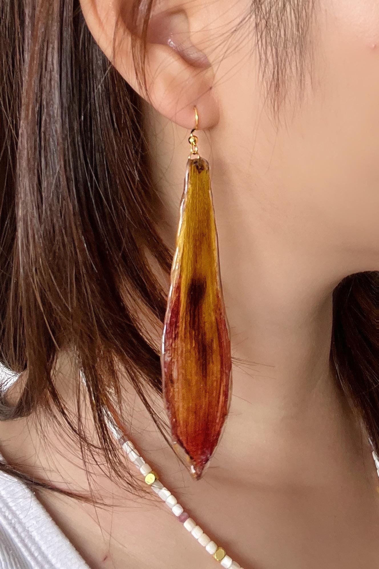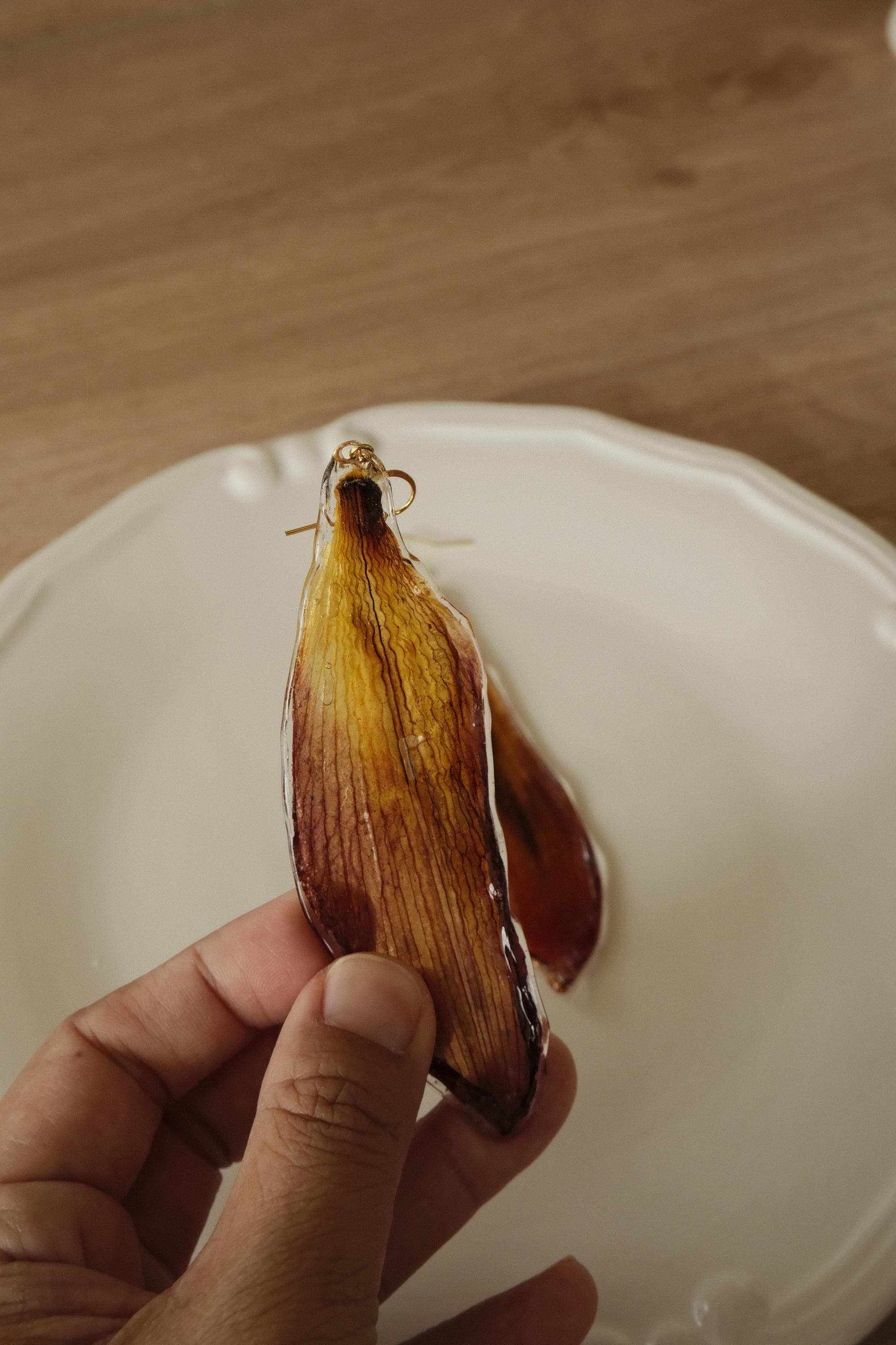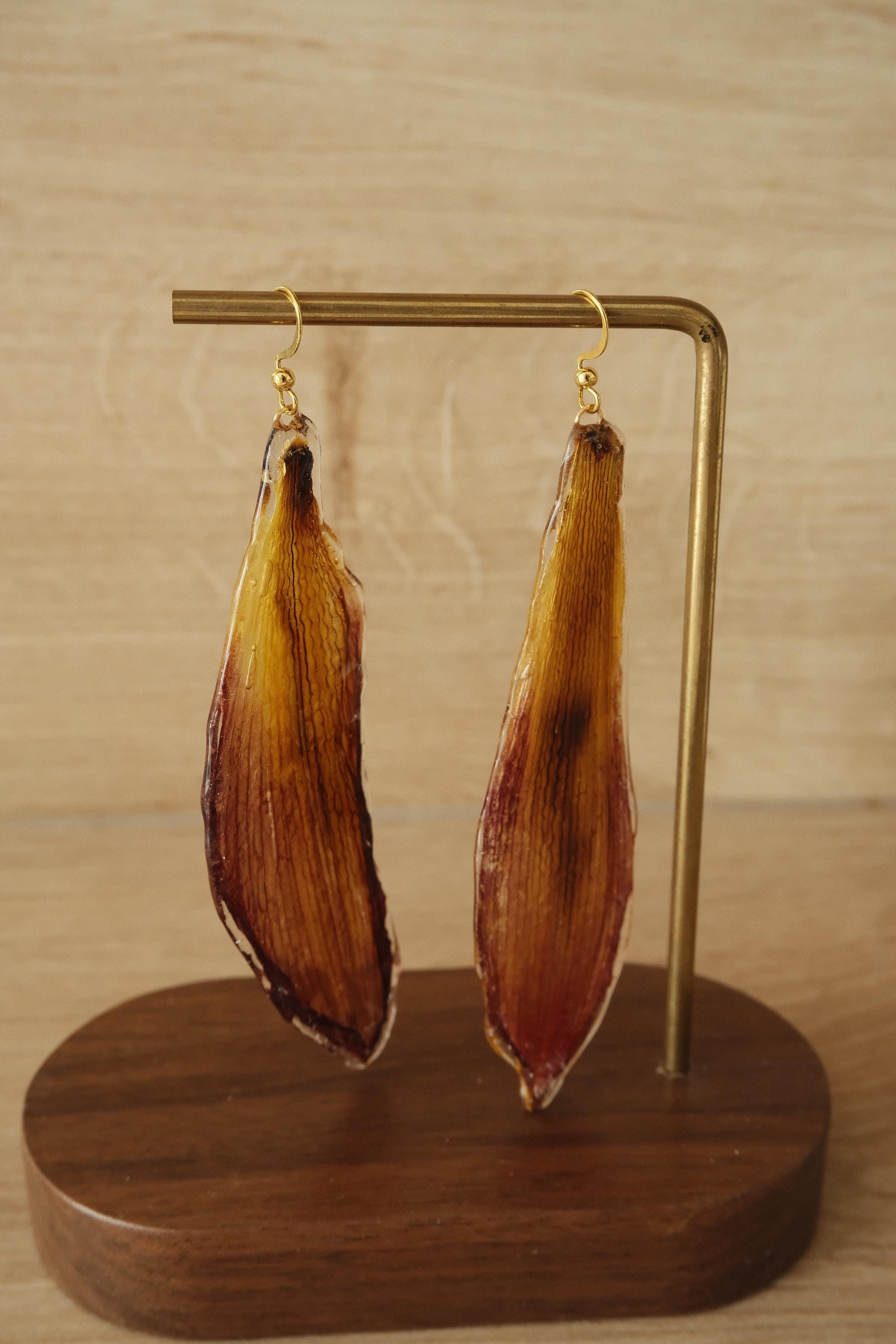 These long, striking earrings are made from real daylily (Hemerocallis) petals, carefully pressed and preserved in crystal-clear resin.