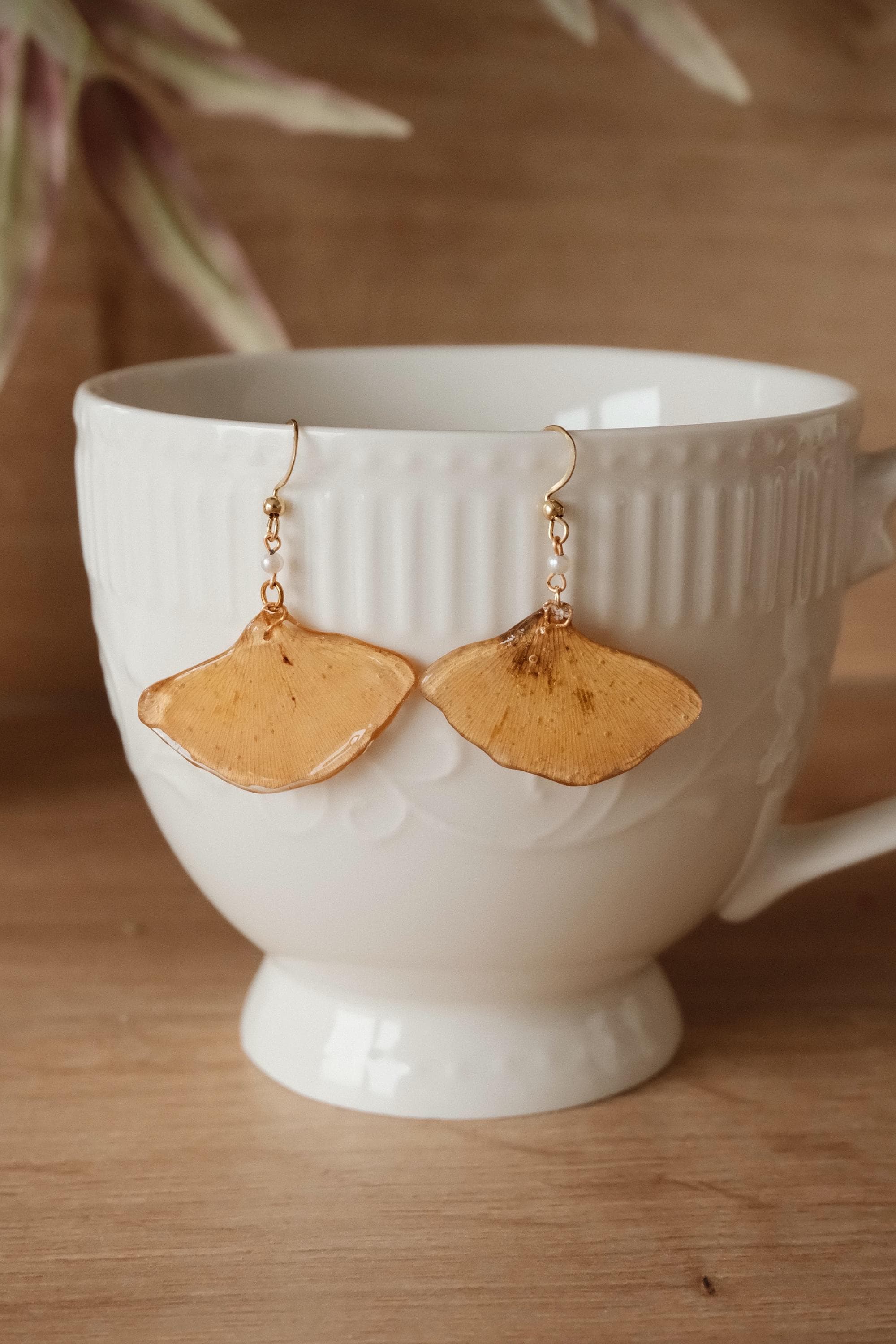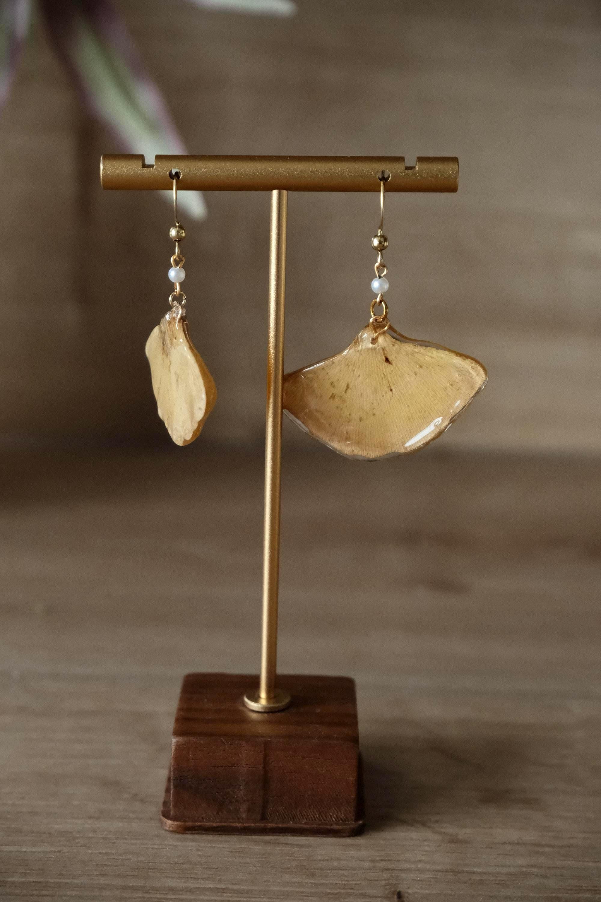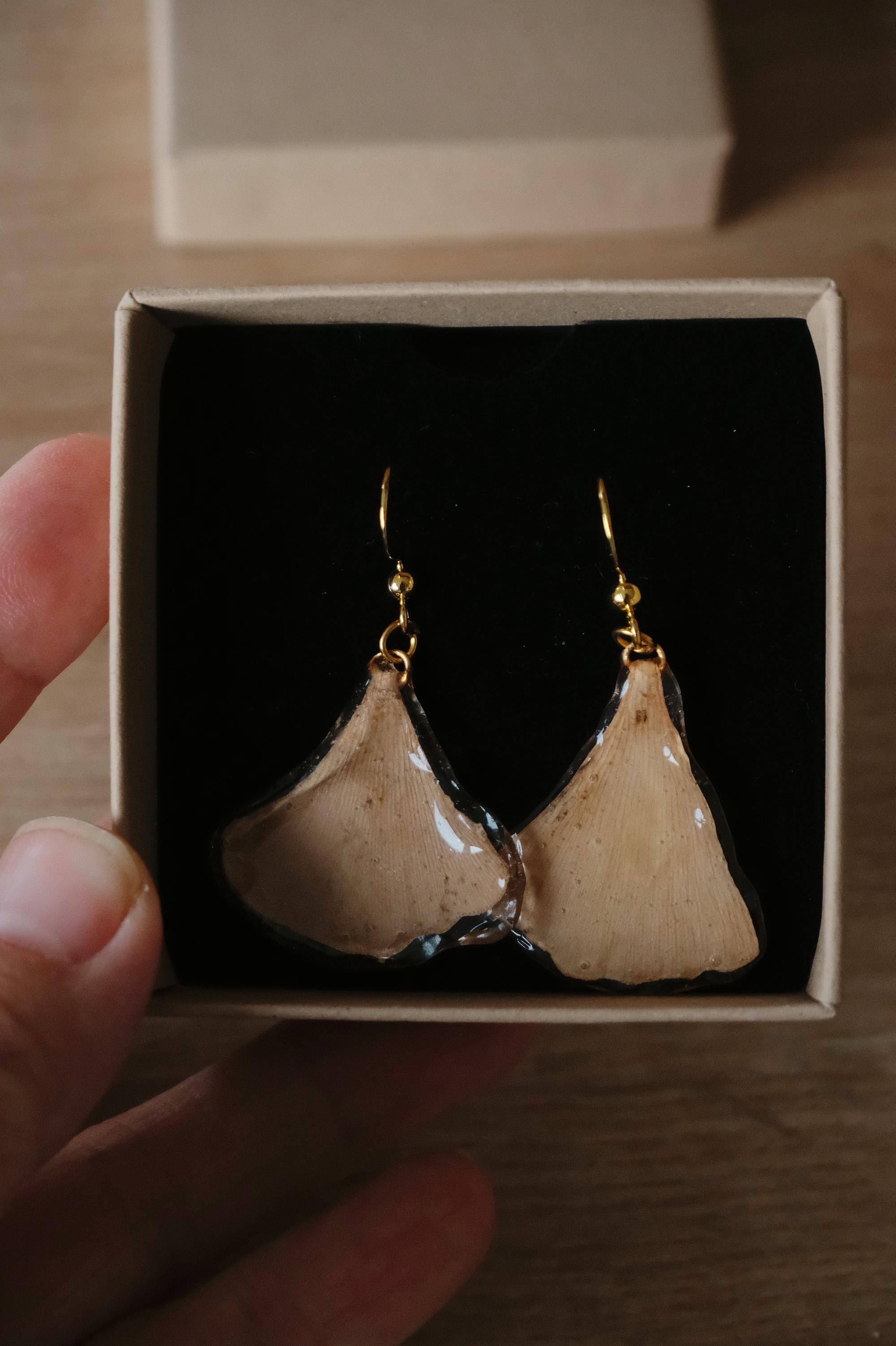 These unique earrings are crafted from real ginkgo leaves and preserved with a protective layer of resin. The soft golden-brown color and natural leaf texture lend them a timeless elegance and organic beauty. Each earring is unique, just as nature created it.