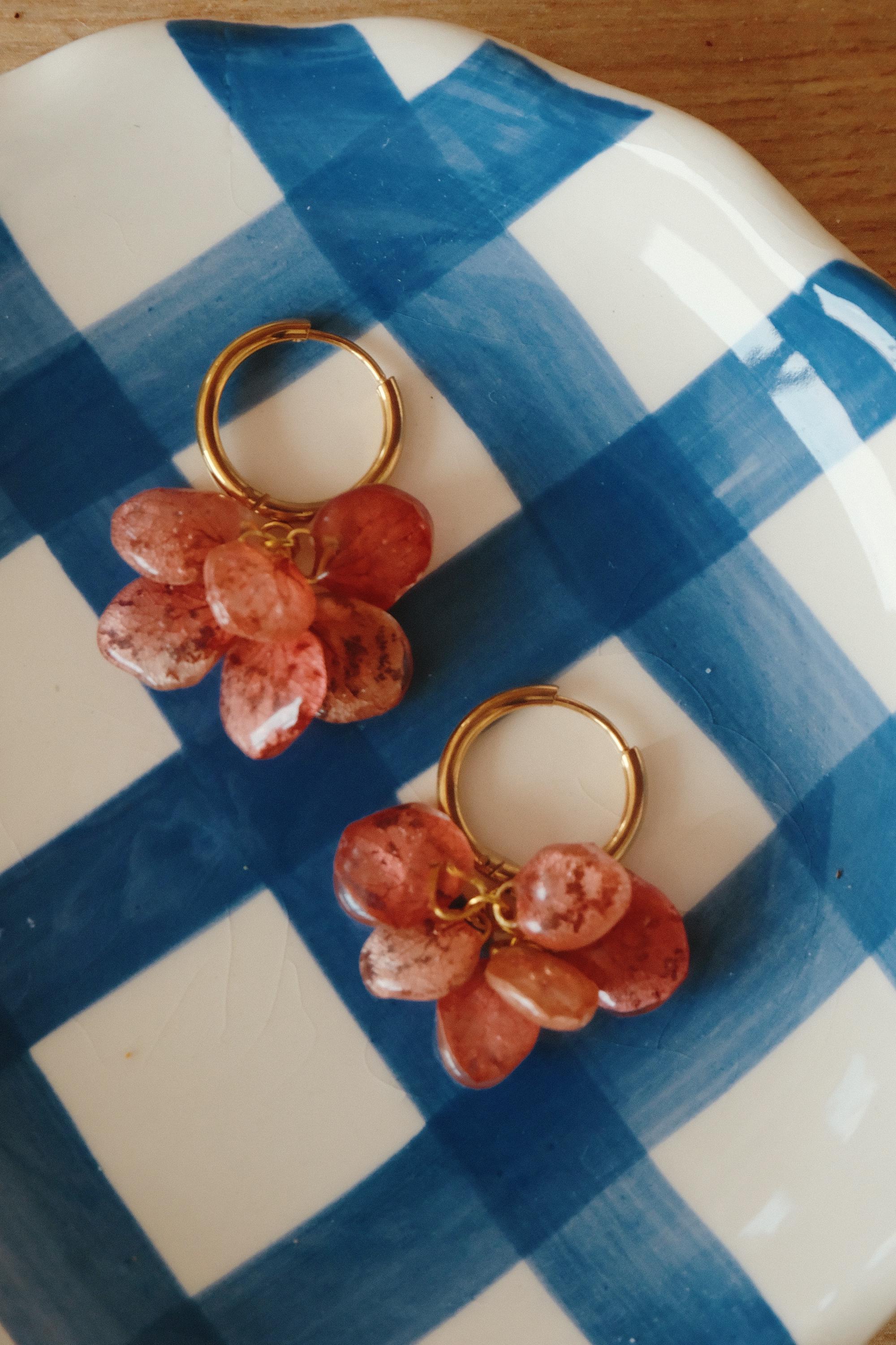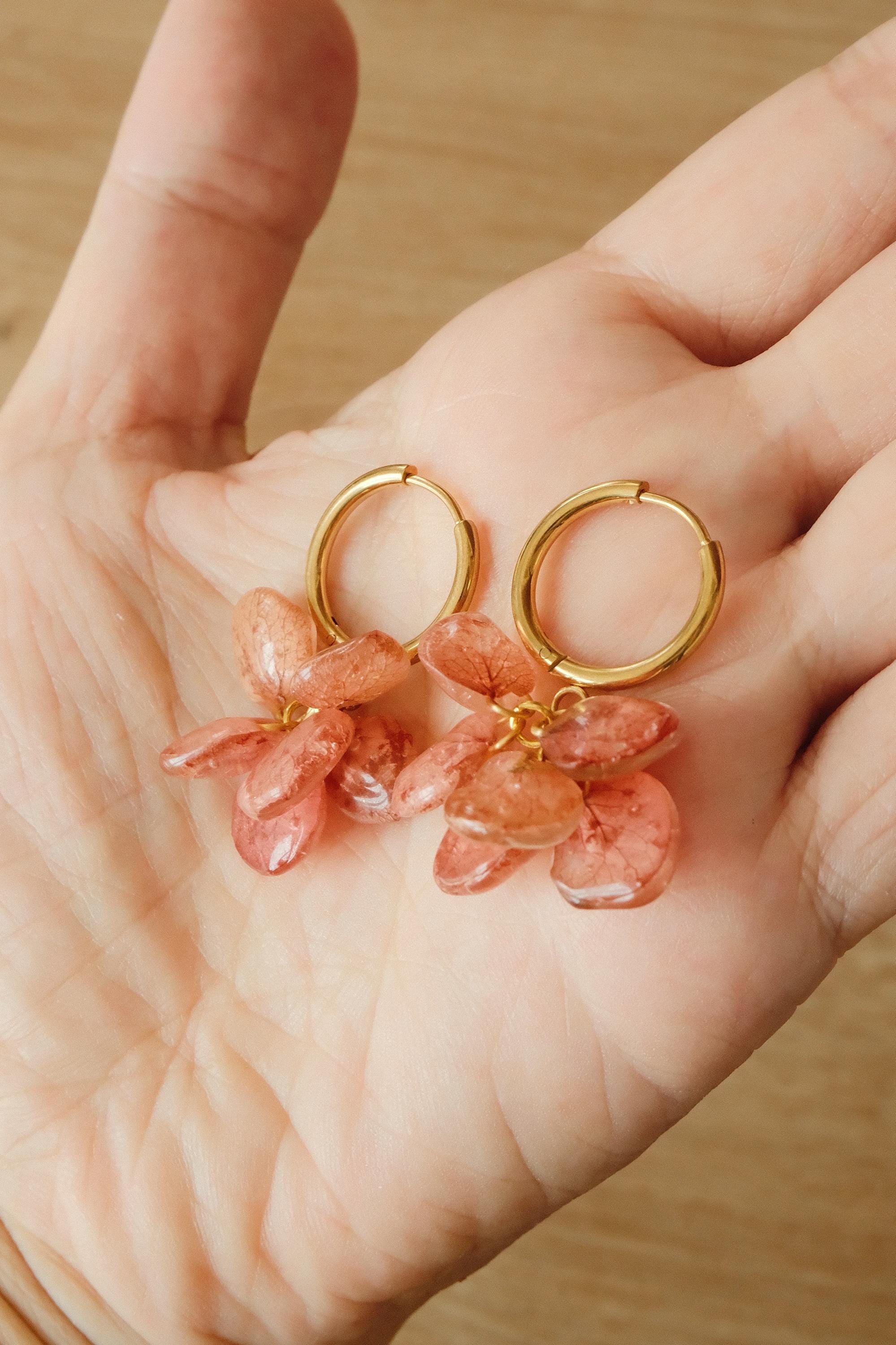 These delicate earrings are handcrafted from real hydrangea petals, each one carefully pressed, preserved in resin, and arranged in a soft cascading design. Their light pink tone and organic petal shapes give a natural, breezy summer vibe—perfect for sunlit days, garden parties, or gifting to a nature-loving friend.
