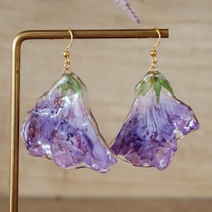 Every petal tells its own story, making each pair a true one-of-a-kind treasure. The natural veins and soft purple shades of the flowers shine through the resin, creating a lightweight yet eye-catching accessory. Perfect for nature lovers, romantics, and those who appreciate truly handmade art.