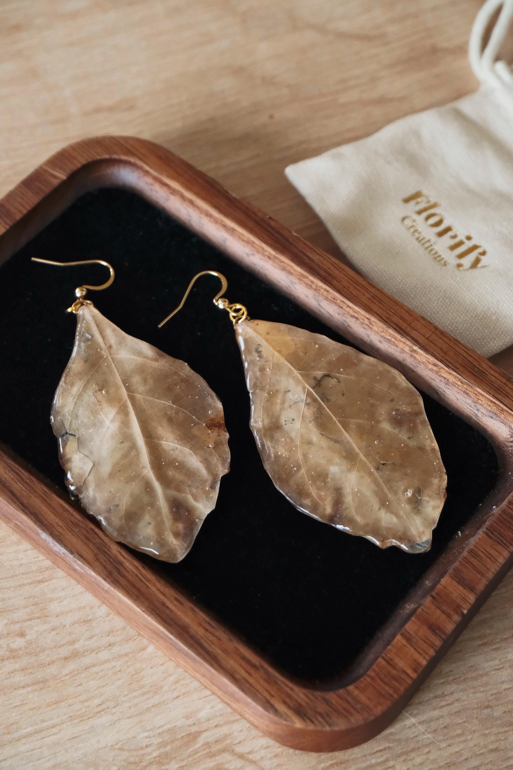 Diese besonderen Ohrringe bestehen aus echten, handgesammelten Herbstblättern, die sorgfältig gepresst und in transparentem Harz konserviert wurden.