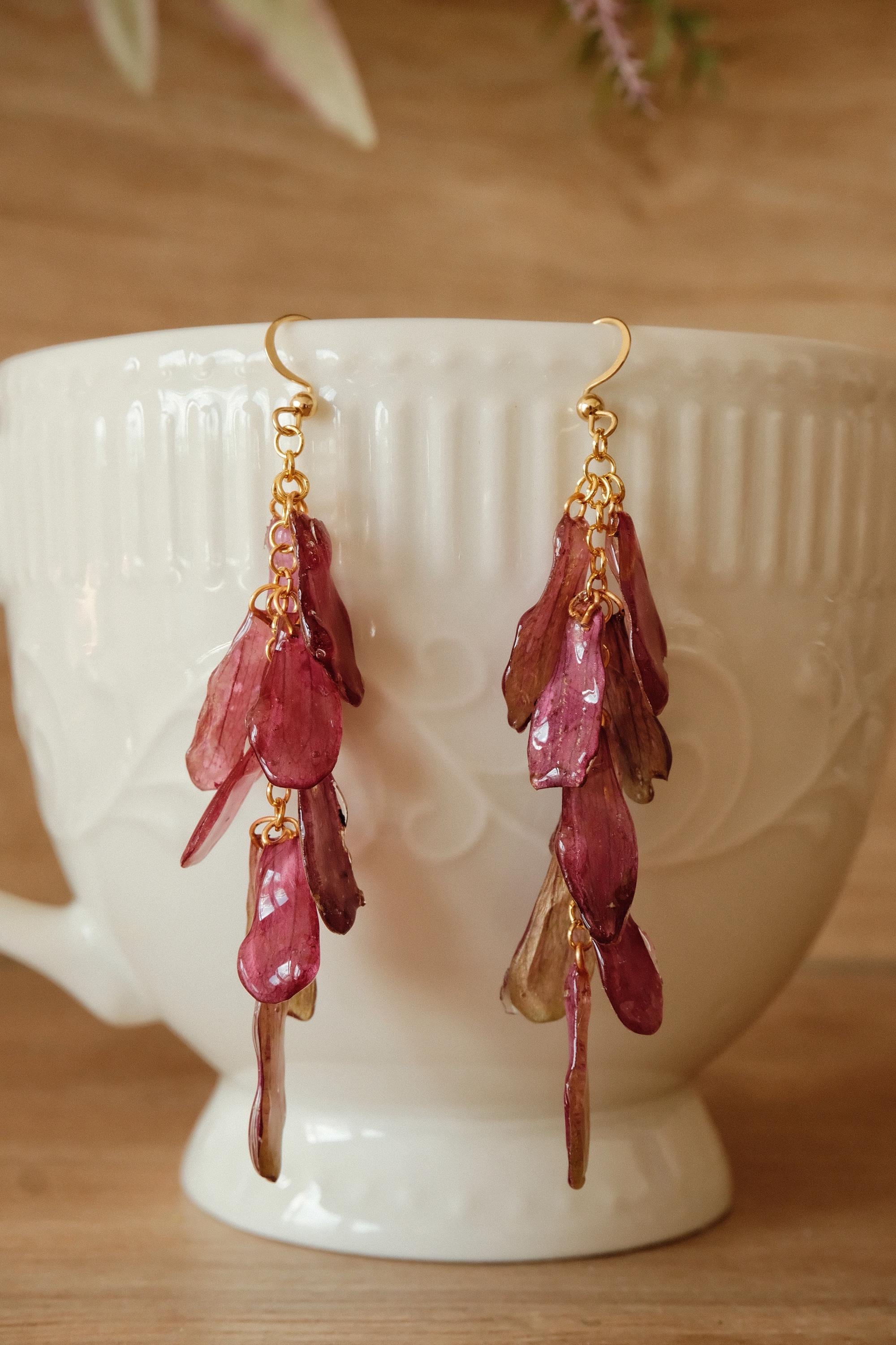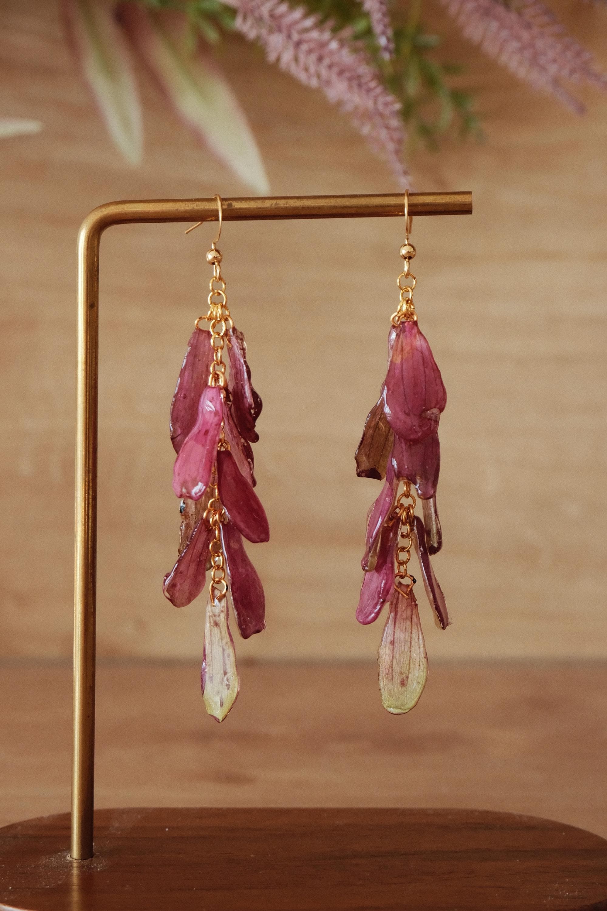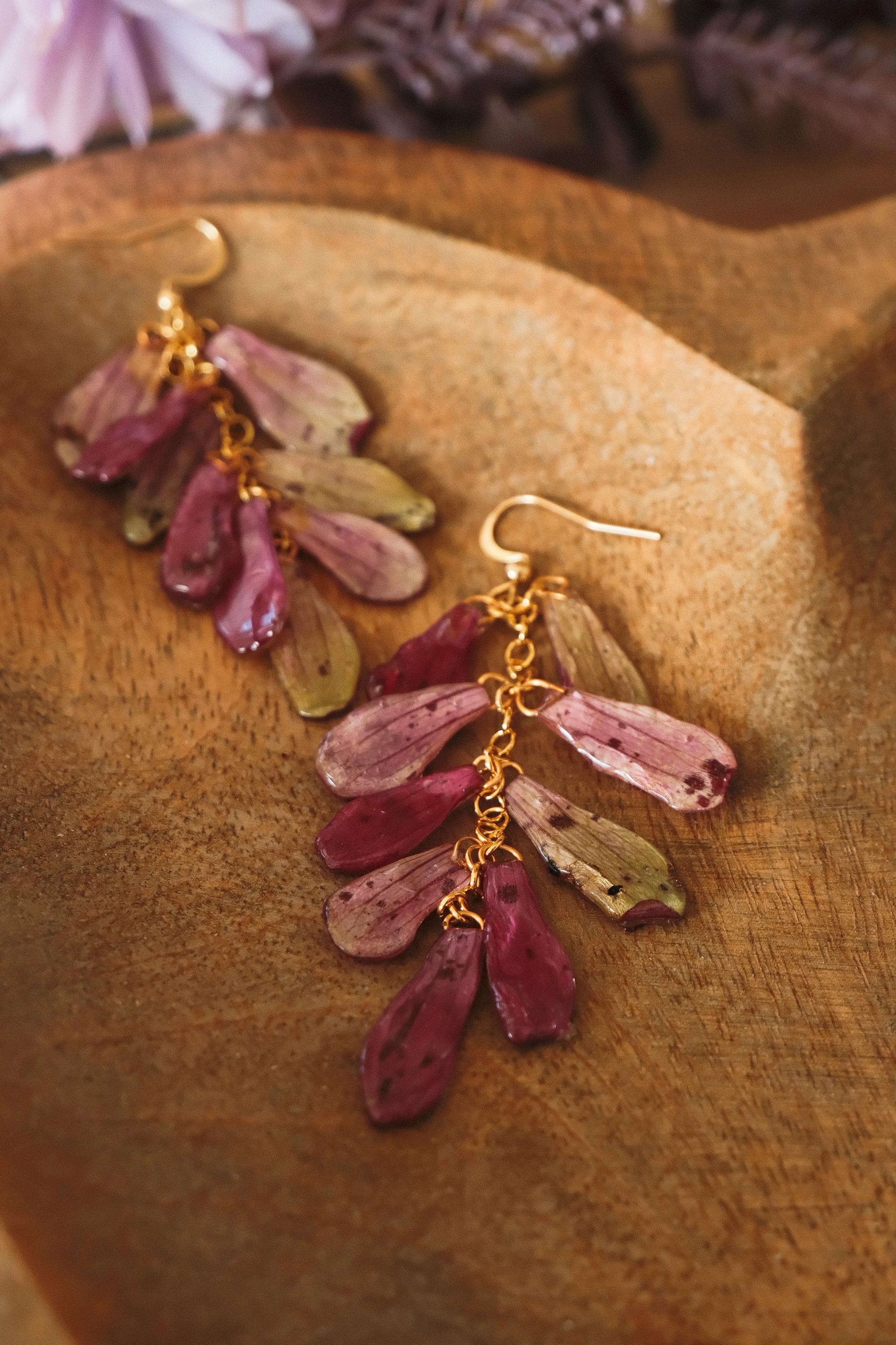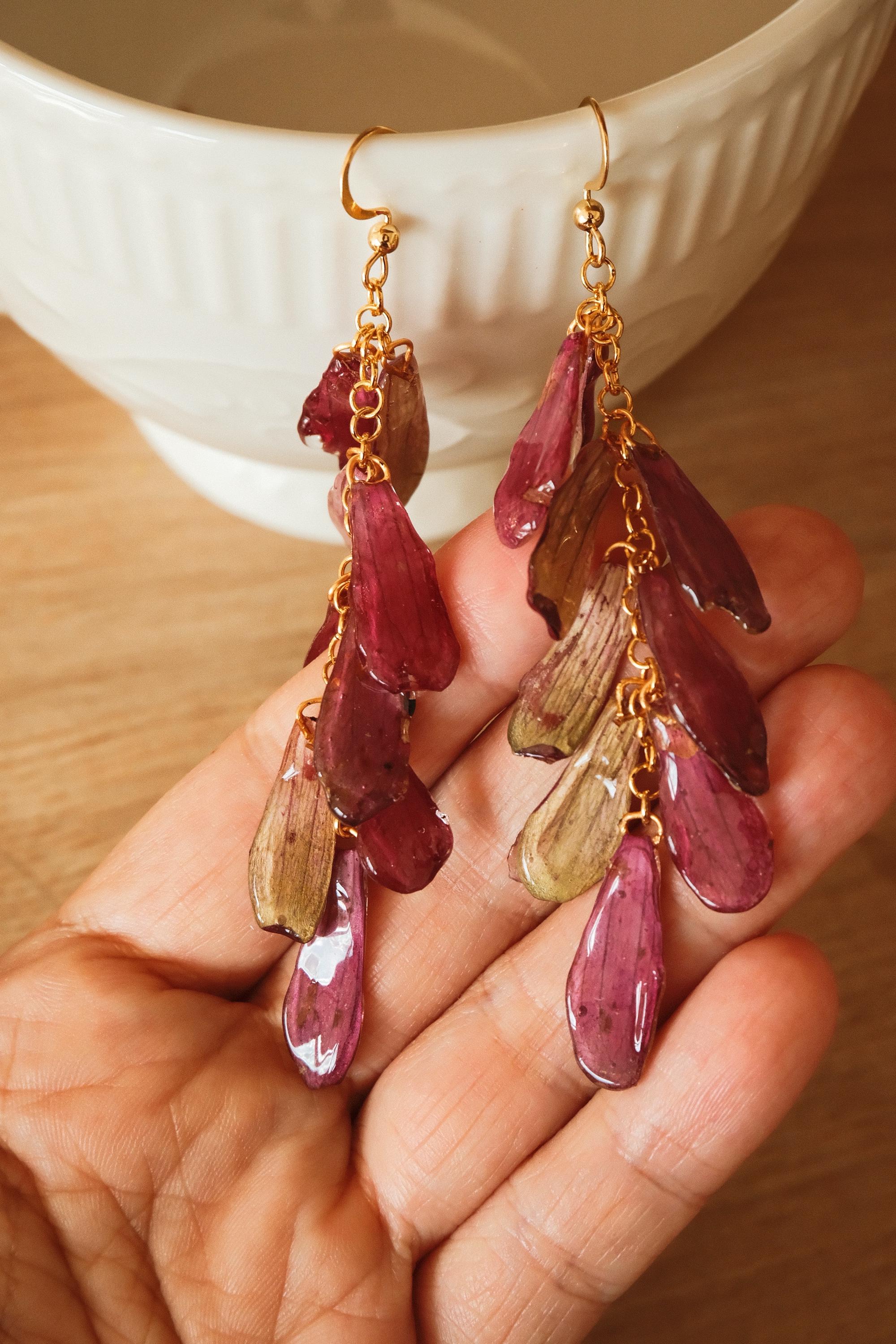 Handmade earrings made from real Cineraria petals These extraordinary statement earrings are crafted from dried Cineraria (cineraria) petals. The delicate petals were carefully pressed, preserved in UV resin, and individually bonded together, creating a natural, flowing design with artistic character.