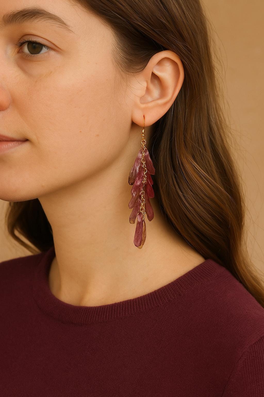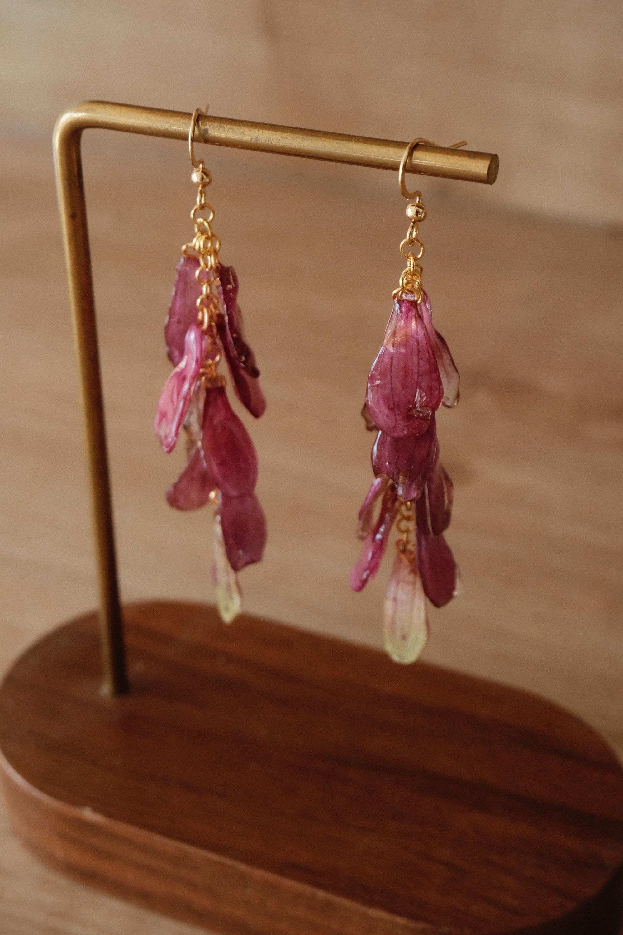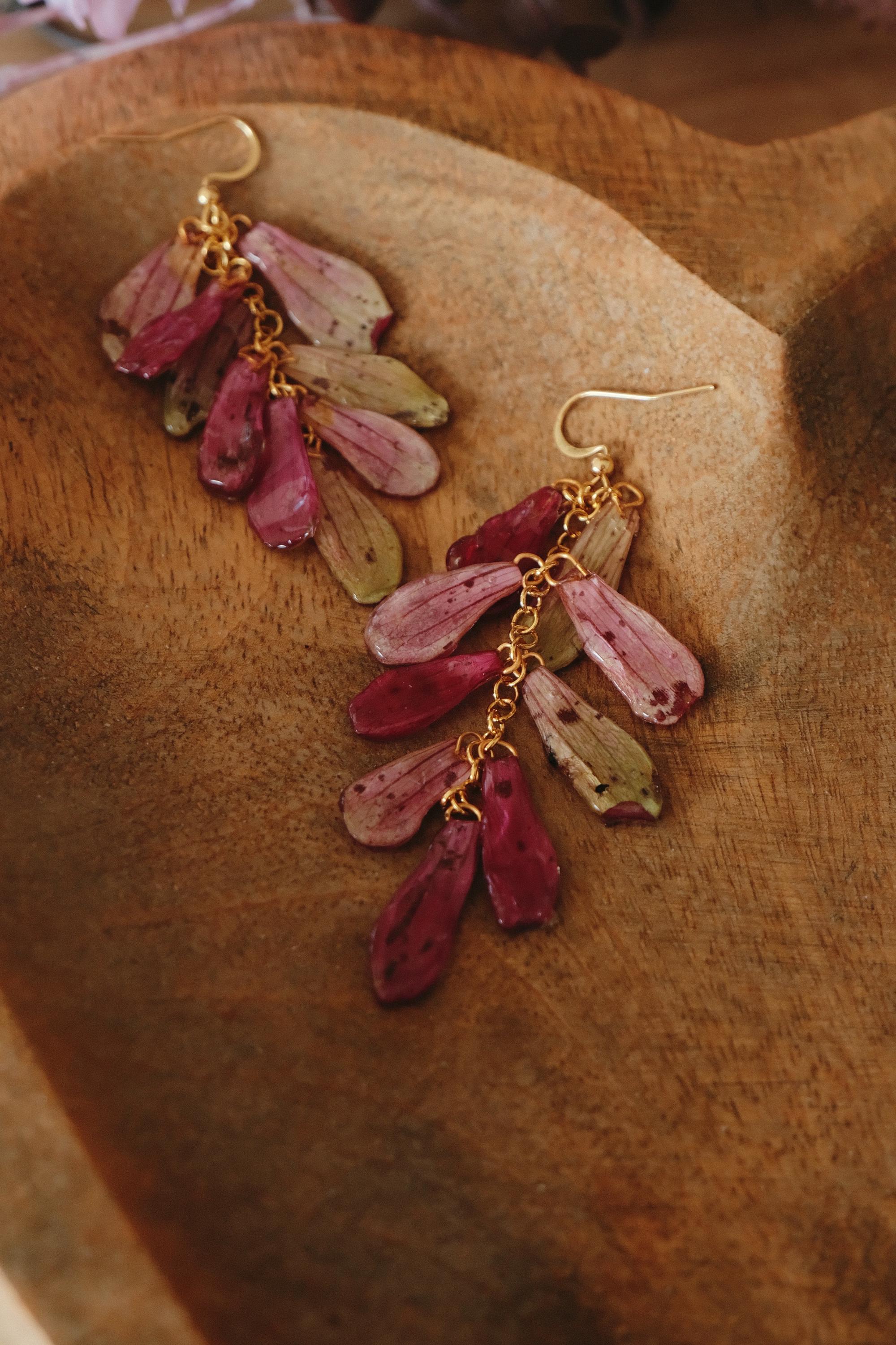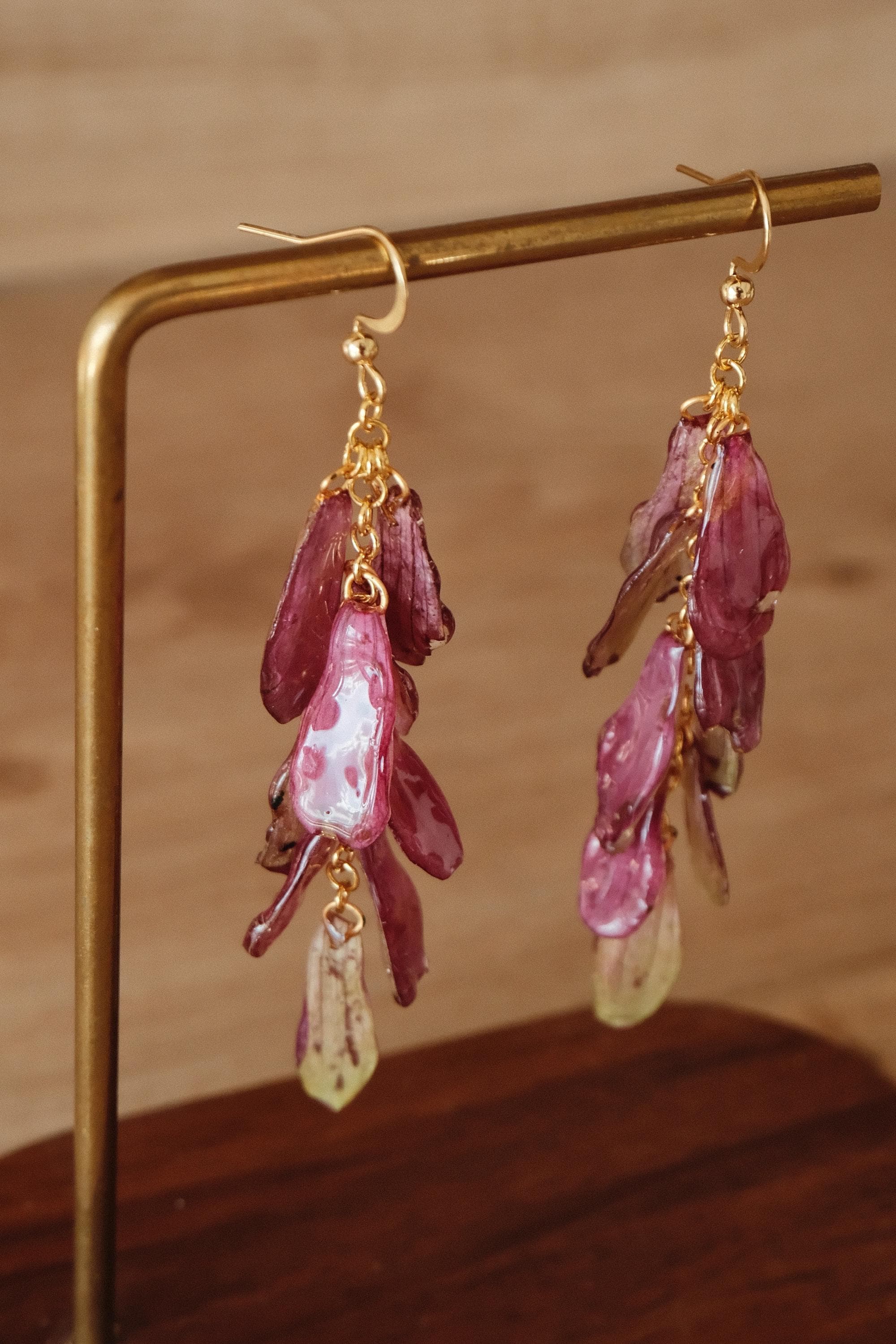 Handmade earrings made from real Cineraria petals These extraordinary statement earrings are crafted from dried Cineraria (cineraria) petals. The delicate petals were carefully pressed, preserved in UV resin, and individually bonded together, creating a natural, flowing design with artistic character.