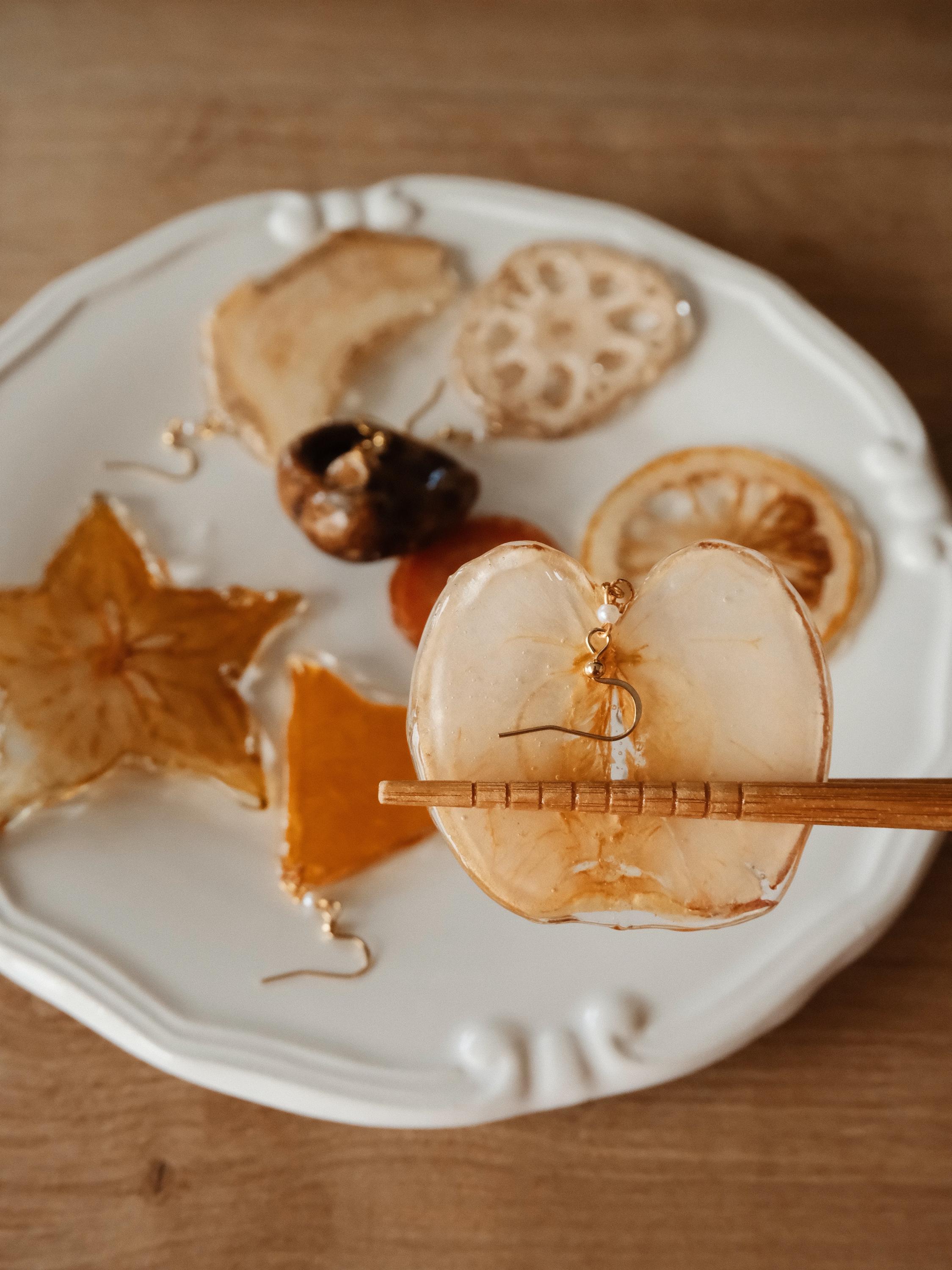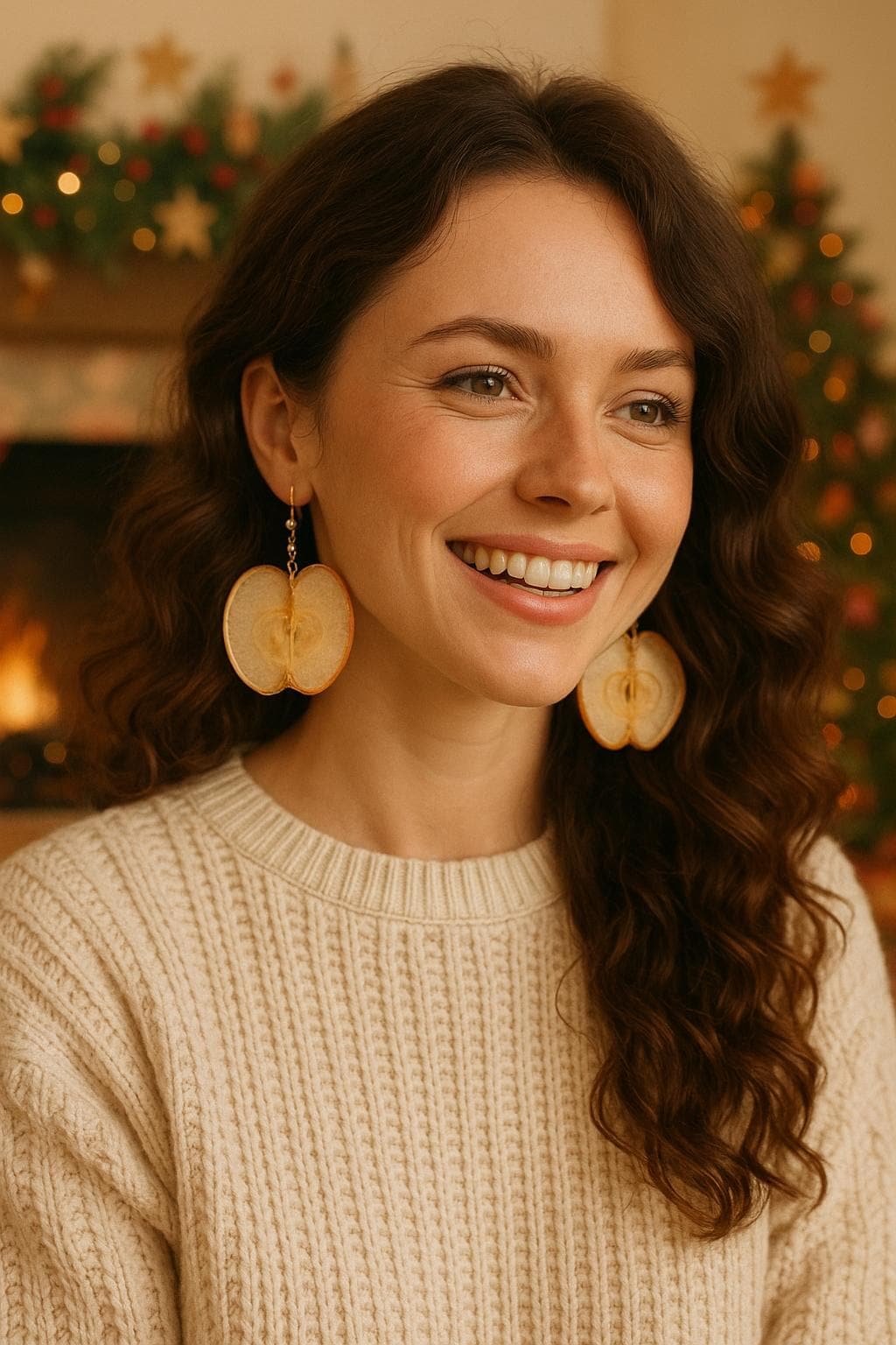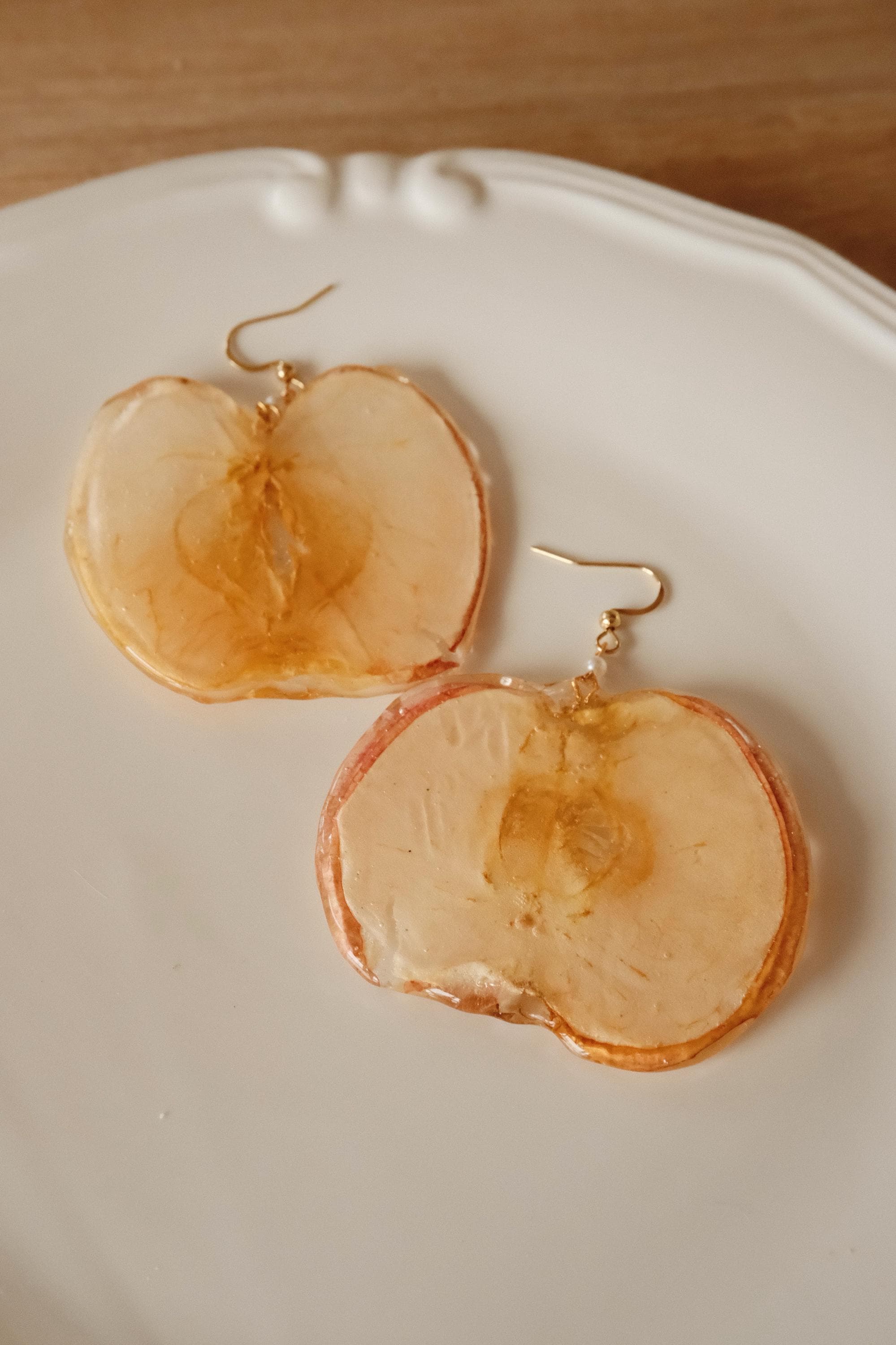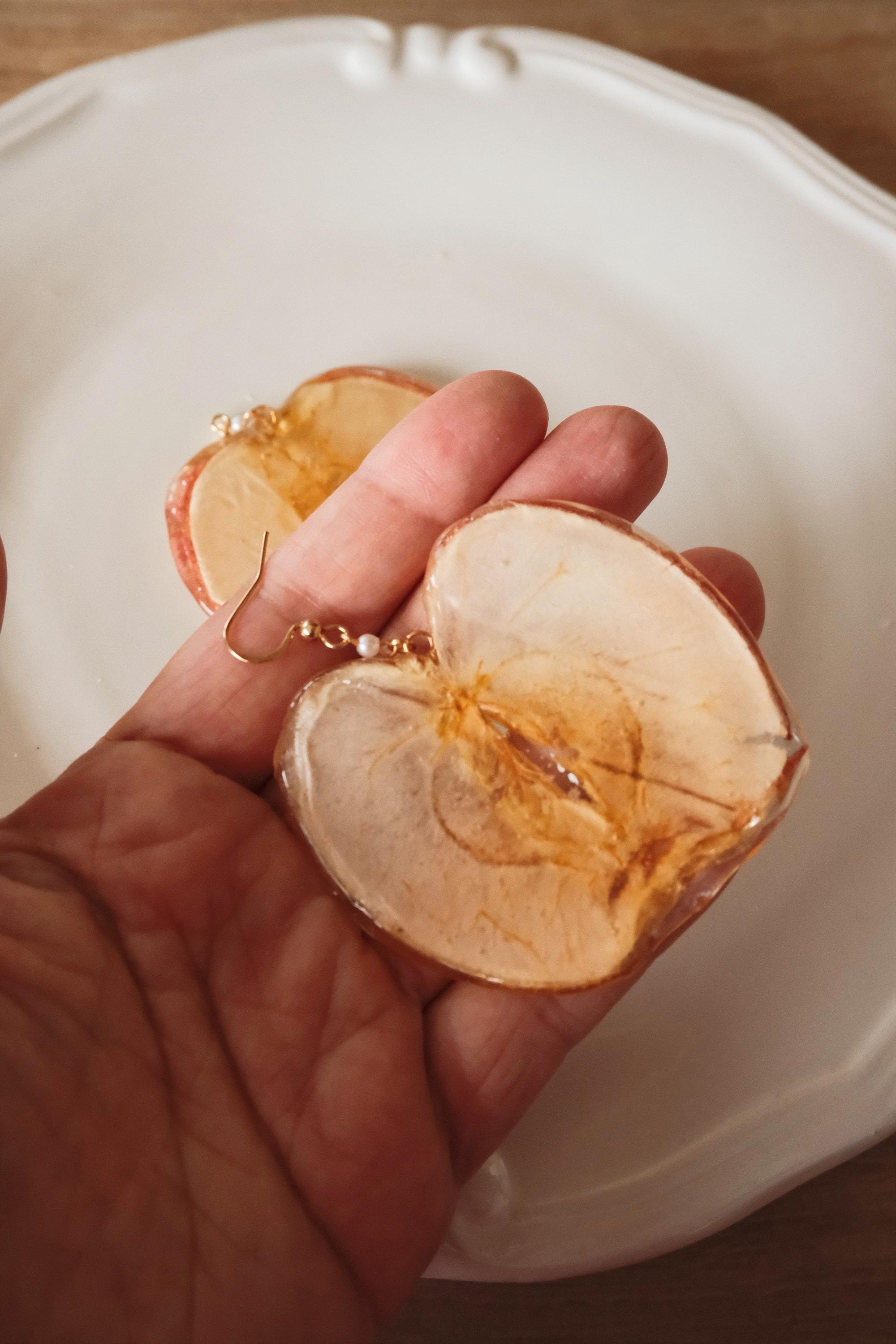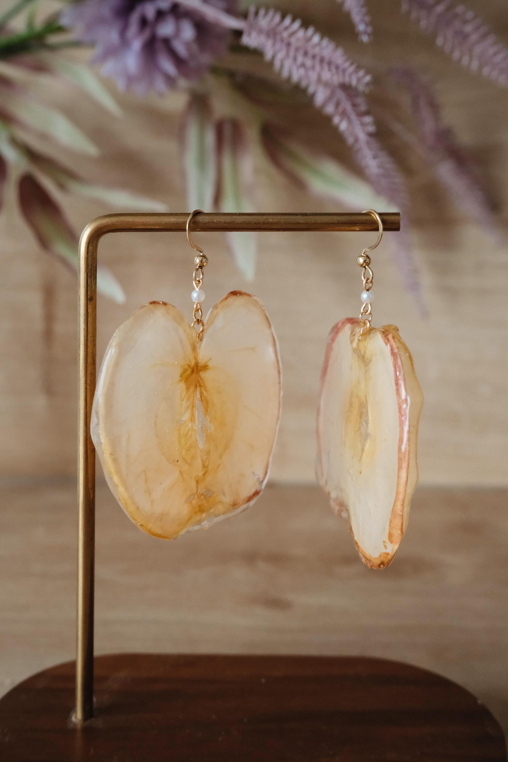A pair of earrings made from real dried apple slices — preserved forever in resin. Each slice keeps its natural seeds and texture, making every pair beautifully unique.