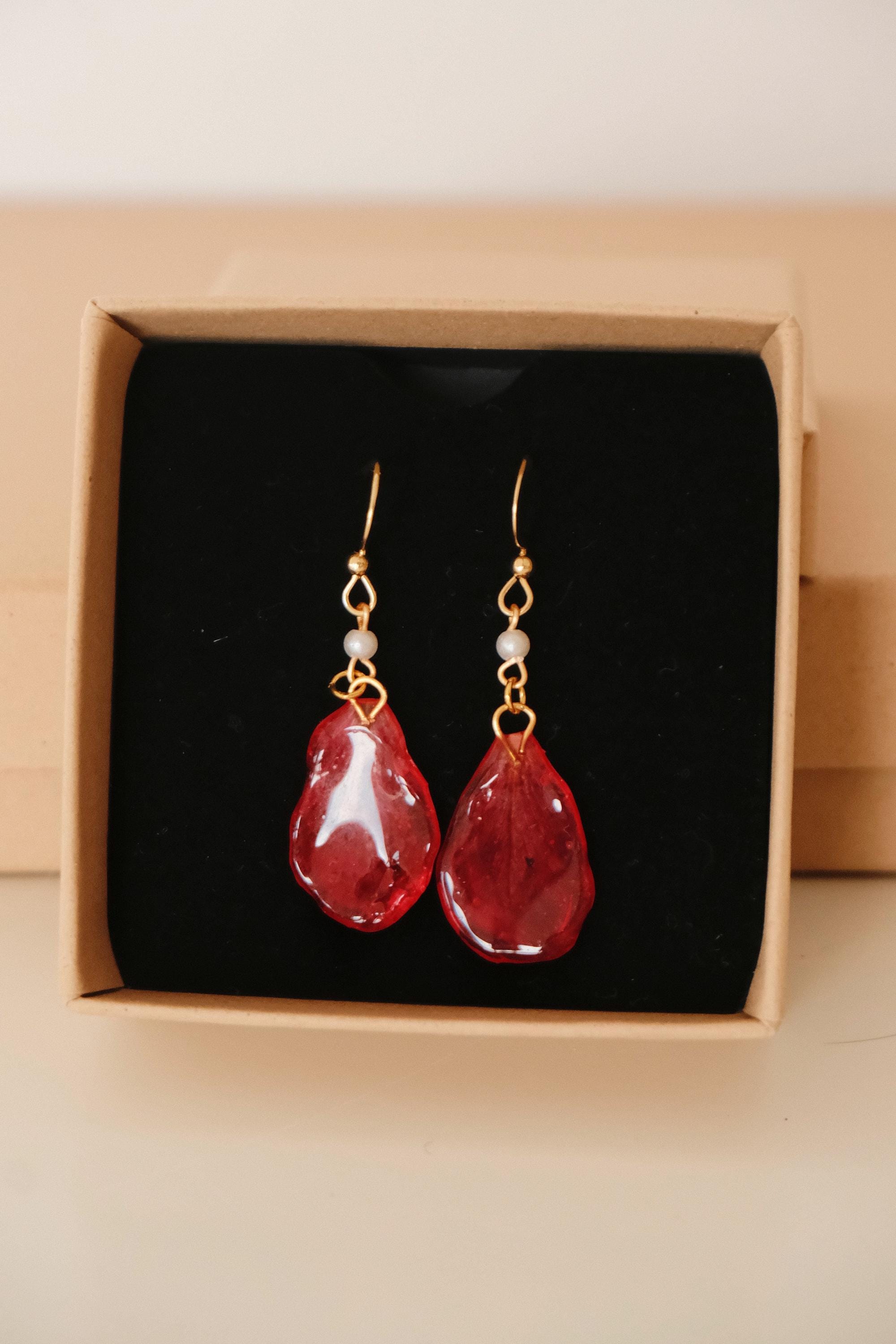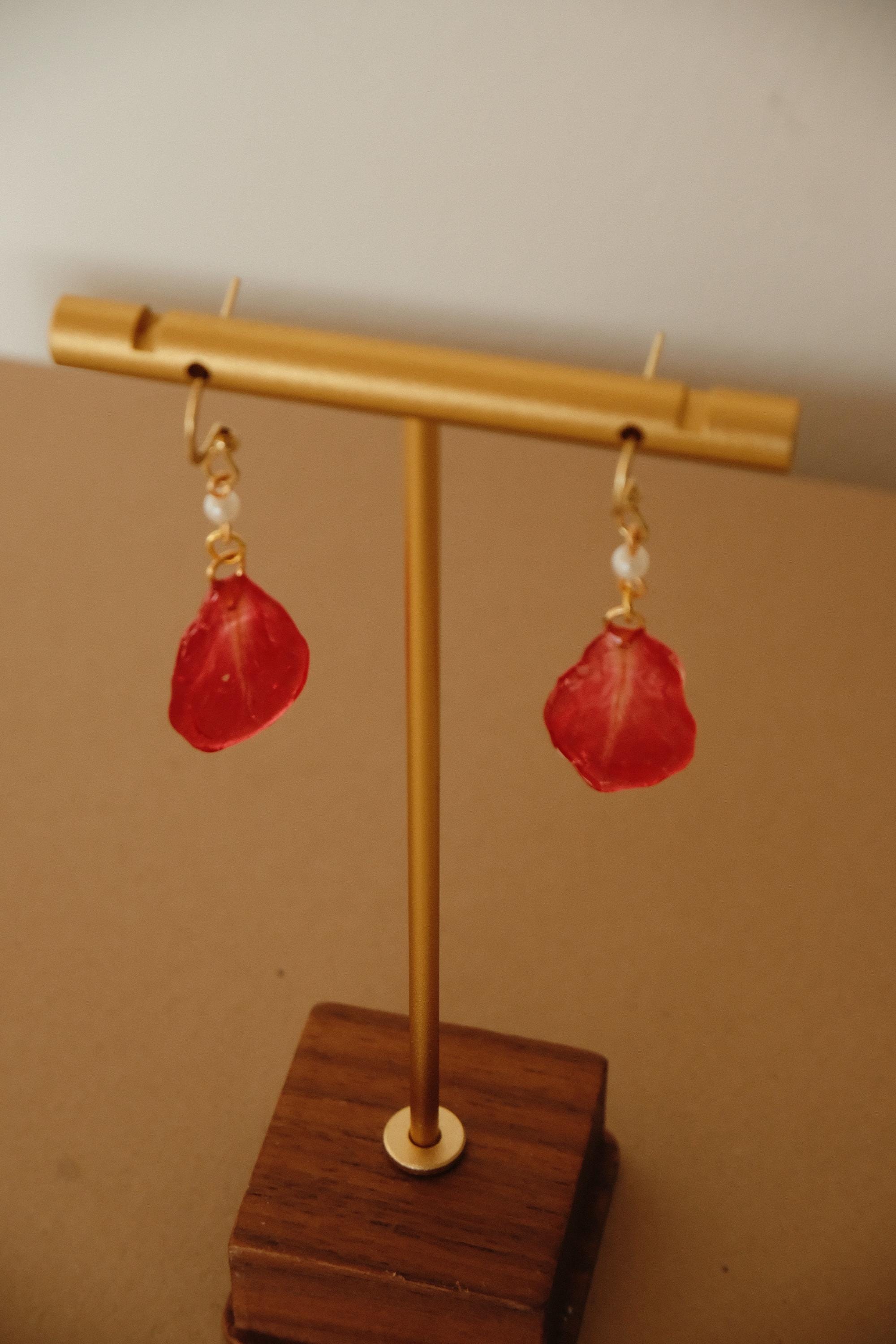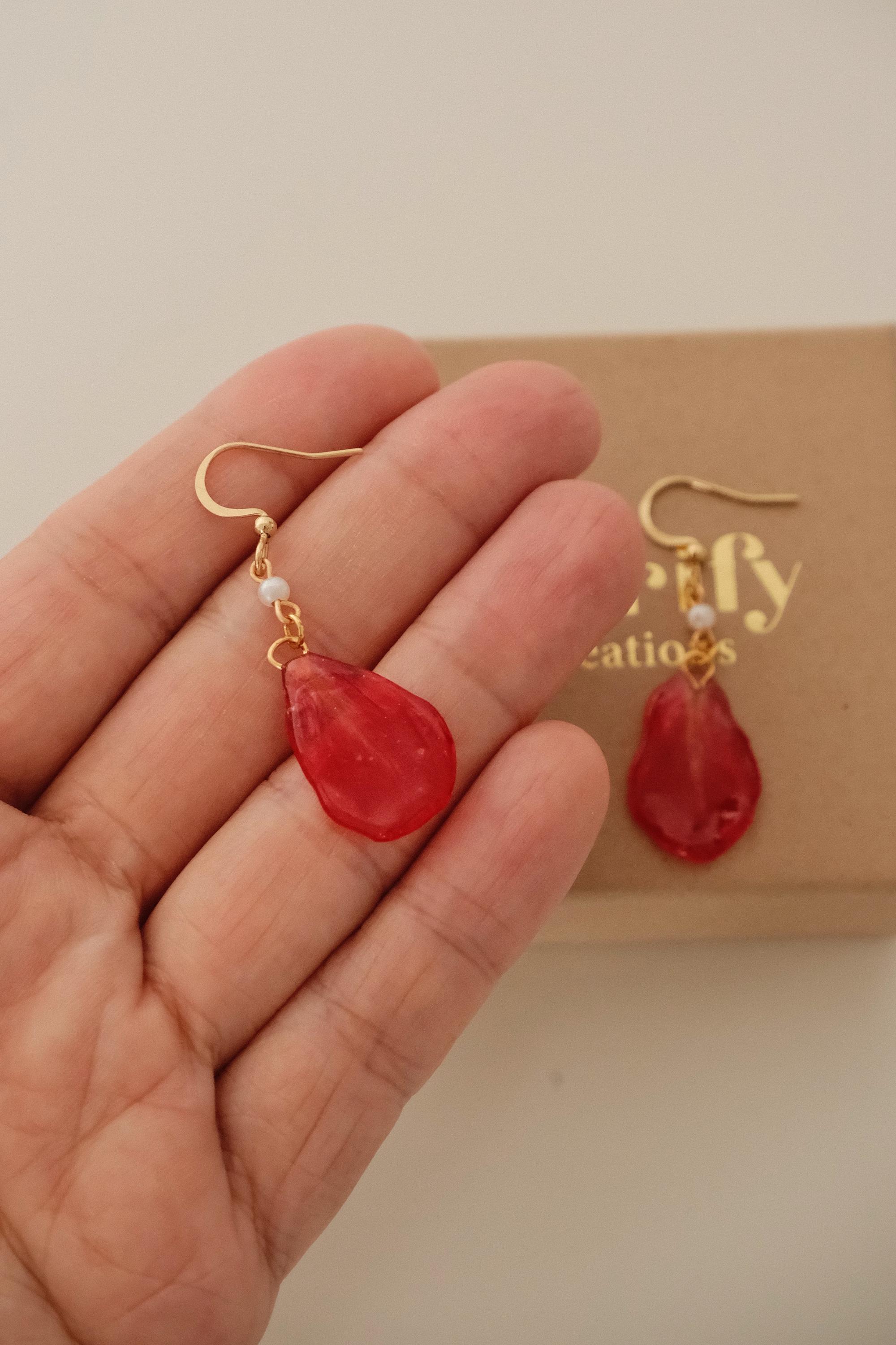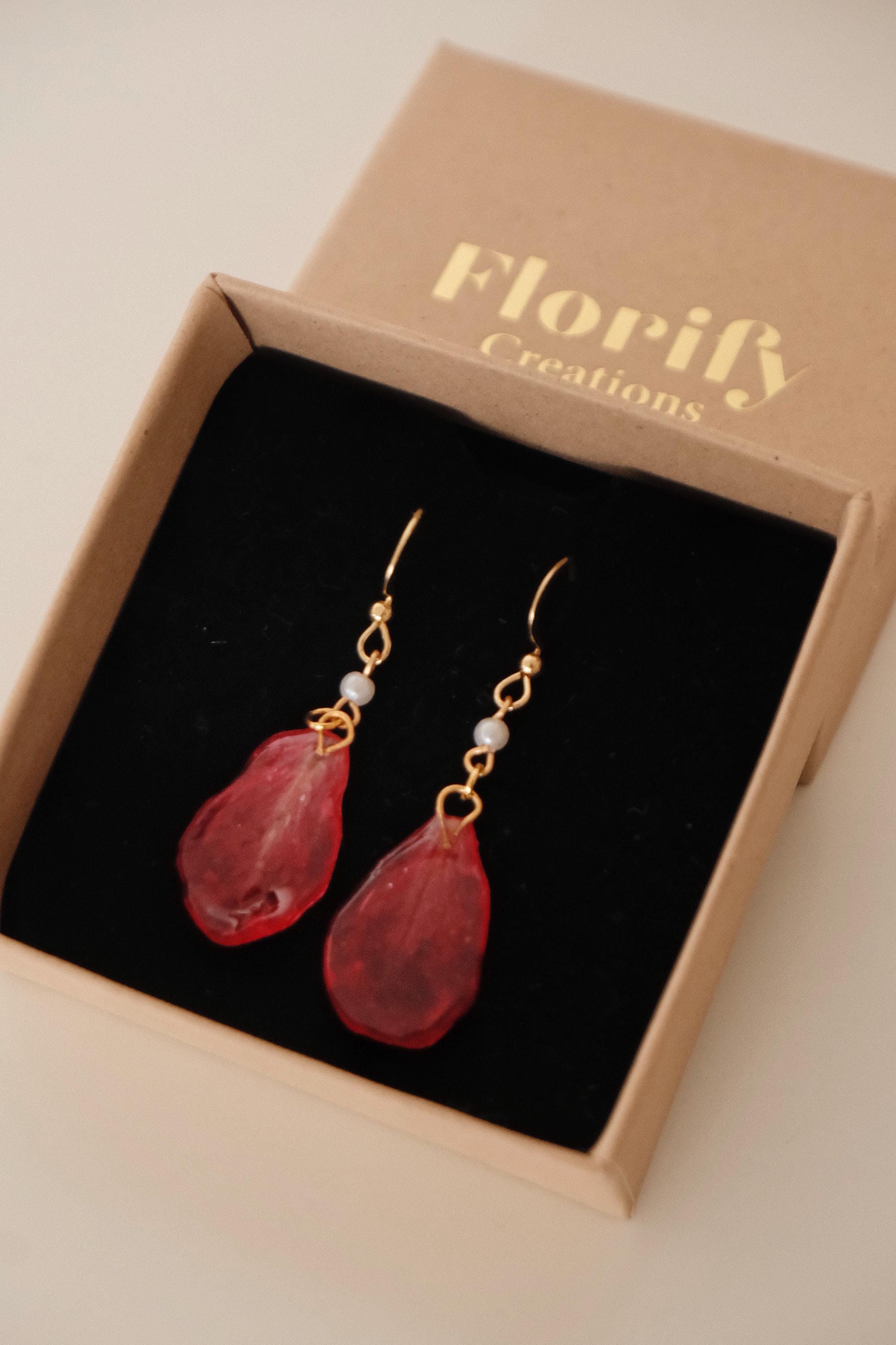 Each petal was carefully dried and preserved in a layer of clear resin, capturing its delicate shape and vibrant red hue. The organic, teardrop-like shape of the petal brings a natural elegance, while the golden hooks and tiny bead detail add a subtle, classic finish.