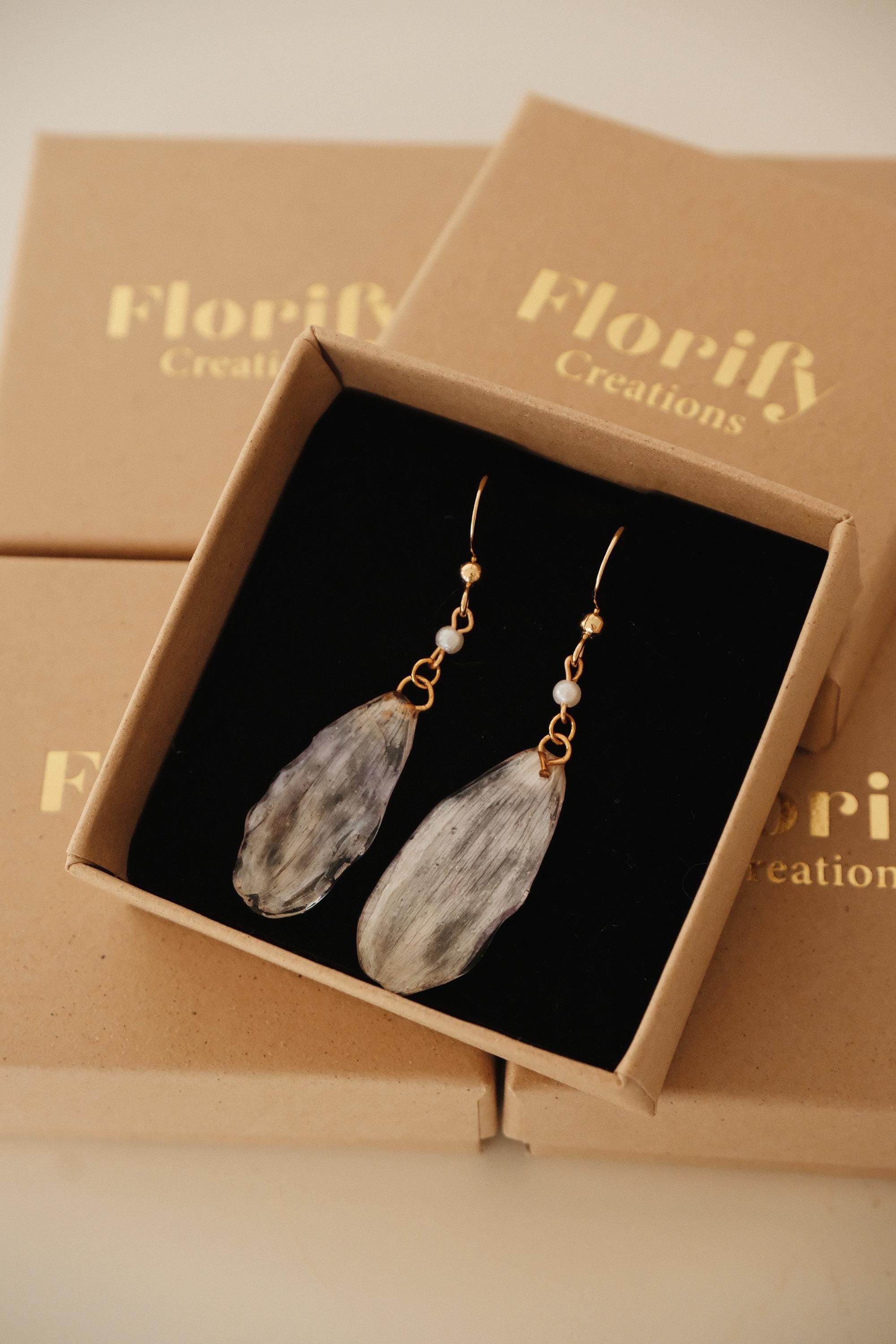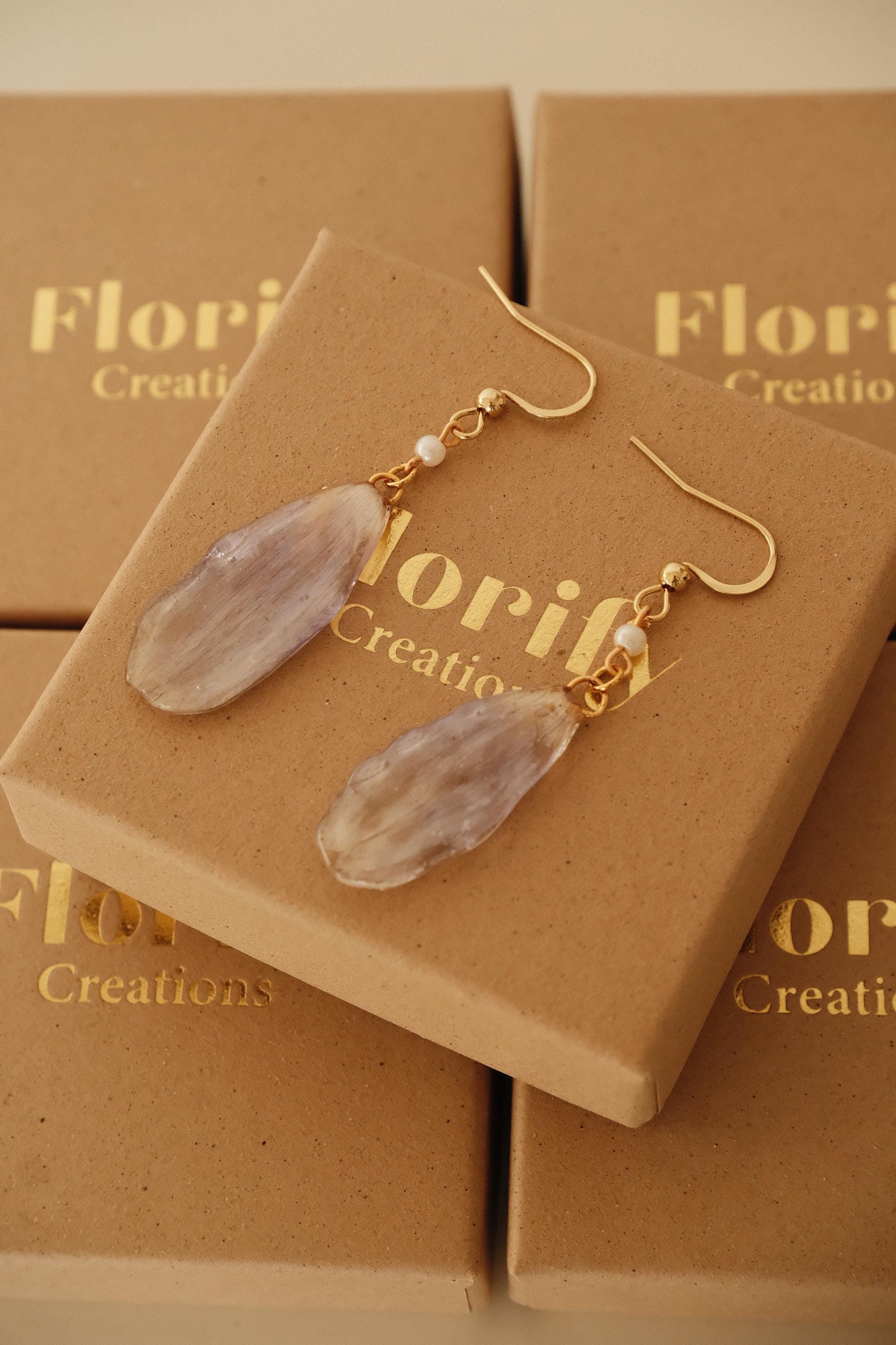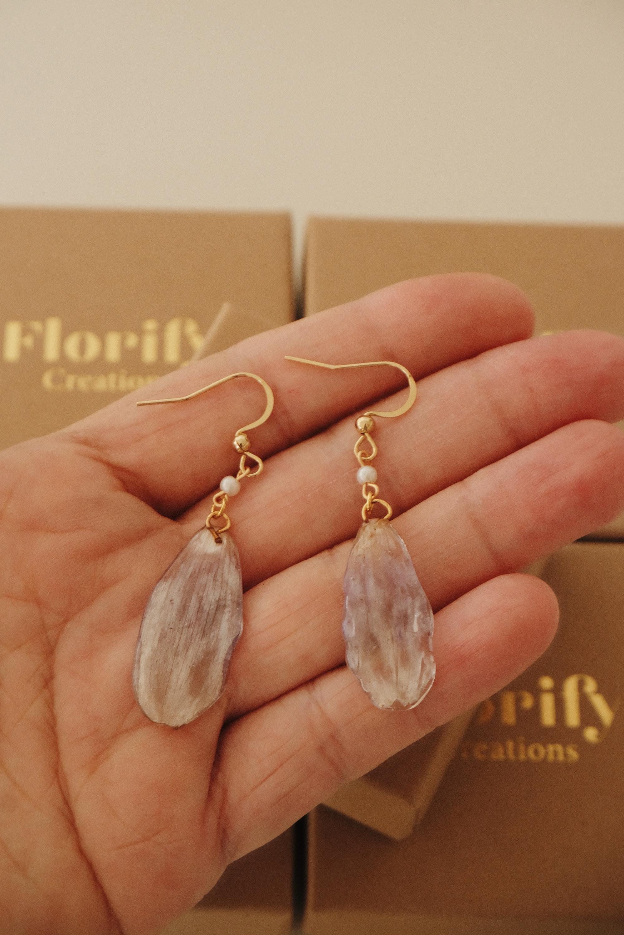 🌿 One of a Kind – Made from Real Cineraria Petals These delicate earrings are handcrafted from genuine cineraria petals, carefully pressed, preserved in resin, and paired with a tiny pearl accent. The natural textures of each petal remain visible—no two are exactly alike.