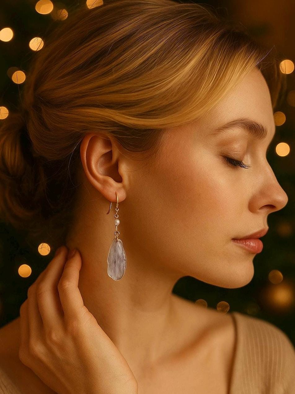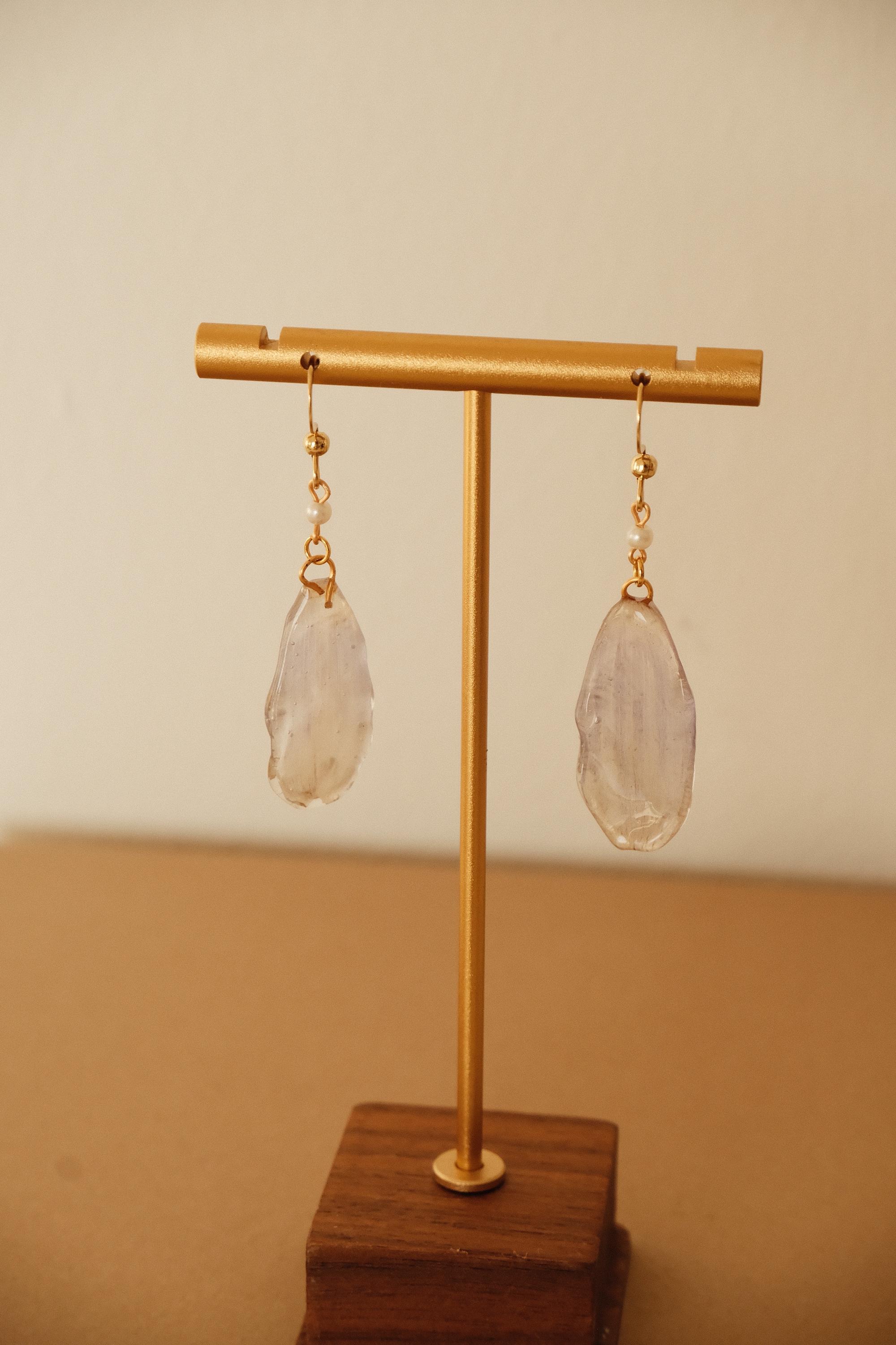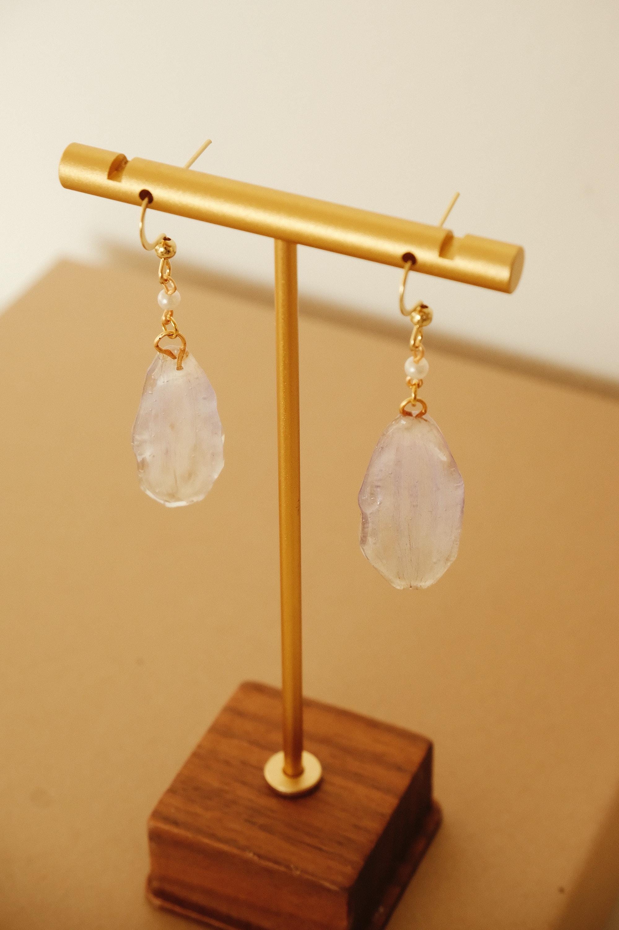 🌿 One of a Kind – Made from Real Cineraria Petals These delicate earrings are handcrafted from genuine cineraria petals, carefully pressed, preserved in resin, and paired with a tiny pearl accent. The natural textures of each petal remain visible—no two are exactly alike.