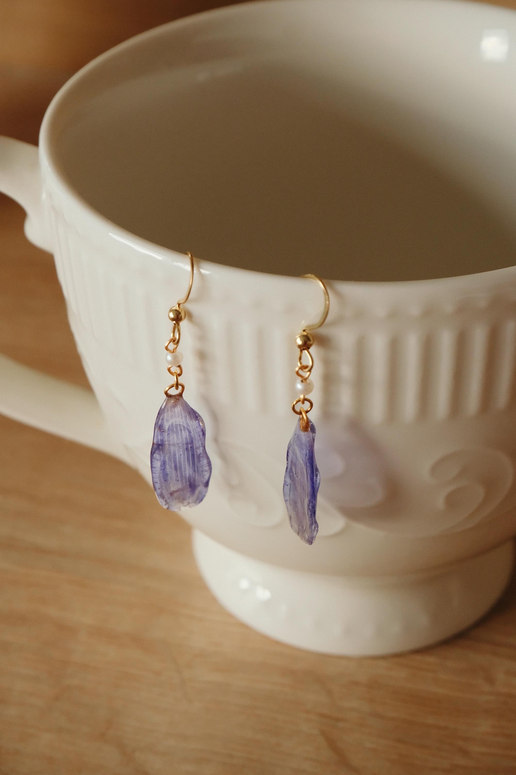 These delicate earrings are handcrafted from genuine cineraria petals, carefully pressed, preserved in resin, and paired with a tiny pearl accent. The natural textures of each petal remain visible—no two are exactly alike.
