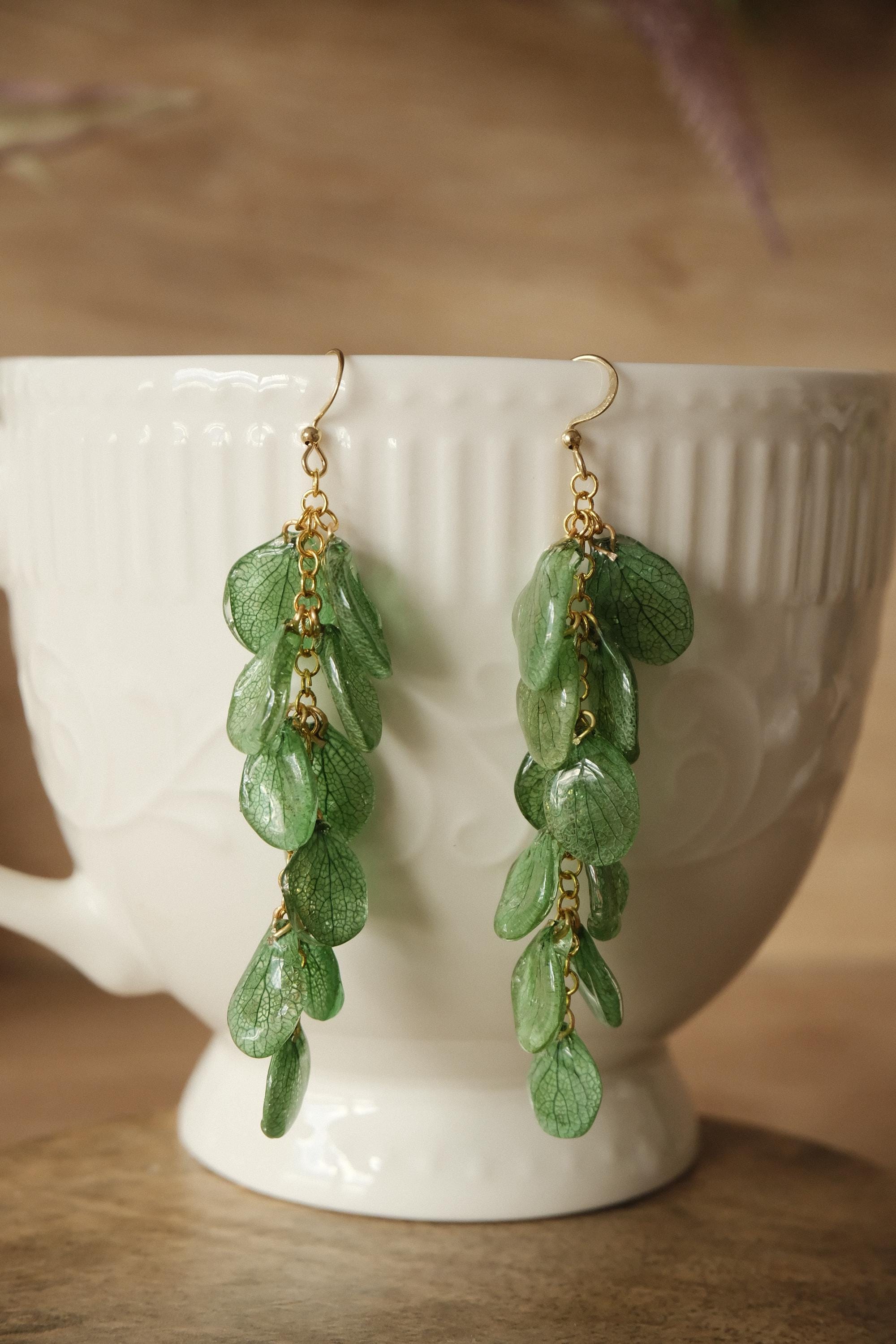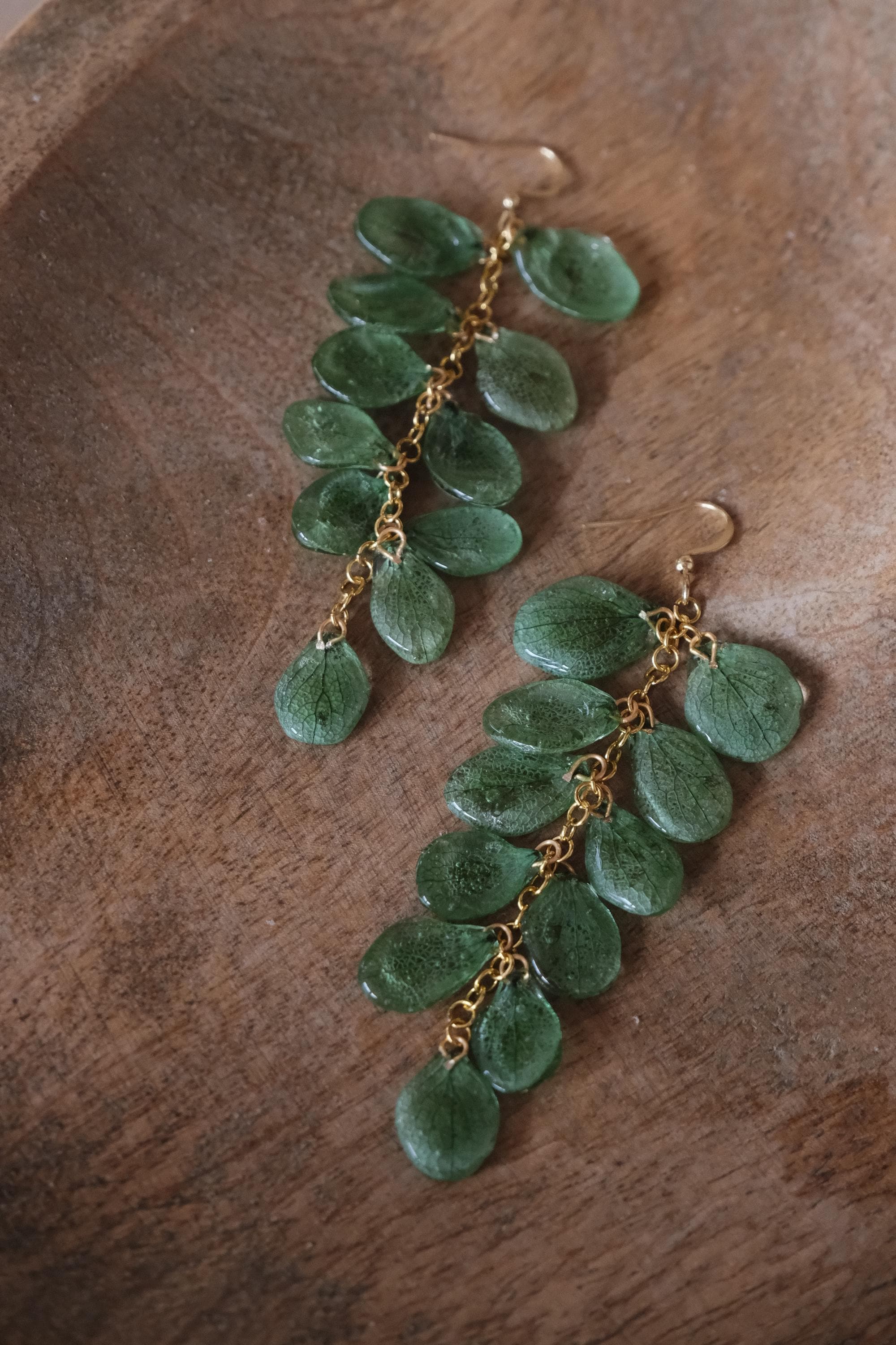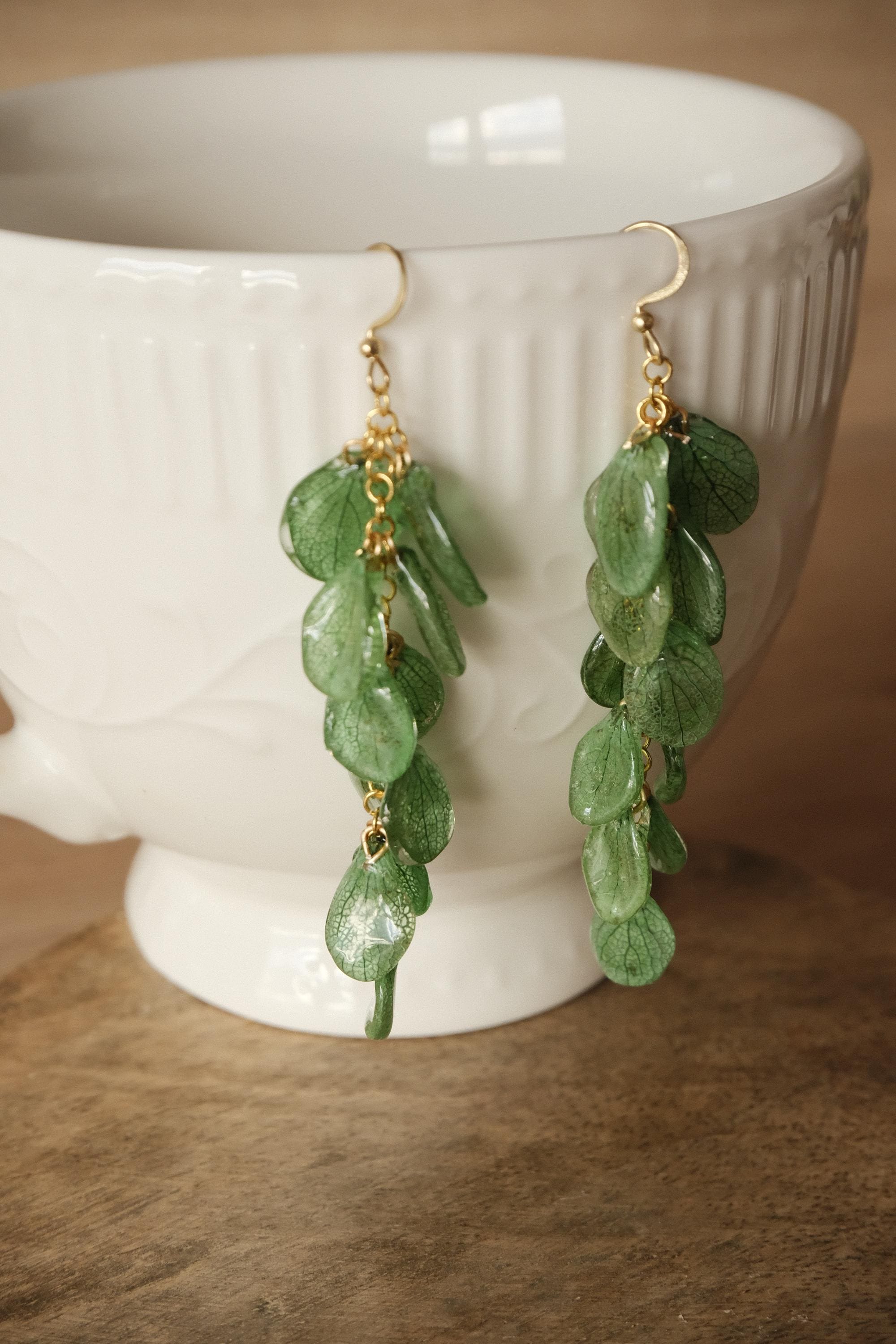 These delicate earrings are made from real purple hydrangea petals, carefully preserved in resin to keep their natural texture and color. Each earring features 11 translucent petals, making a total of 22 for the pair. The petals are hand-arranged and strung with gold-tone findings, creating a graceful, cascading shape.