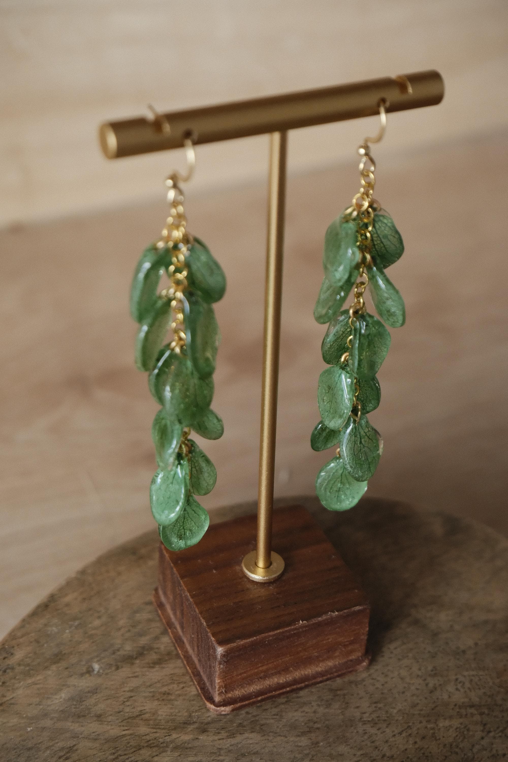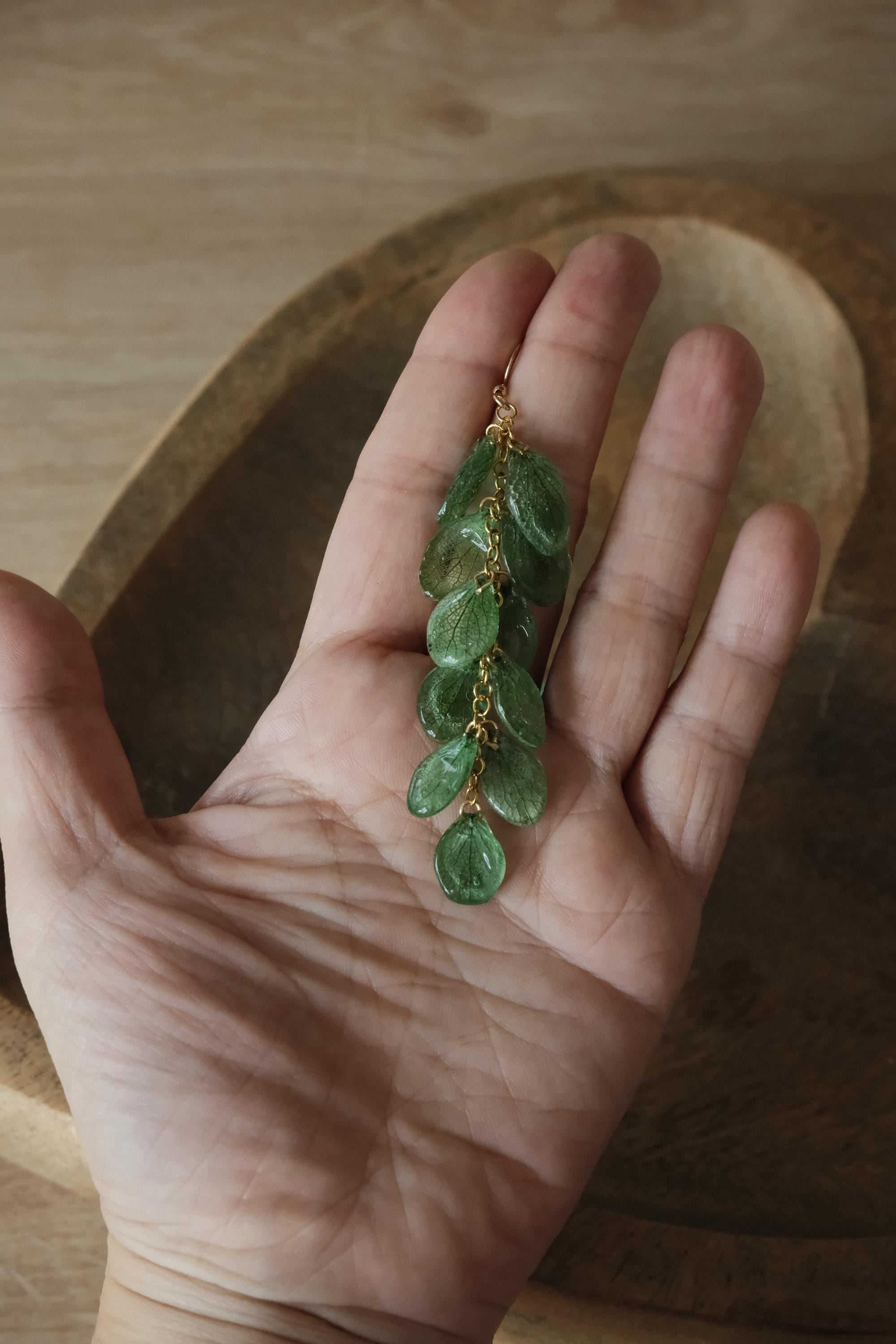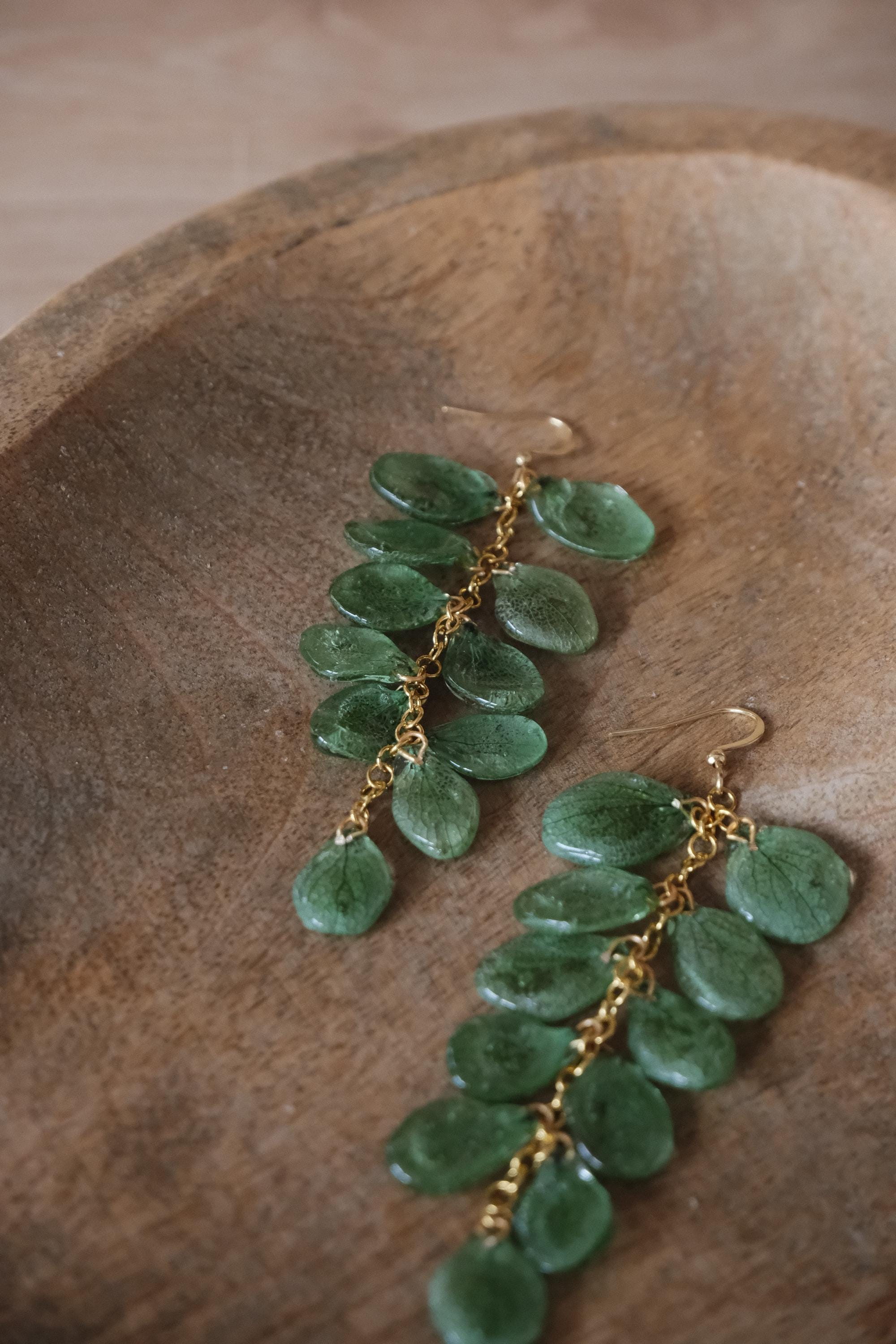 These delicate earrings are made from real purple hydrangea petals, carefully preserved in resin to keep their natural texture and color. Each earring features 11 translucent petals, making a total of 22 for the pair. The petals are hand-arranged and strung with gold-tone findings, creating a graceful, cascading shape.