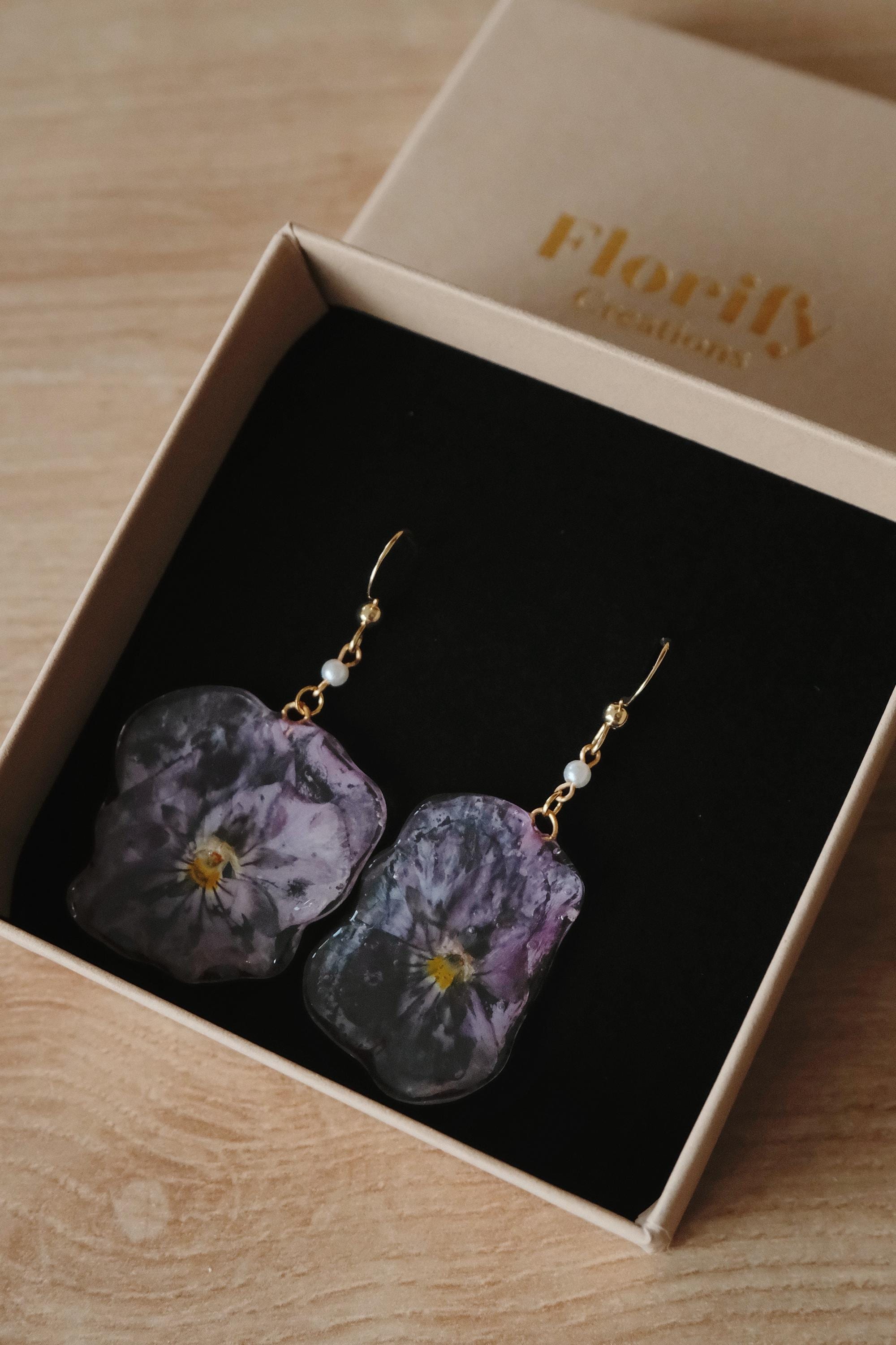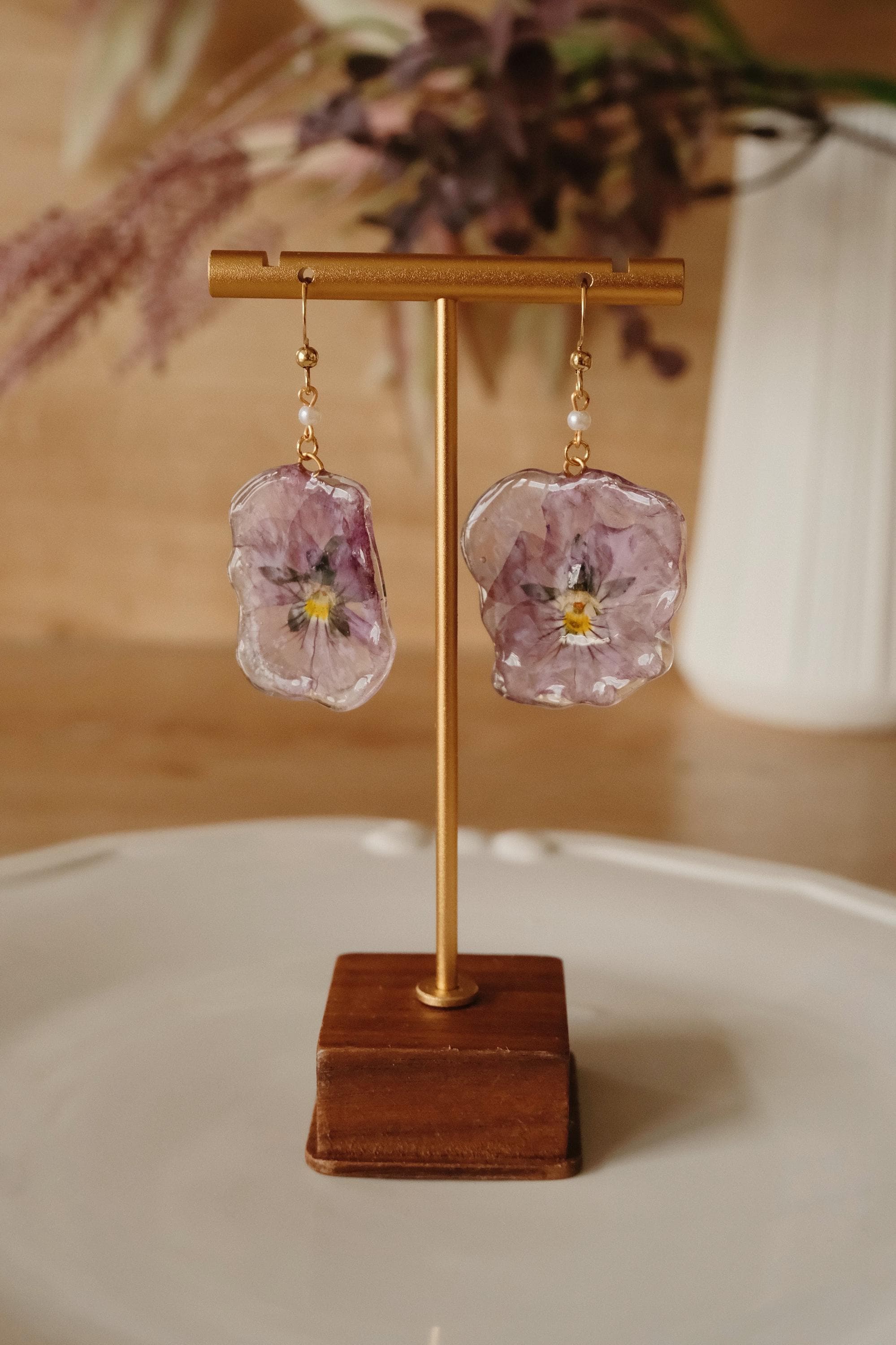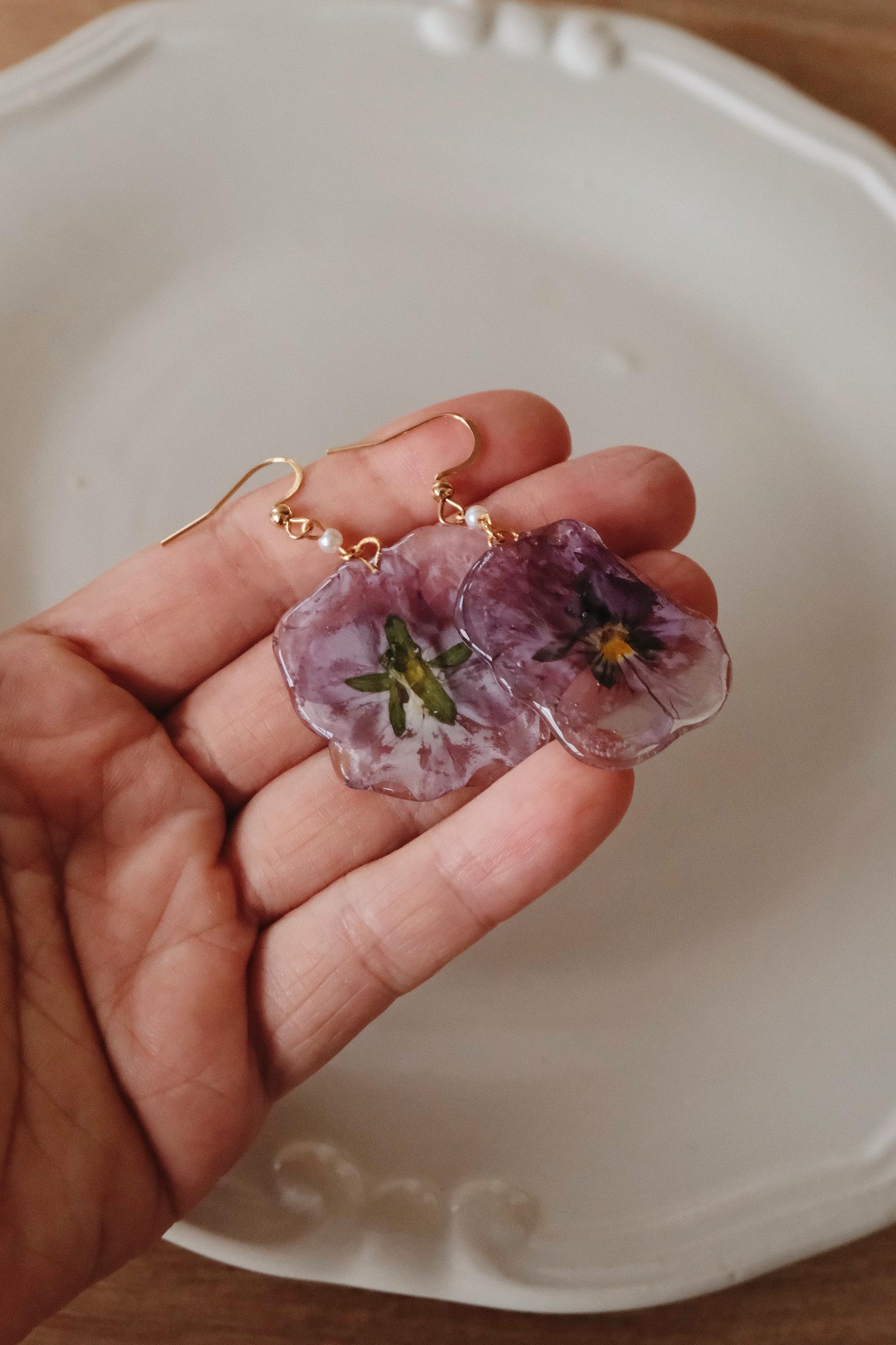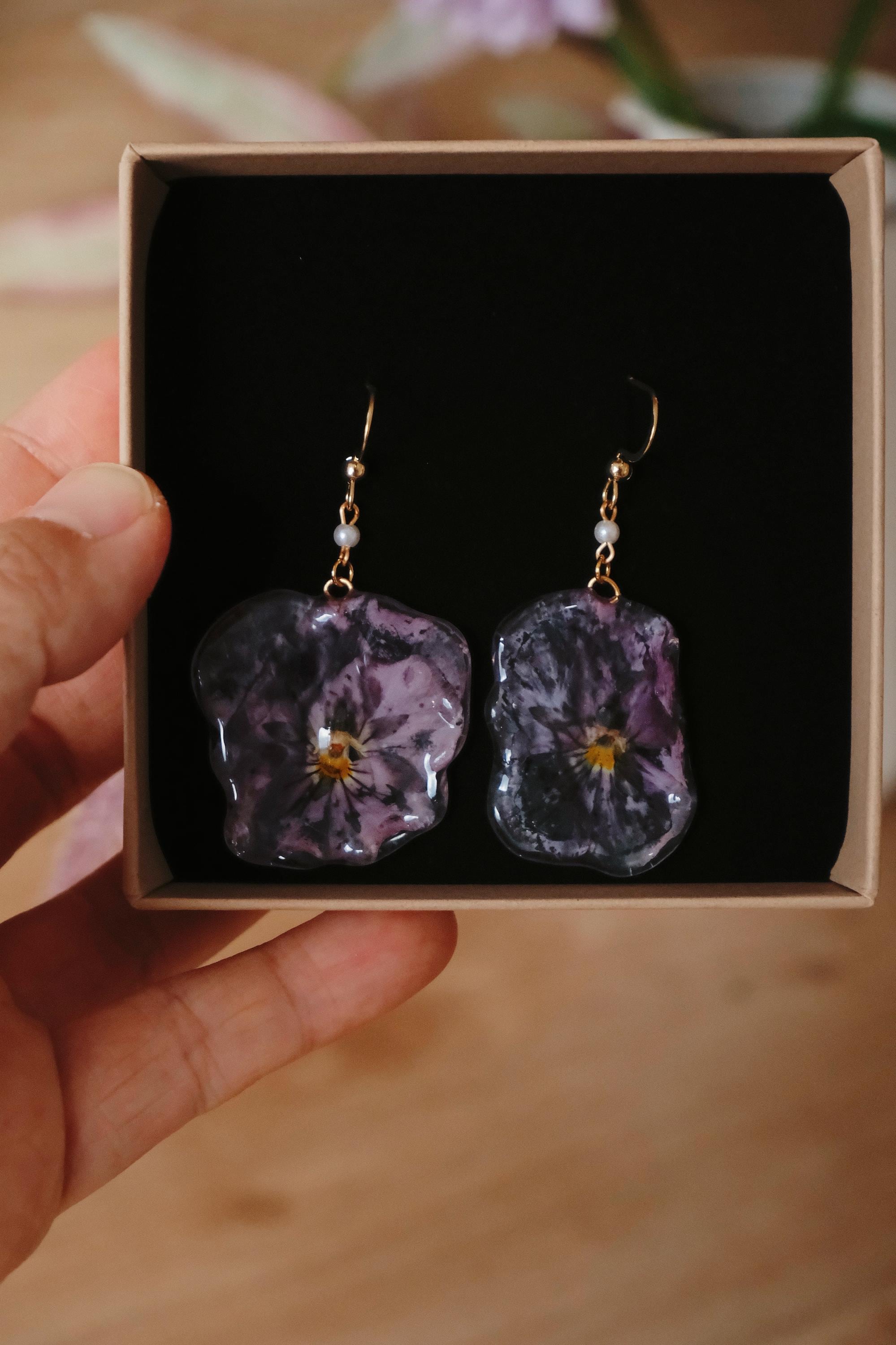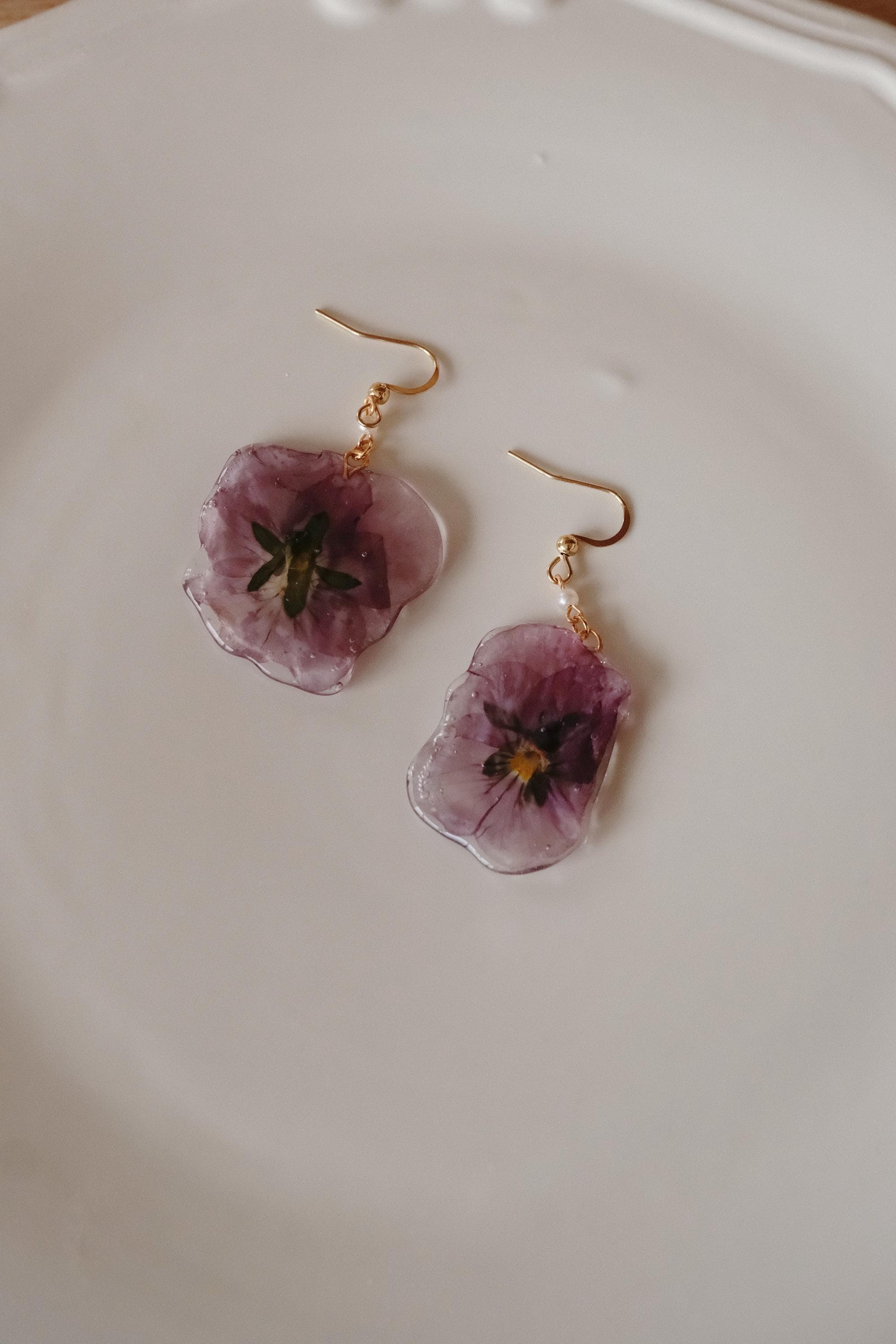 ✨ Features • Real pansy petals (pressed and preserved) • Handcrafted with UV resin • Stainless steel hooks — comfortable & hypoallergenic • Accented with small pearl-like beads for extra elegance • Lightweight for daily wear • A truly unique pair — only one available