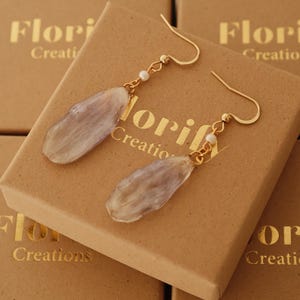 Each pair is completely one-of-a-kind — no molds, no duplicates, just nature’s own shapes. Lightweight, translucent, and full of gentle movement, they catch the light beautifully and add a soft botanical touch to any outfit.