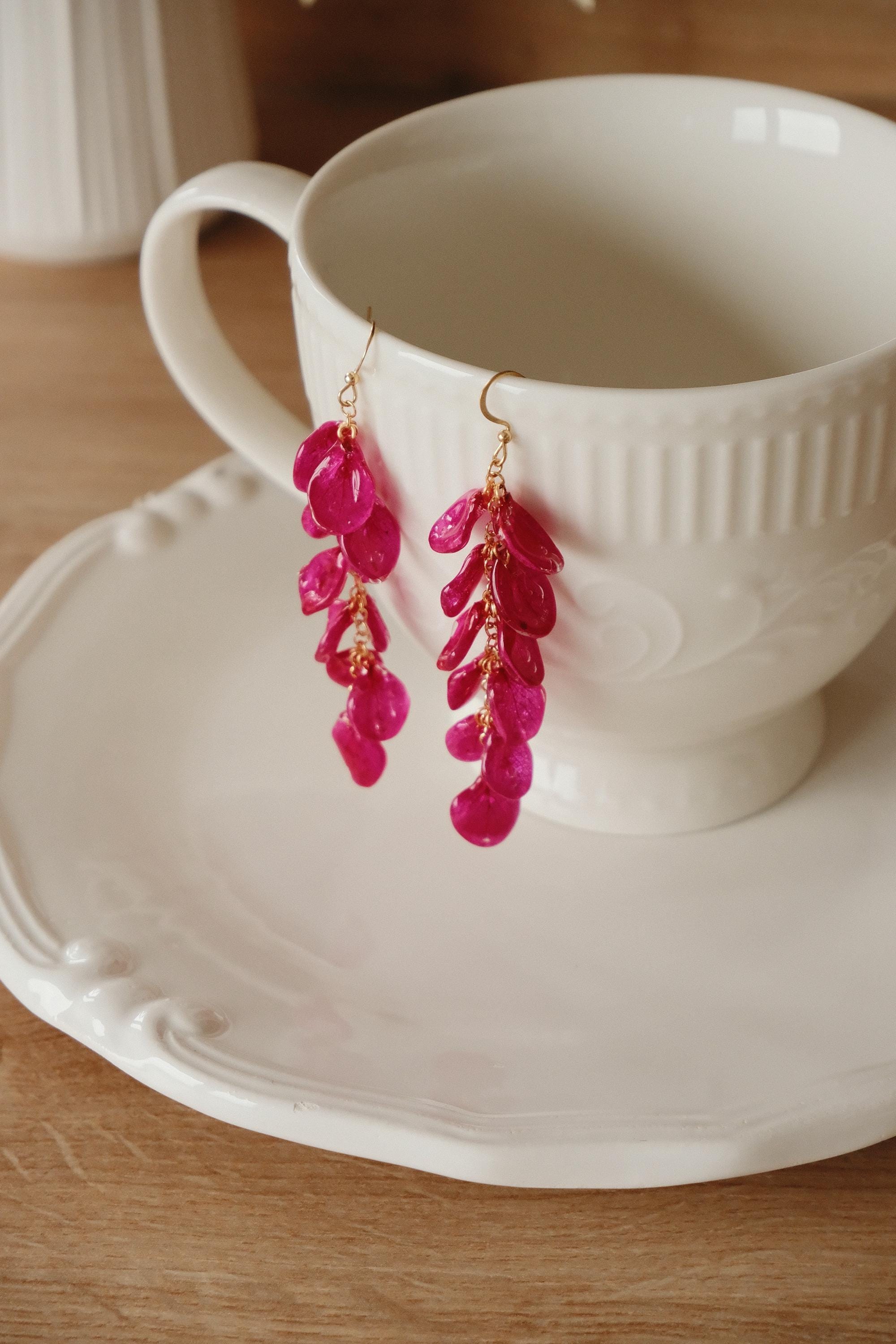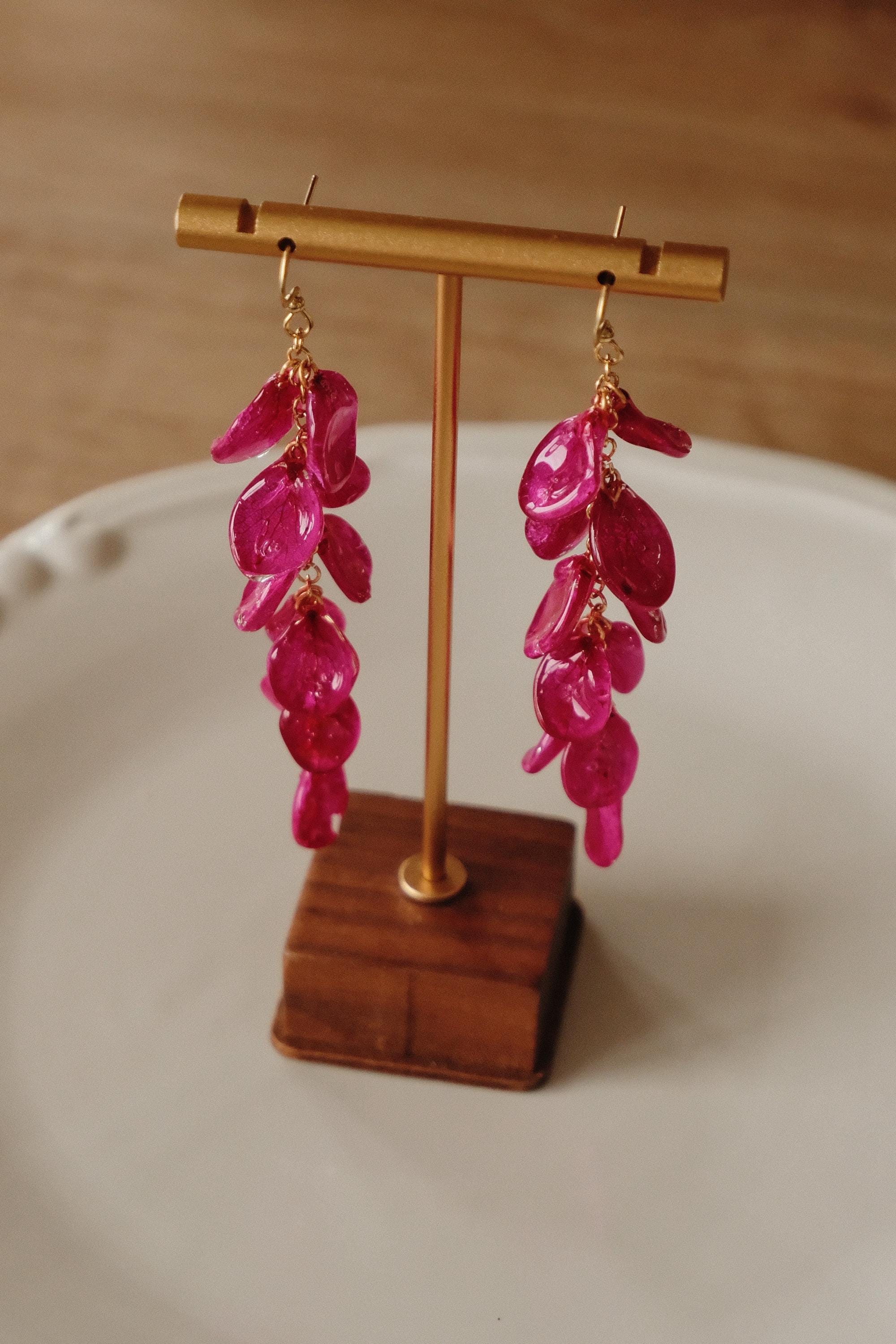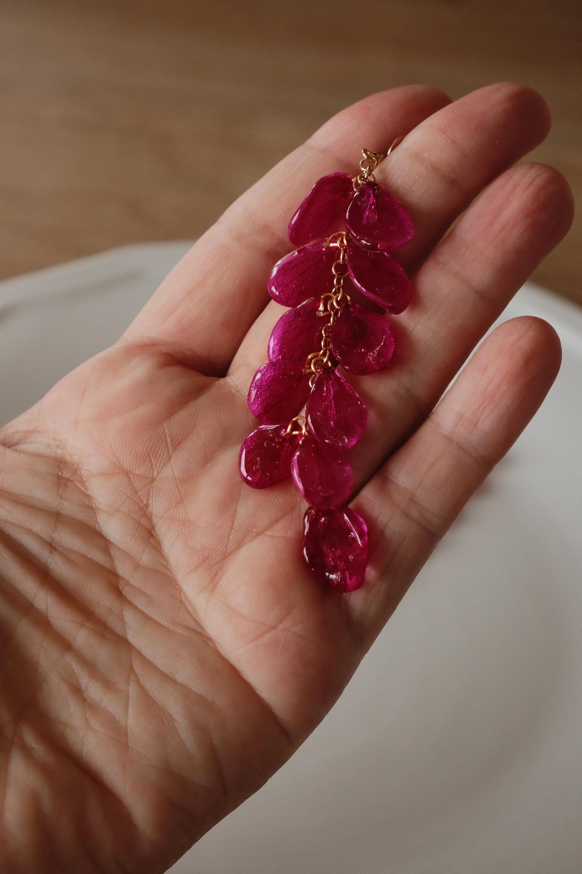 These delicate dangle earrings are handmade with real hydrangea petals, each carefully preserved in crystal-clear resin to highlight their natural shape and intricate vein patterns. The cascading design gives them elegant movement and a striking presence – lightweight, organic, and beautifully detailed.