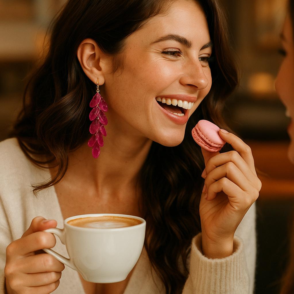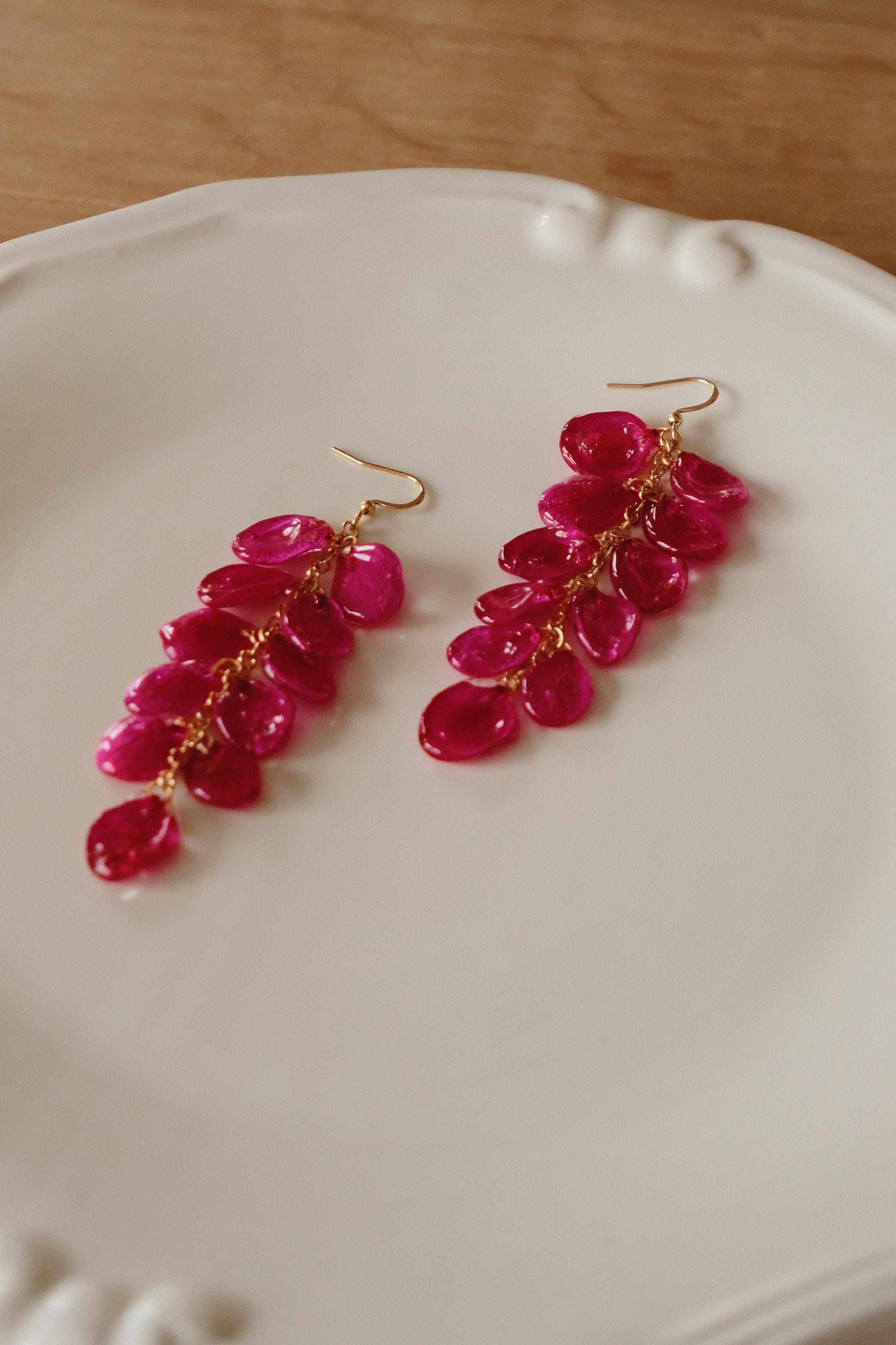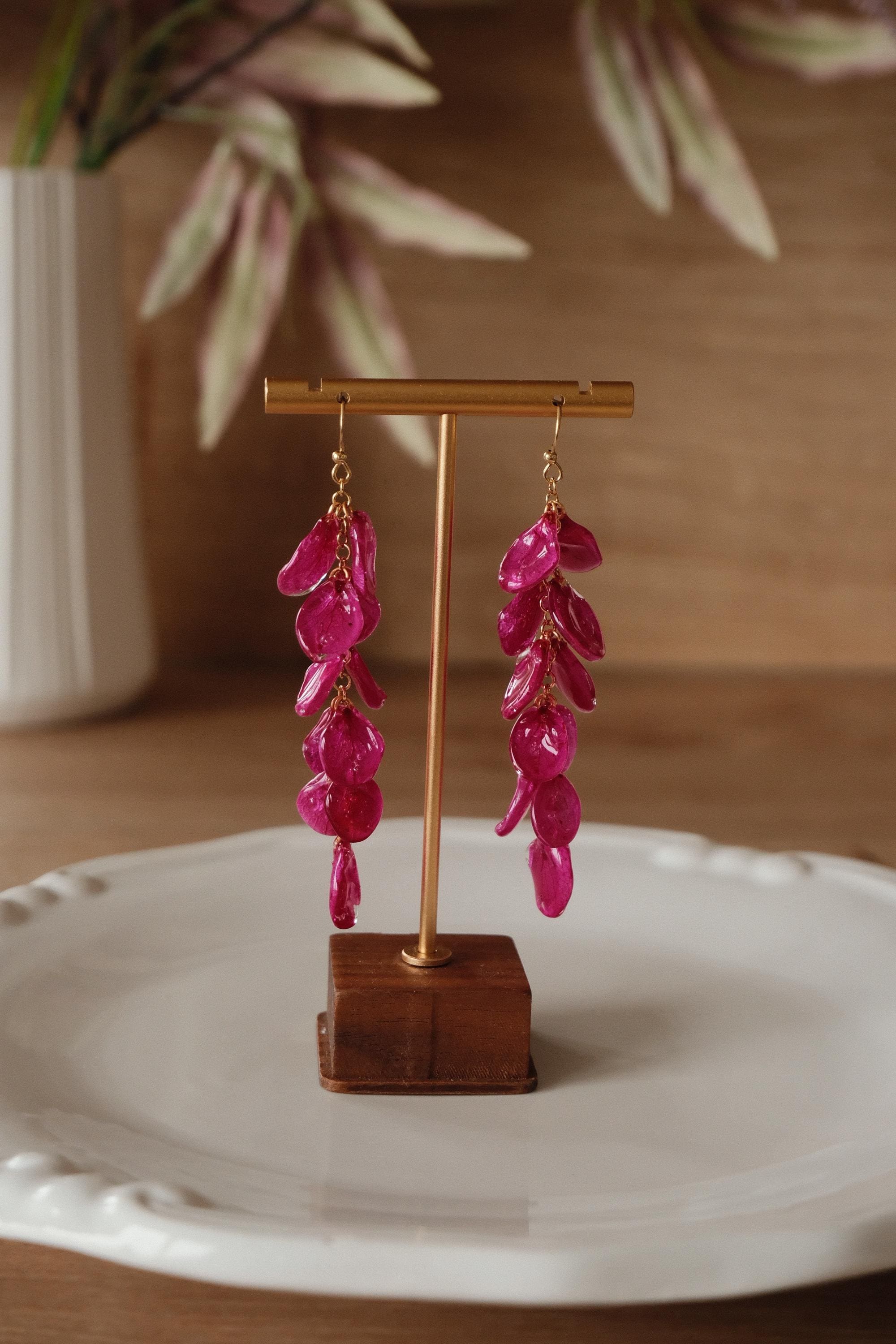These delicate dangle earrings are handmade with real hydrangea petals, each carefully preserved in crystal-clear resin to highlight their natural shape and intricate vein patterns. The cascading design gives them elegant movement and a striking presence – lightweight, organic, and beautifully detailed.