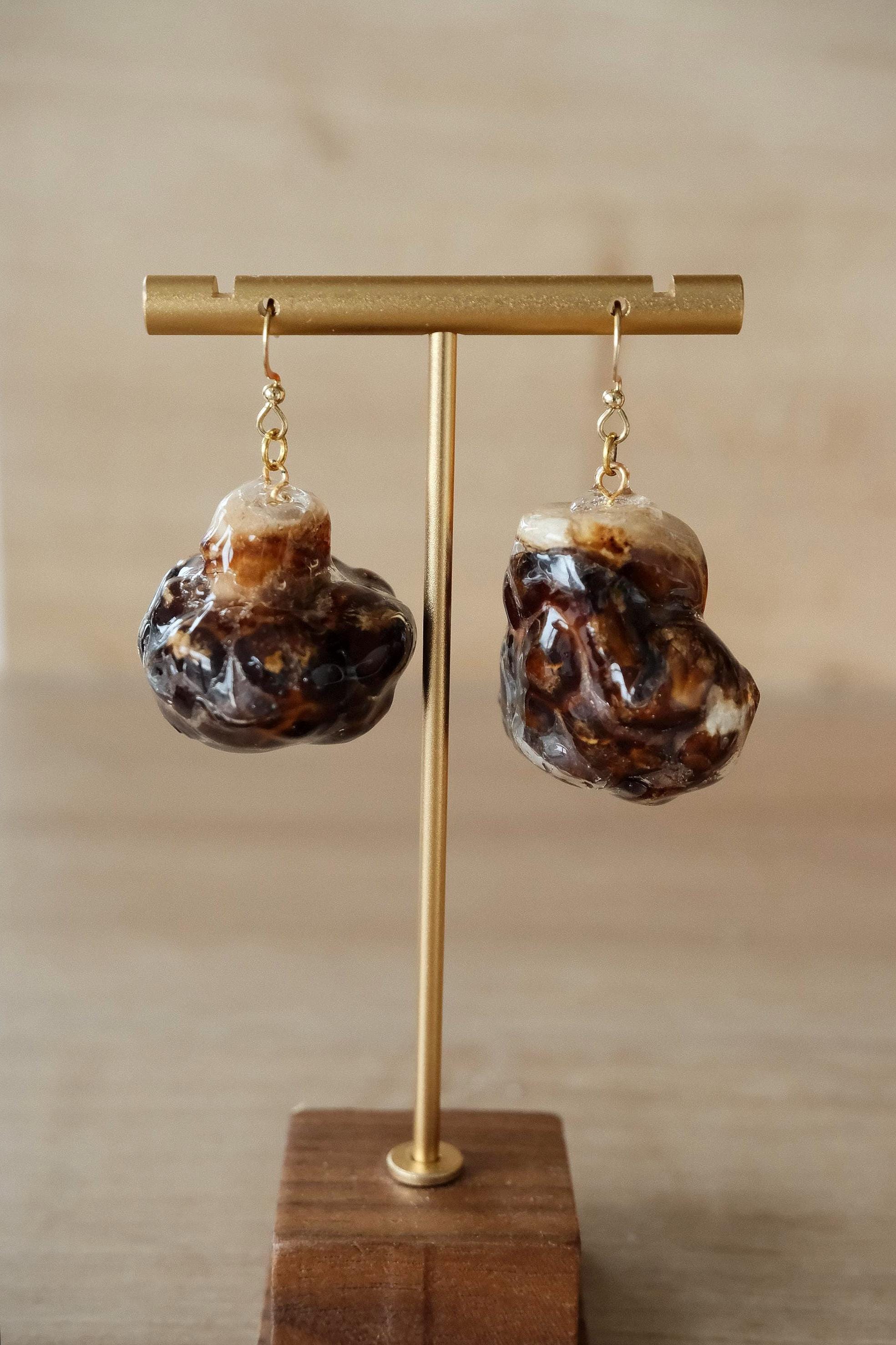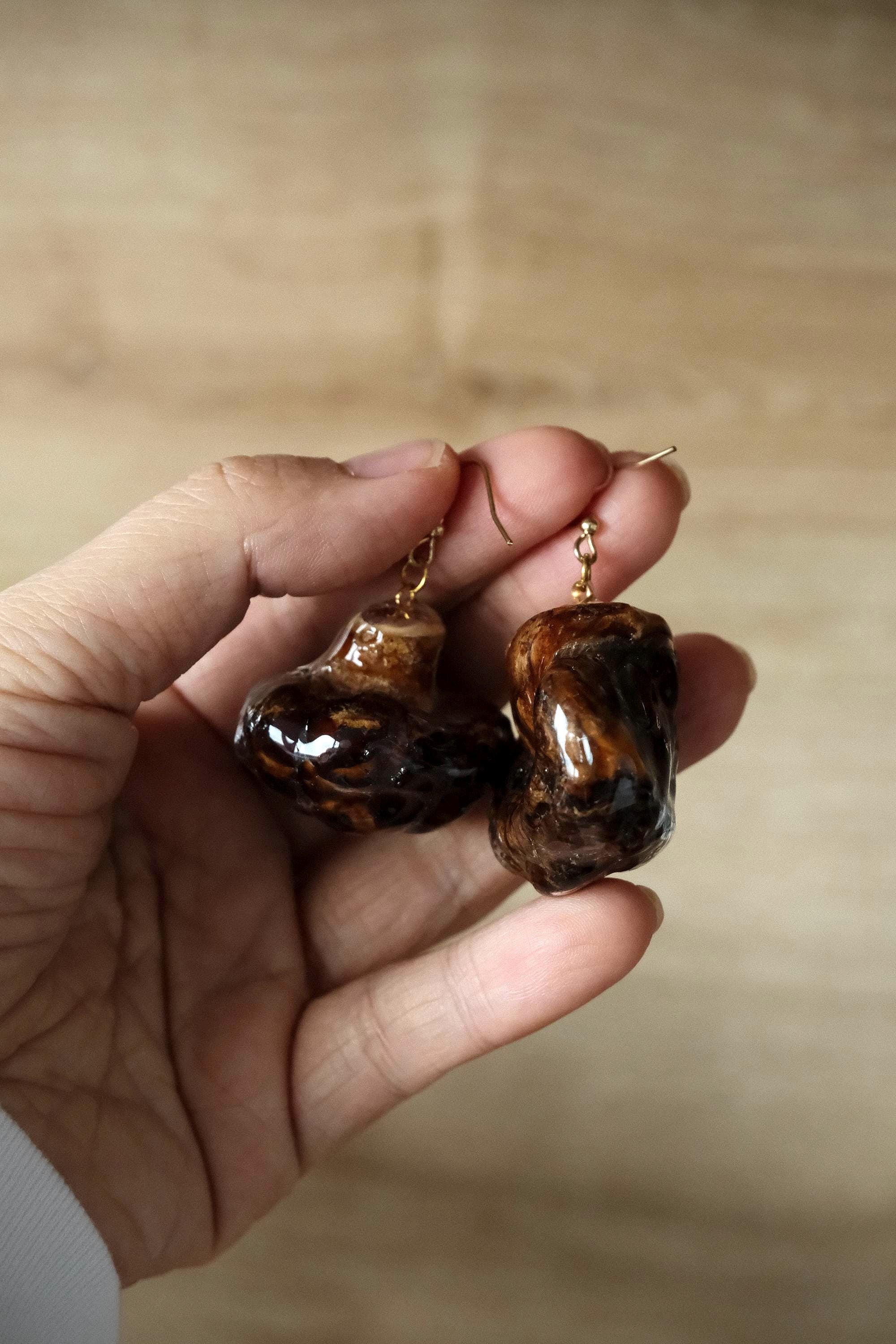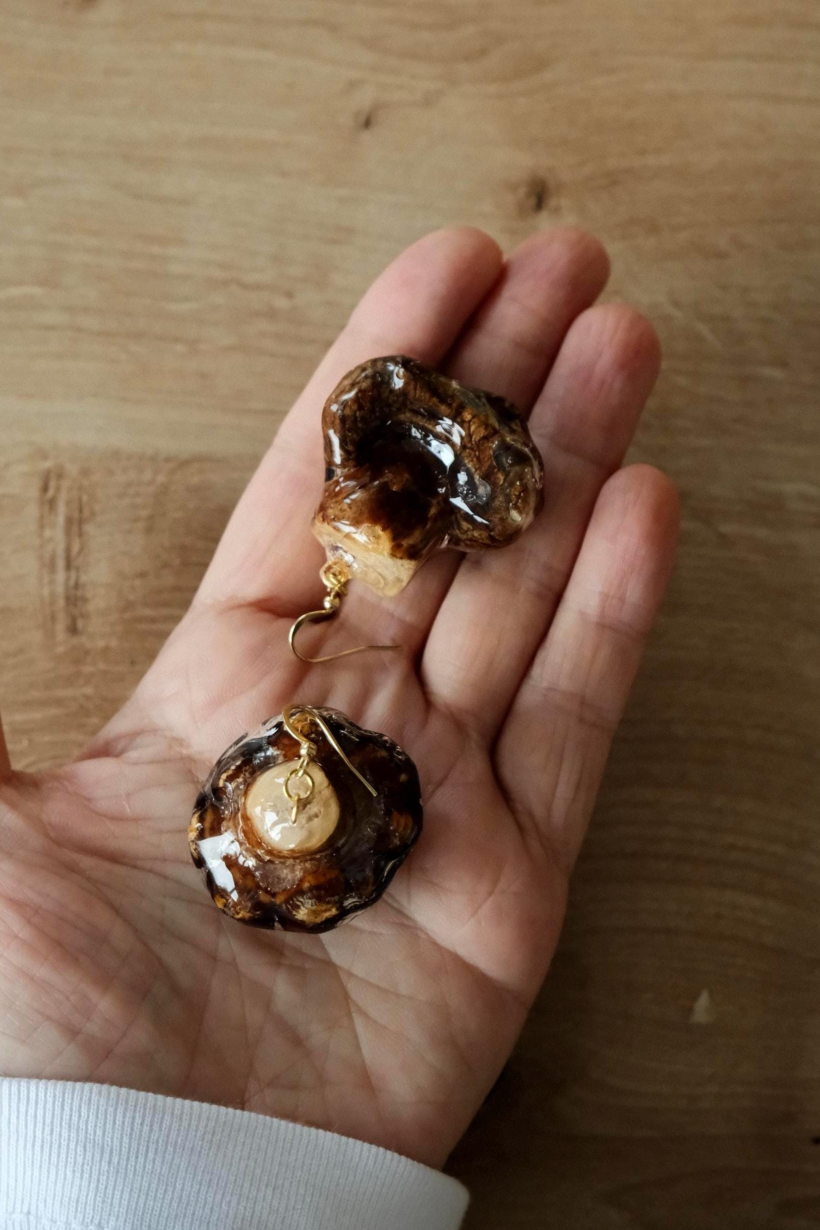 These one-of-a-kind earrings are made from real dried mushrooms, carefully preserved in resin to retain their natural shape and rich earthy tones. Each piece is handcrafted with love and patience, transforming nature's quirky gifts into wearable art.