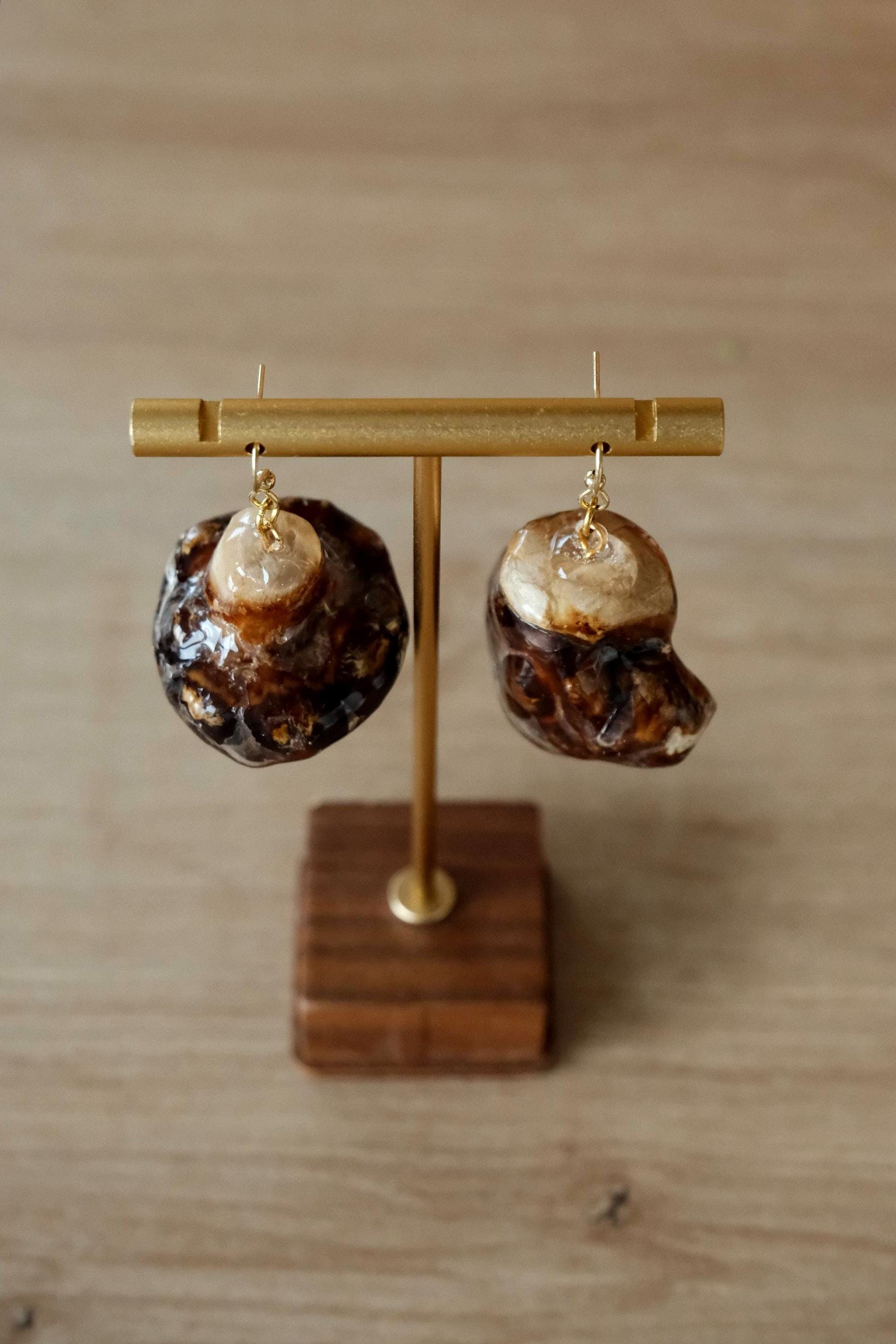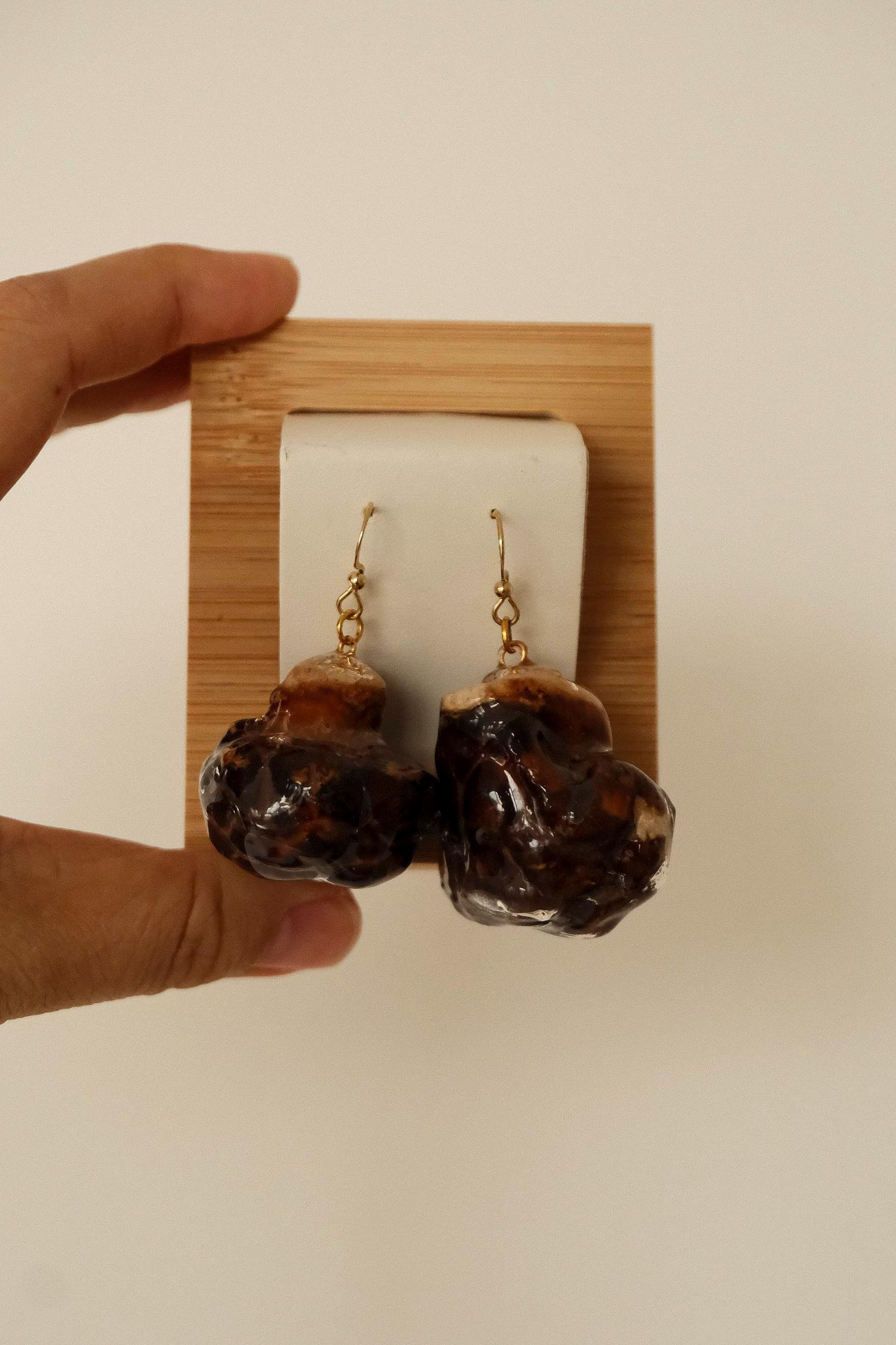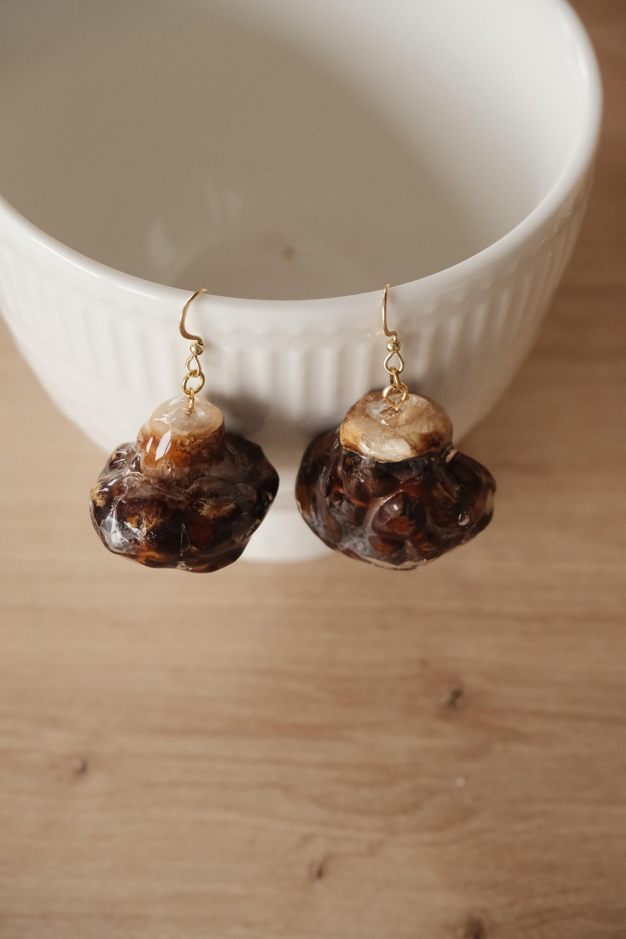 These one-of-a-kind earrings are made from real dried mushrooms, carefully preserved in resin to retain their natural shape and rich earthy tones. Each piece is handcrafted with love and patience, transforming nature's quirky gifts into wearable art.