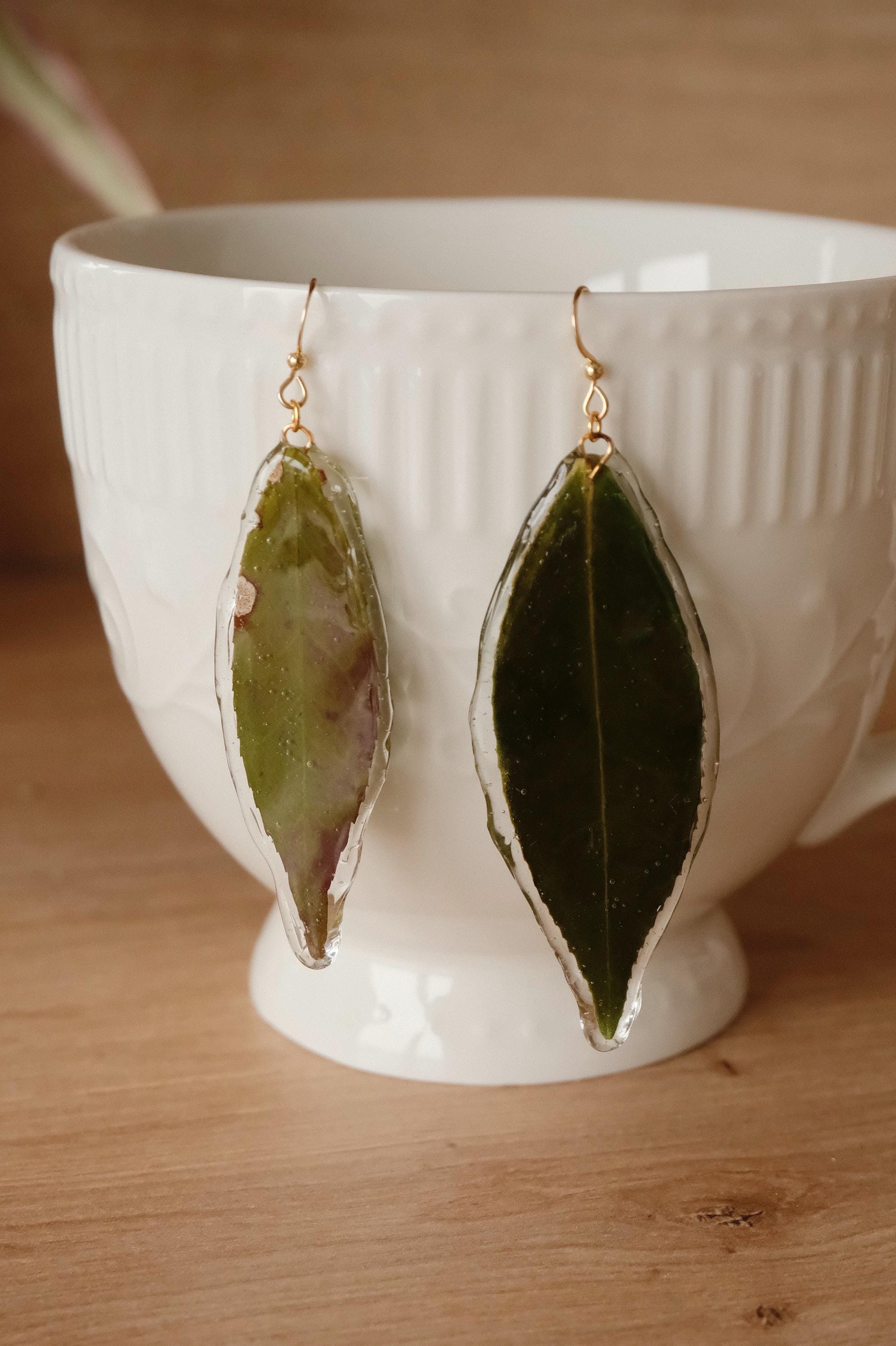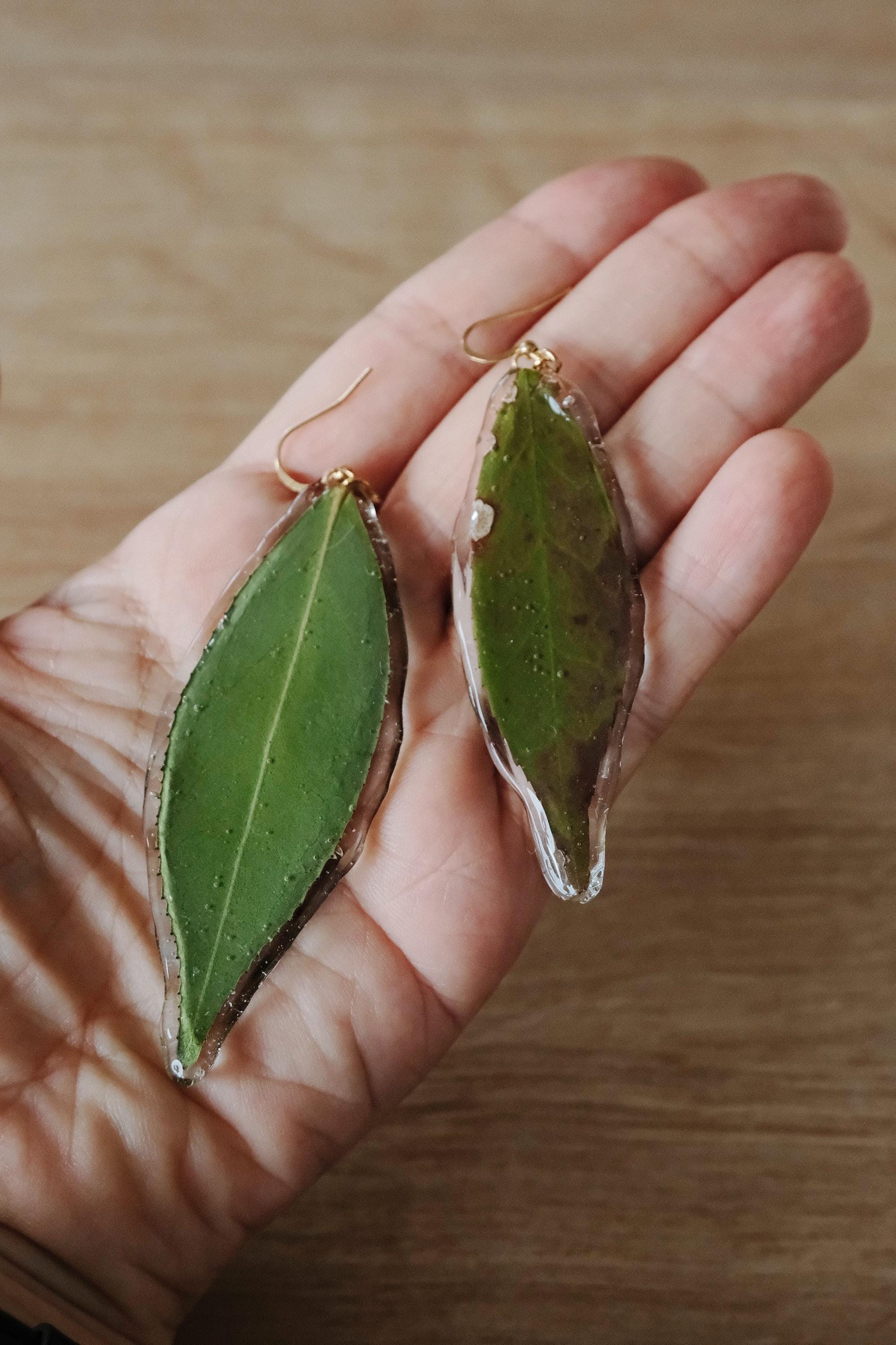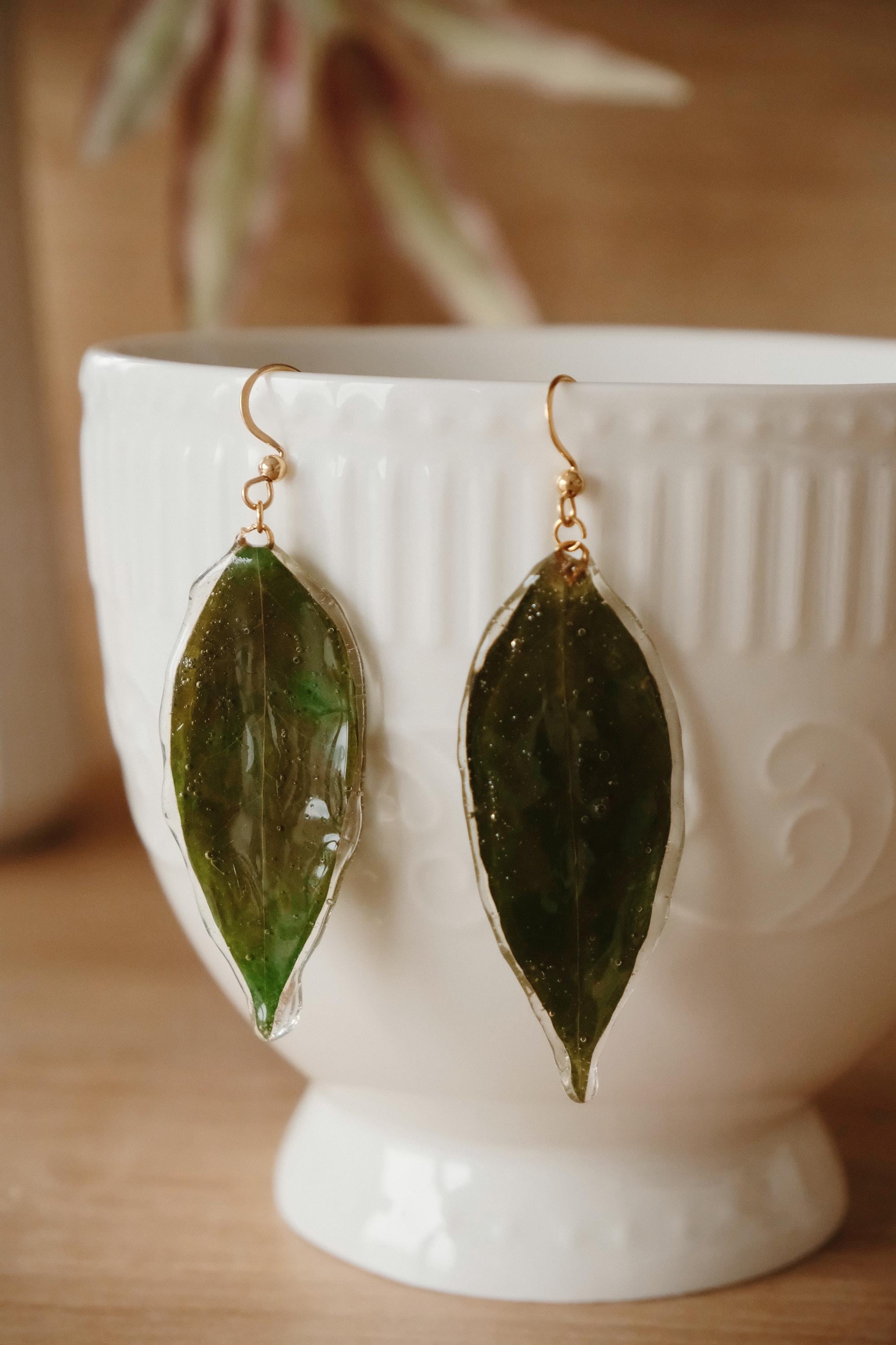 A pair of unique statement earrings made from real leaves, preserved in resin to capture the beauty of nature in every detail. Each leaf is hand-picked and coated with crystal-clear resin, preserving its organic texture and vibrant green hue.