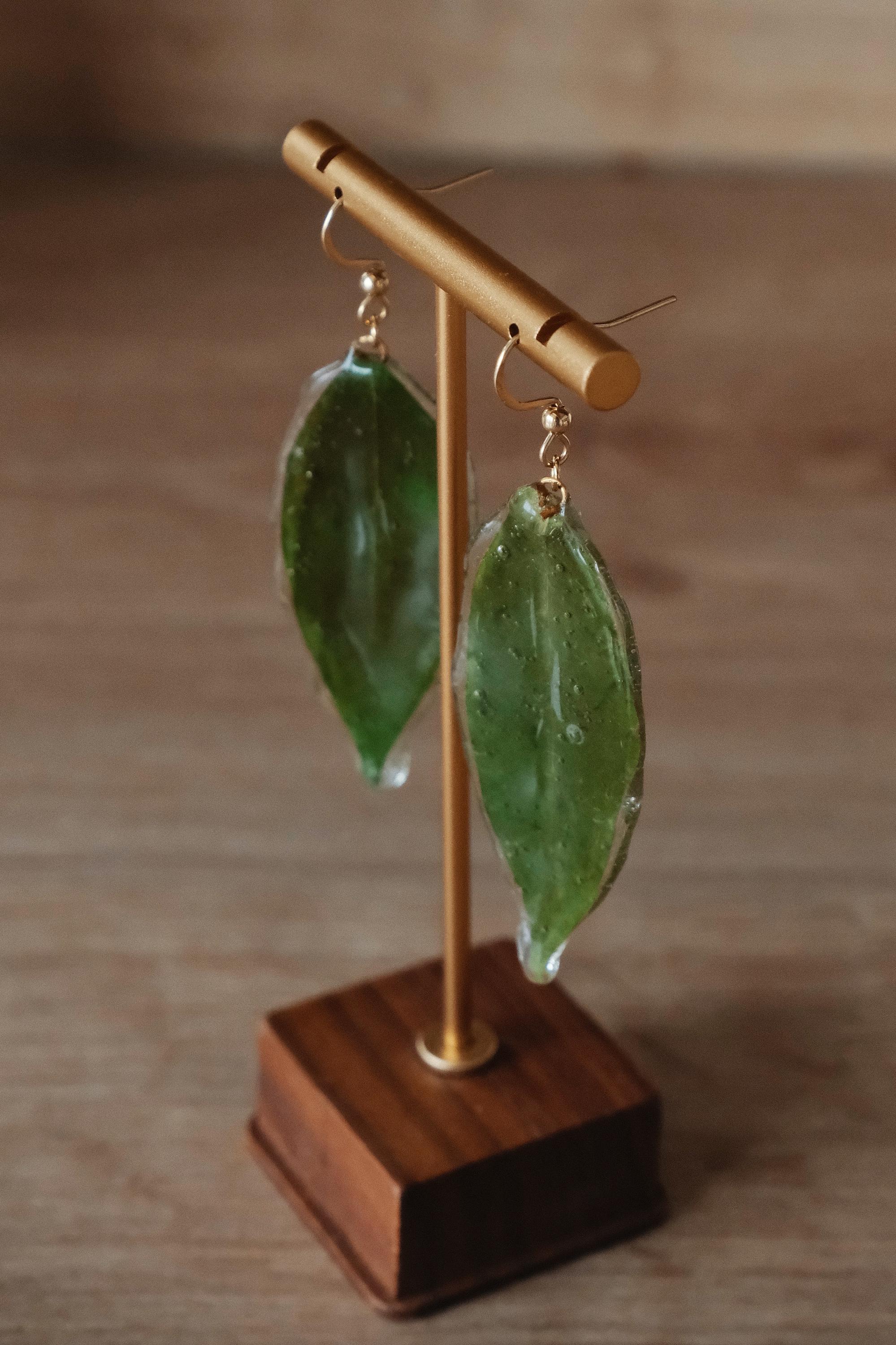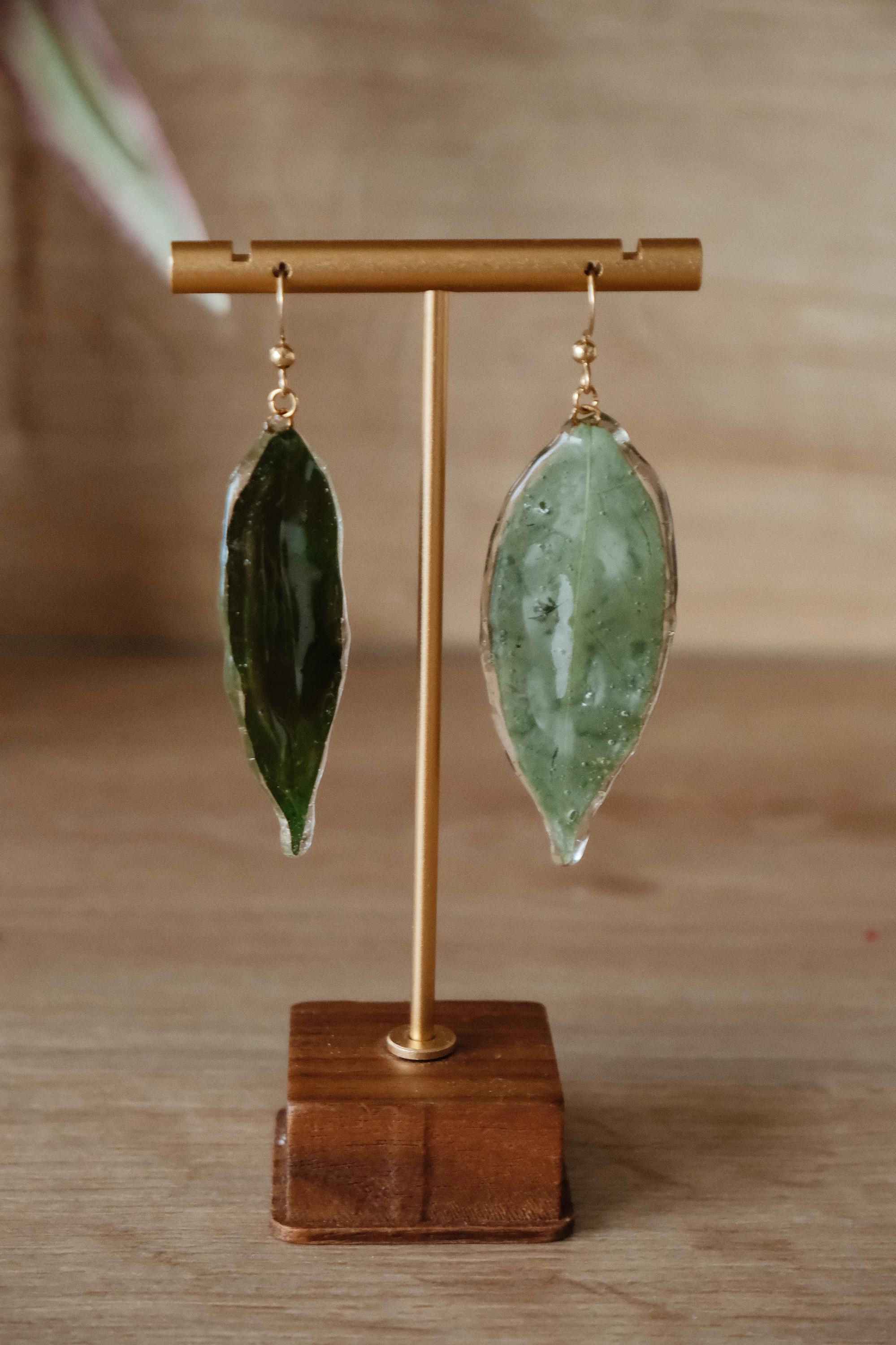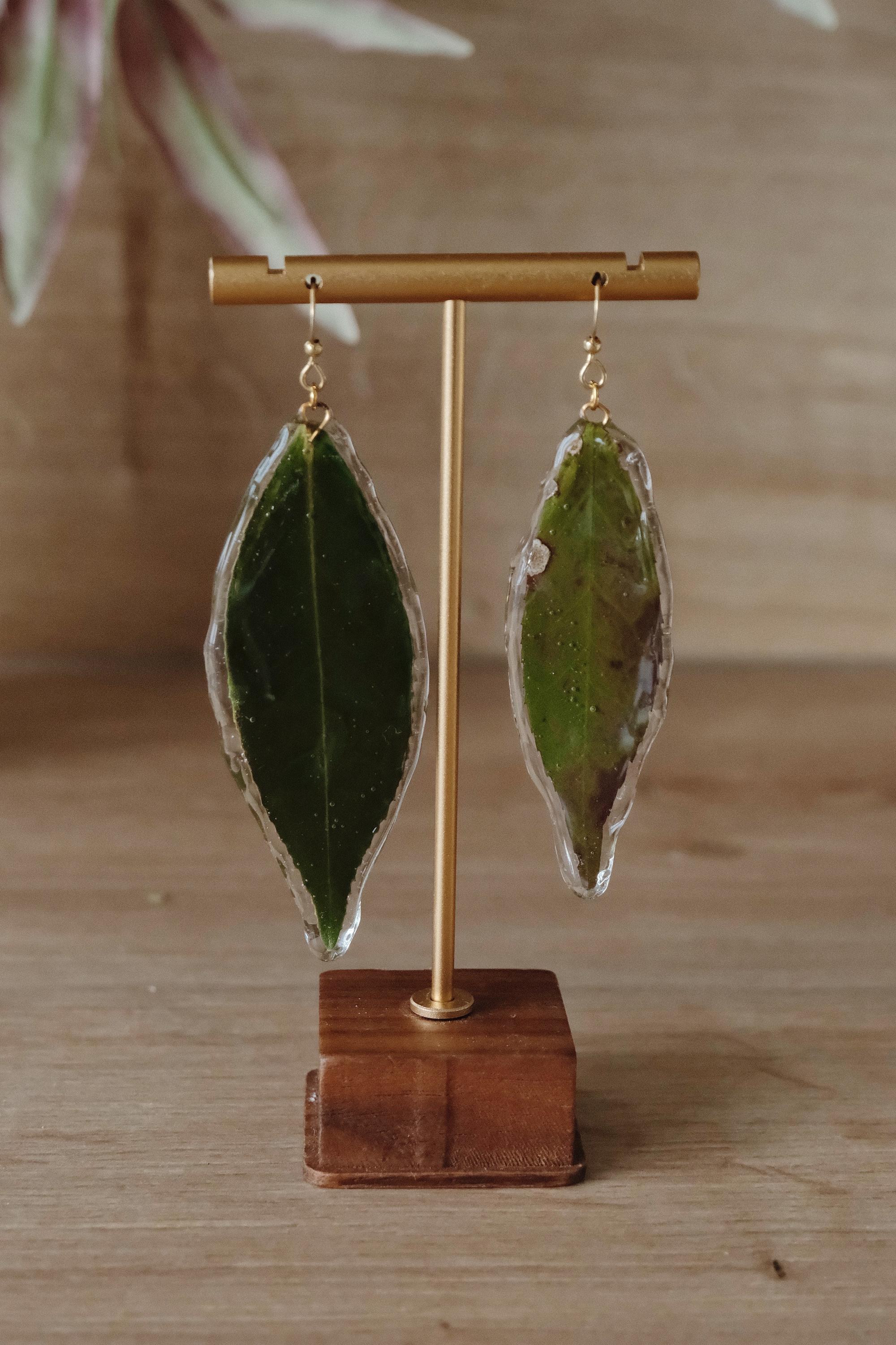 A pair of unique statement earrings made from real leaves, preserved in resin to capture the beauty of nature in every detail. Each leaf is hand-picked and coated with crystal-clear resin, preserving its organic texture and vibrant green hue.