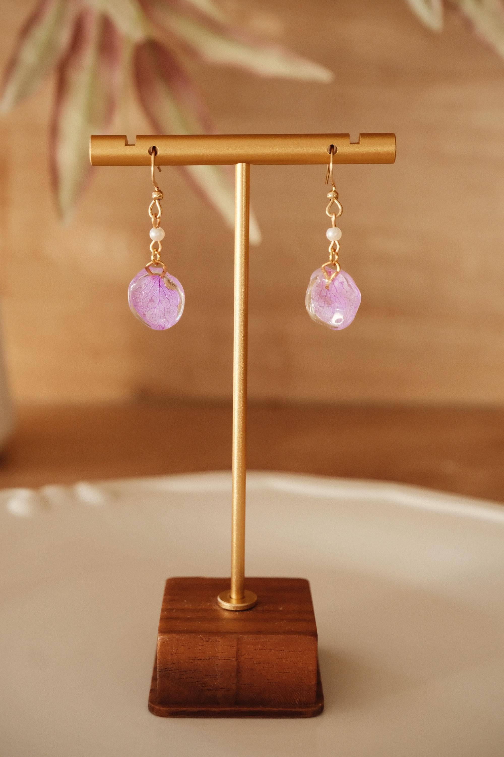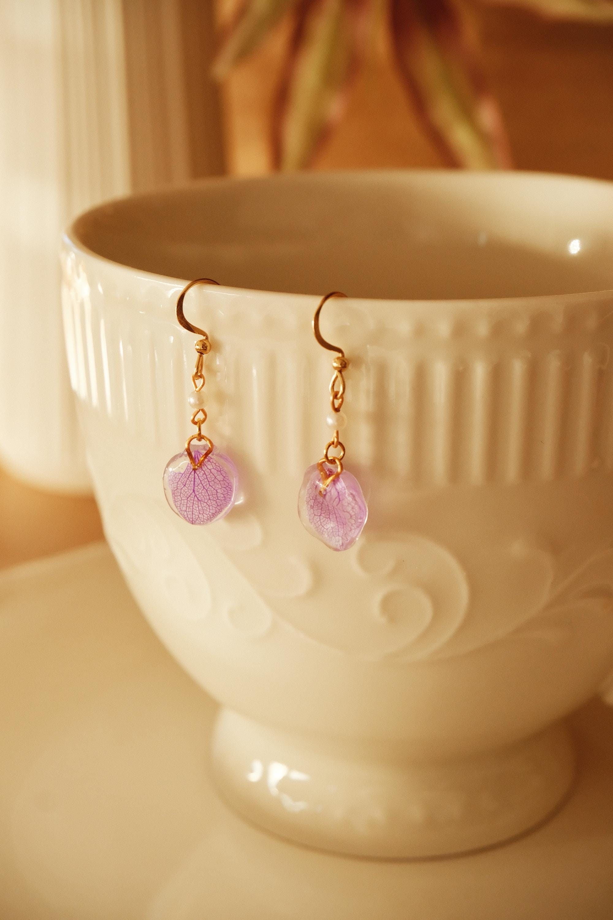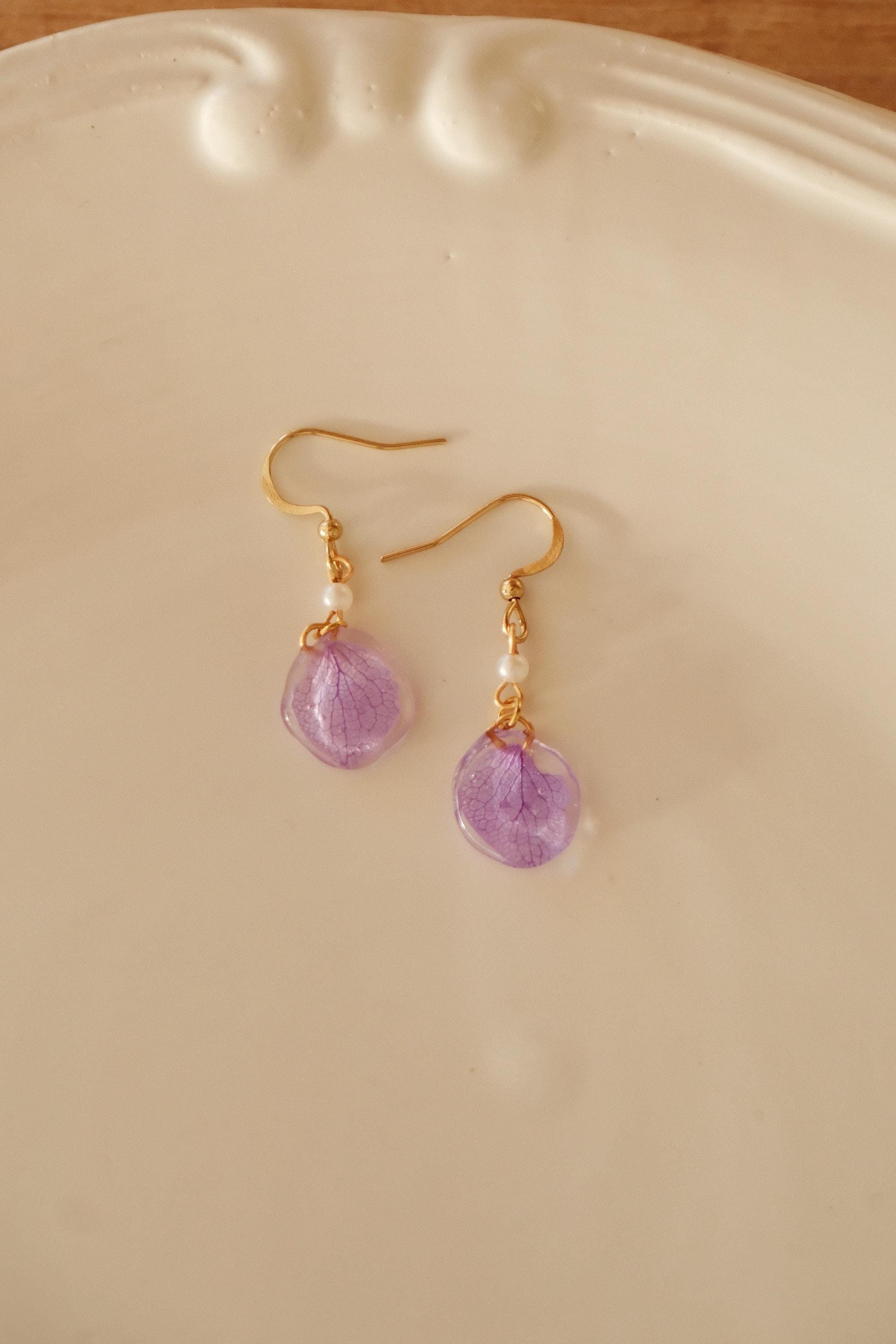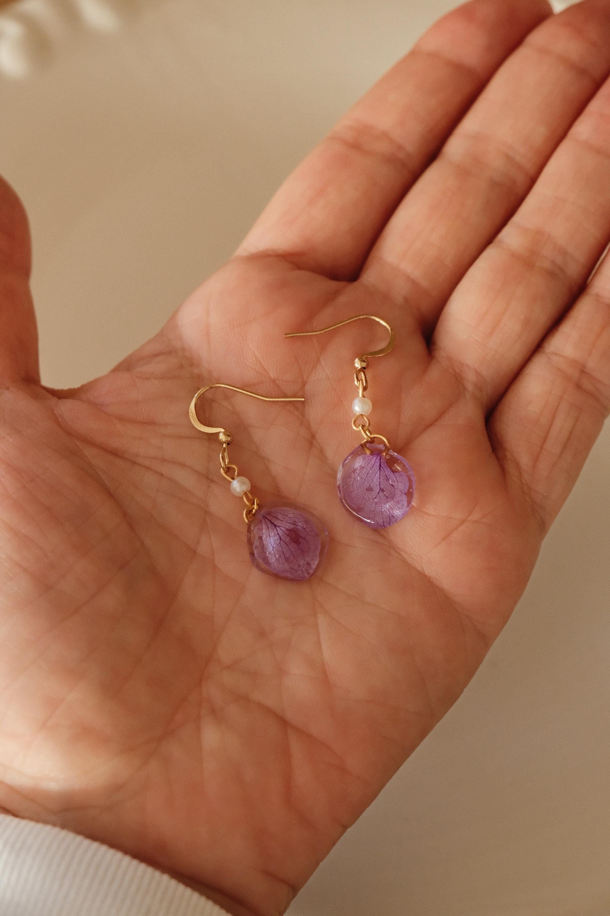 These delicate earrings are made from real hydrangea petals, naturally preserved and encased in clear resin to highlight their intricate veins and soft lilac hue. Lightweight and full of natural charm, they are perfect for adding a subtle yet special touch to your everyday style.