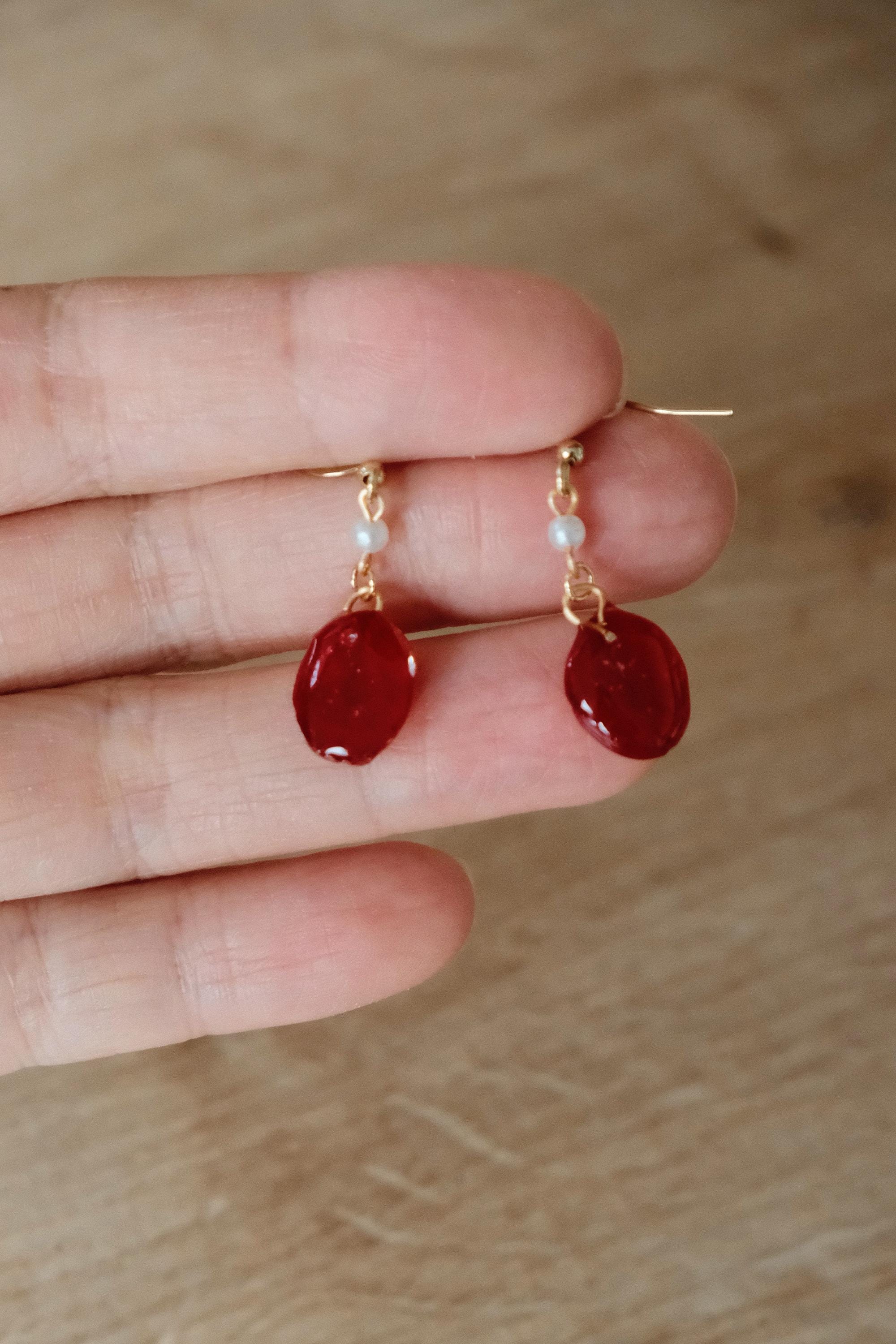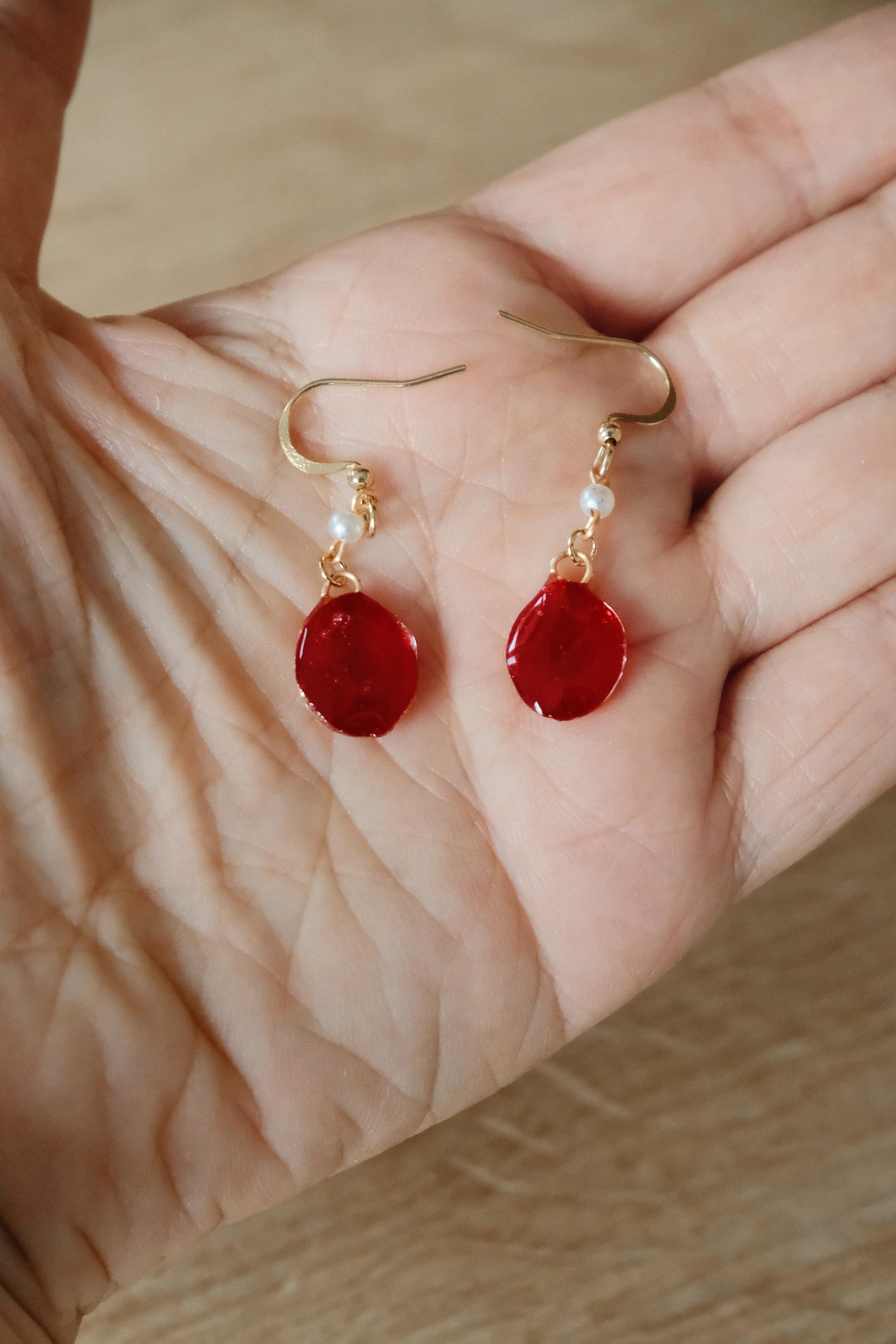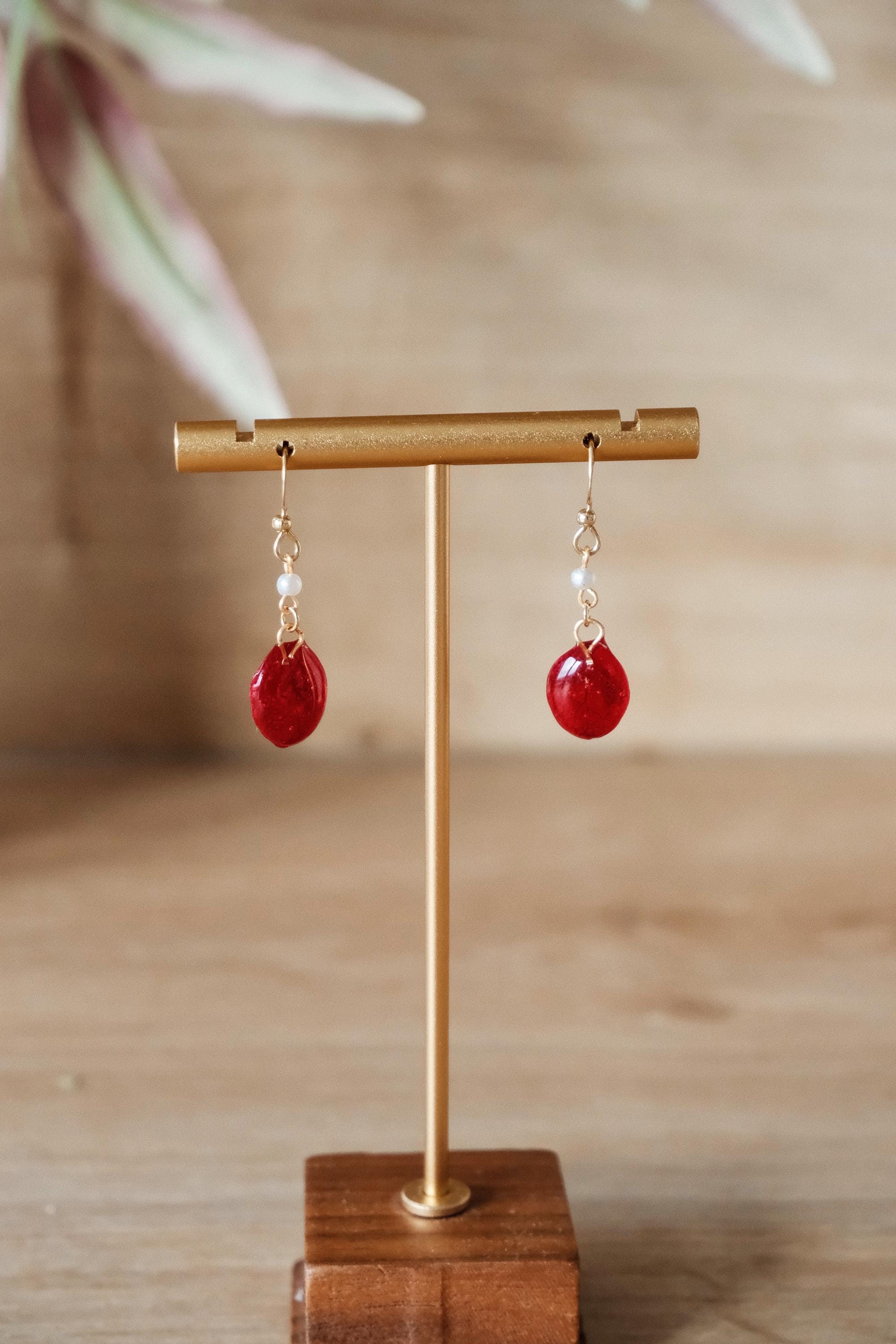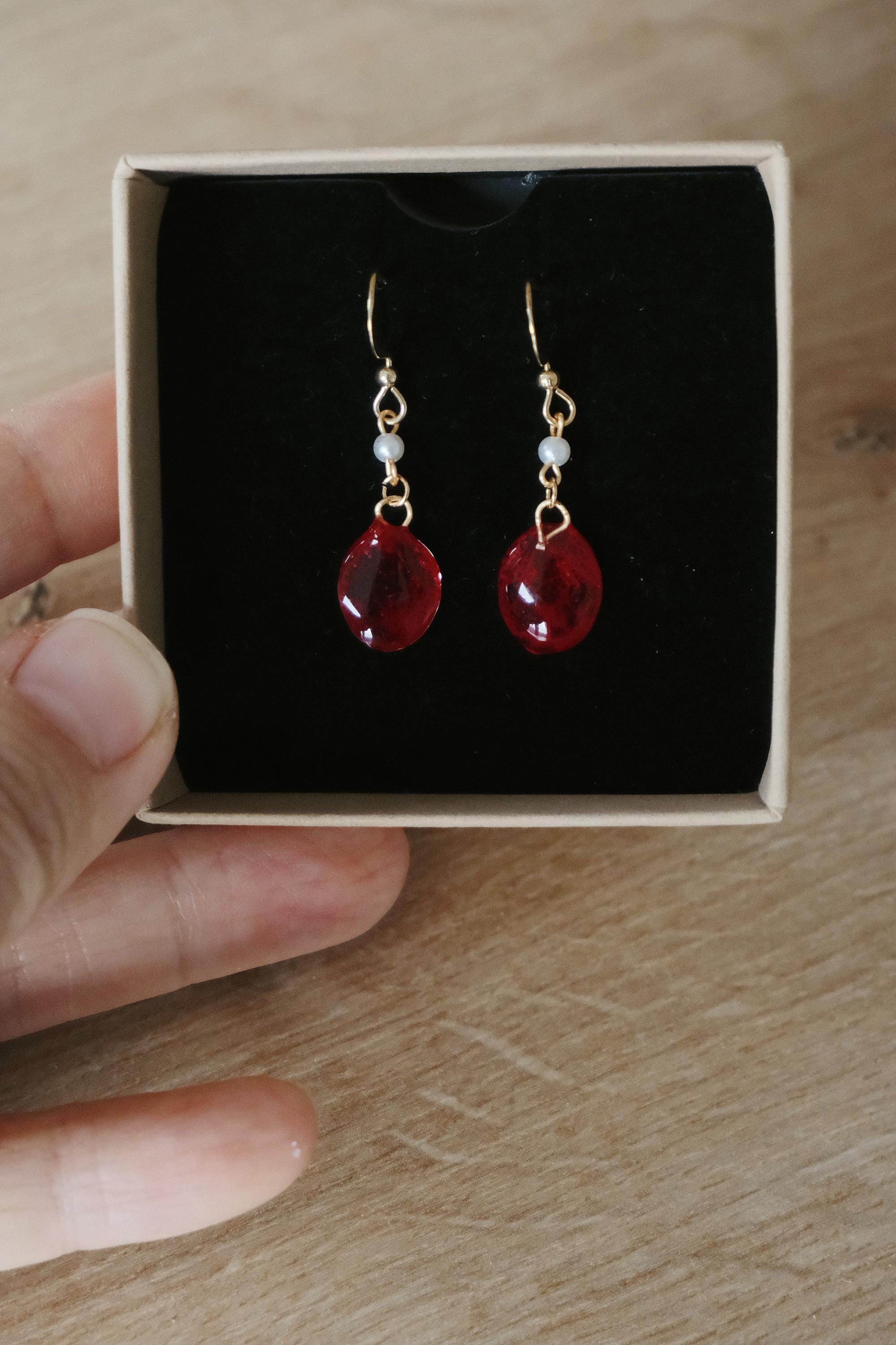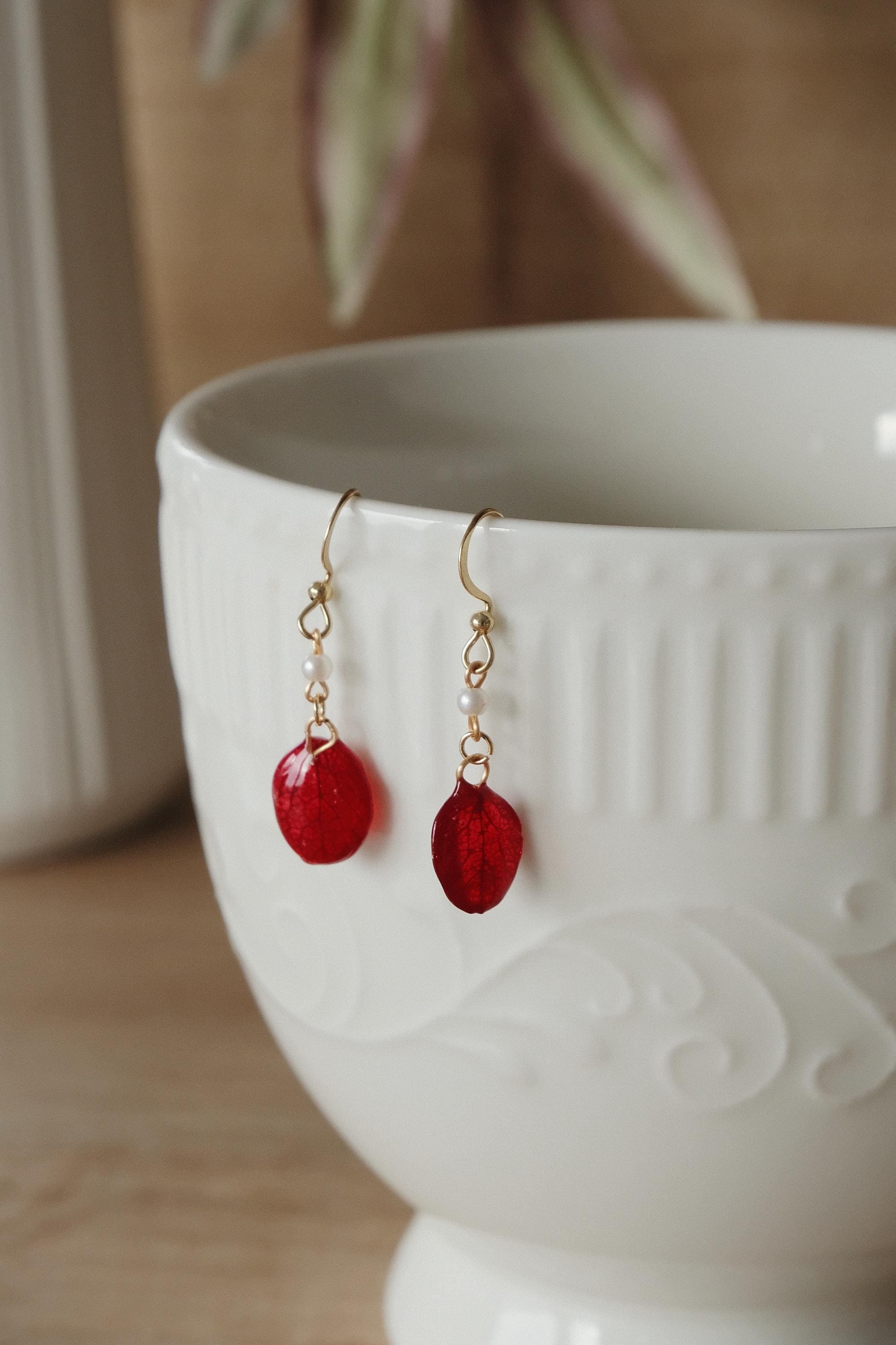 • Materials: Real hydrangea petals (dyed), UV resin, stainless steel hooks • Color: Rich ruby red (dyed), slight variations due to natural materials • Style: Elegant botanical dangle earrings • Packaging: Each pair comes in a kraft box with black velvet lining – ready for gifting • Note: Please avoid submerging in water. Store in a dry place away from direct sunlight.