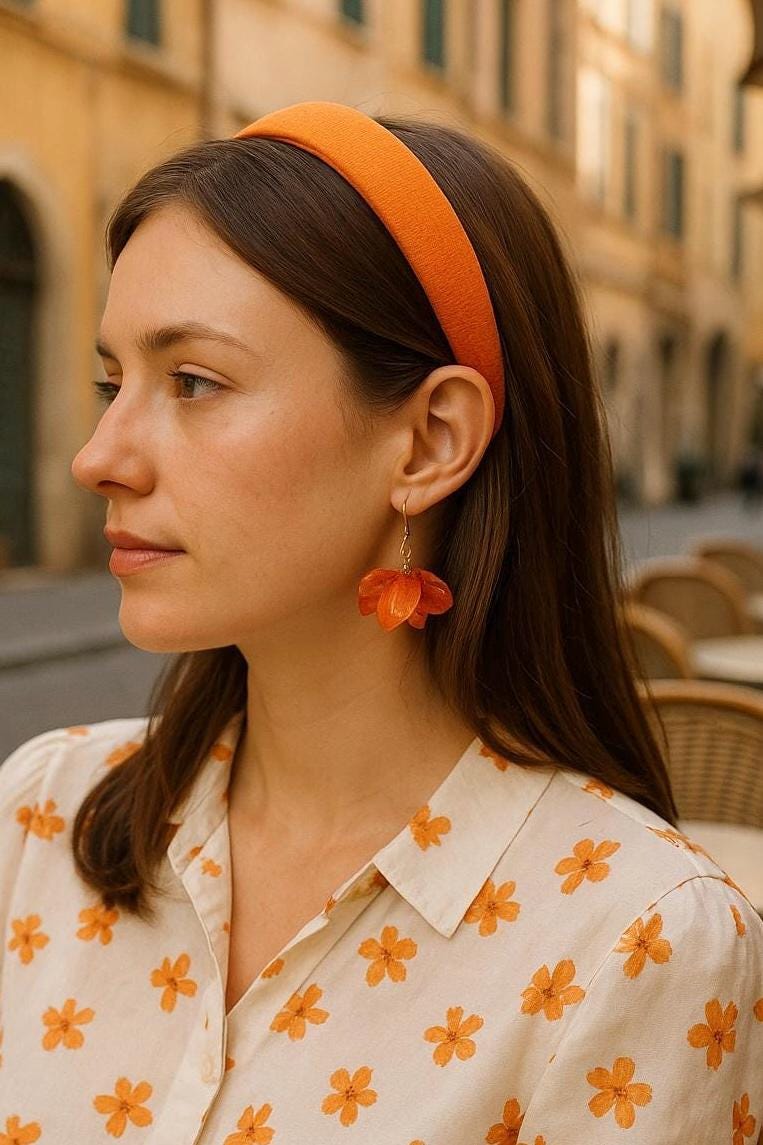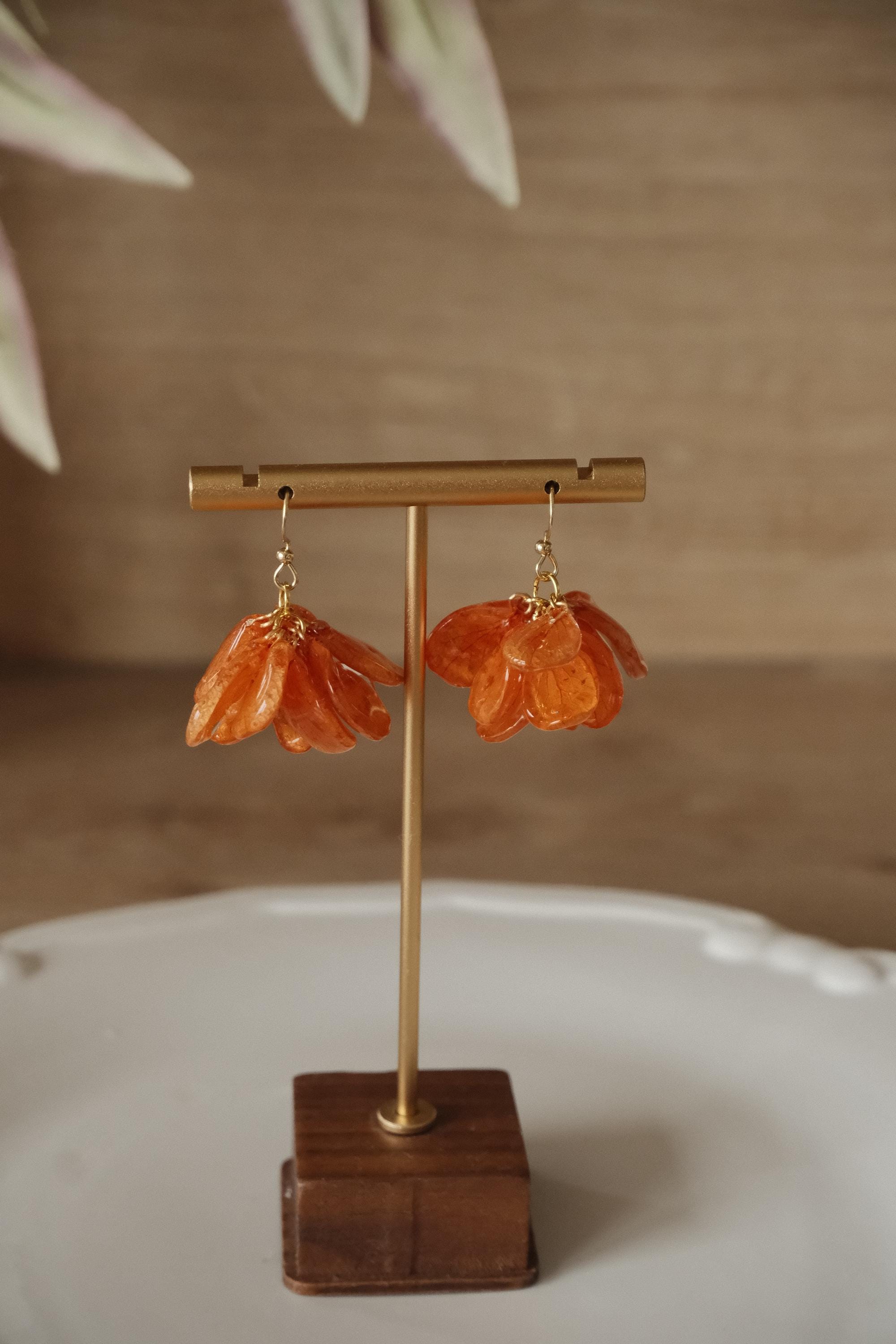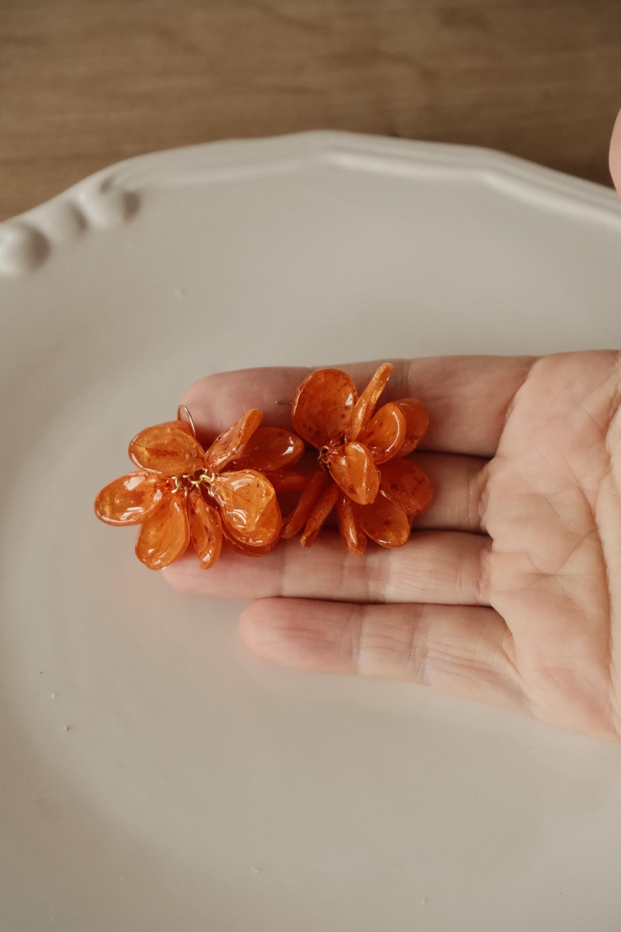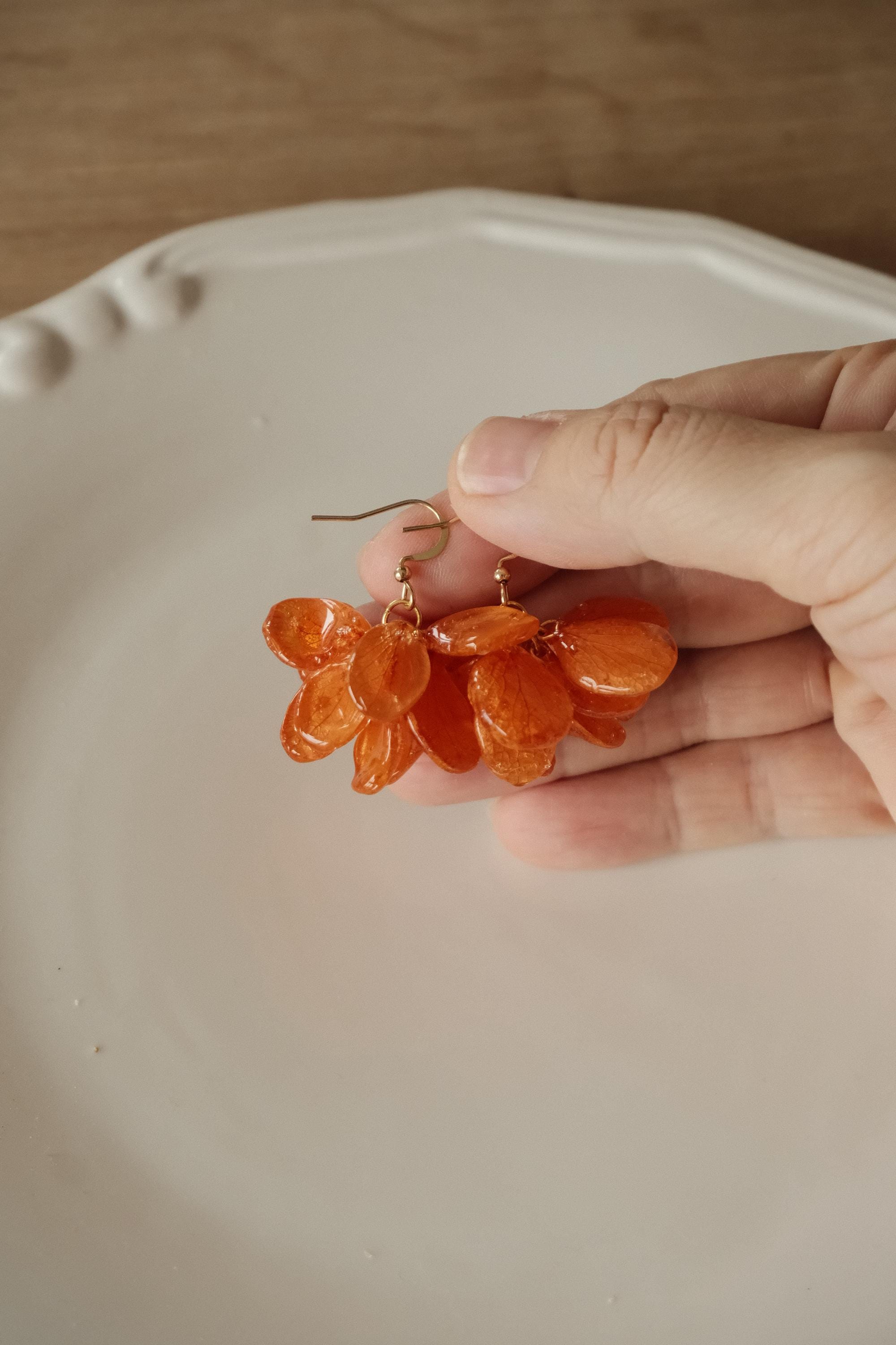 Handmade from real hydrangea petals 🌼 This pair of vibrant orange earrings is crafted using real hydrangea petals, each petal carefully preserved in resin to keep its natural texture, veins, and shape. Every piece is unique — no two petals look exactly the same, just like in nature.