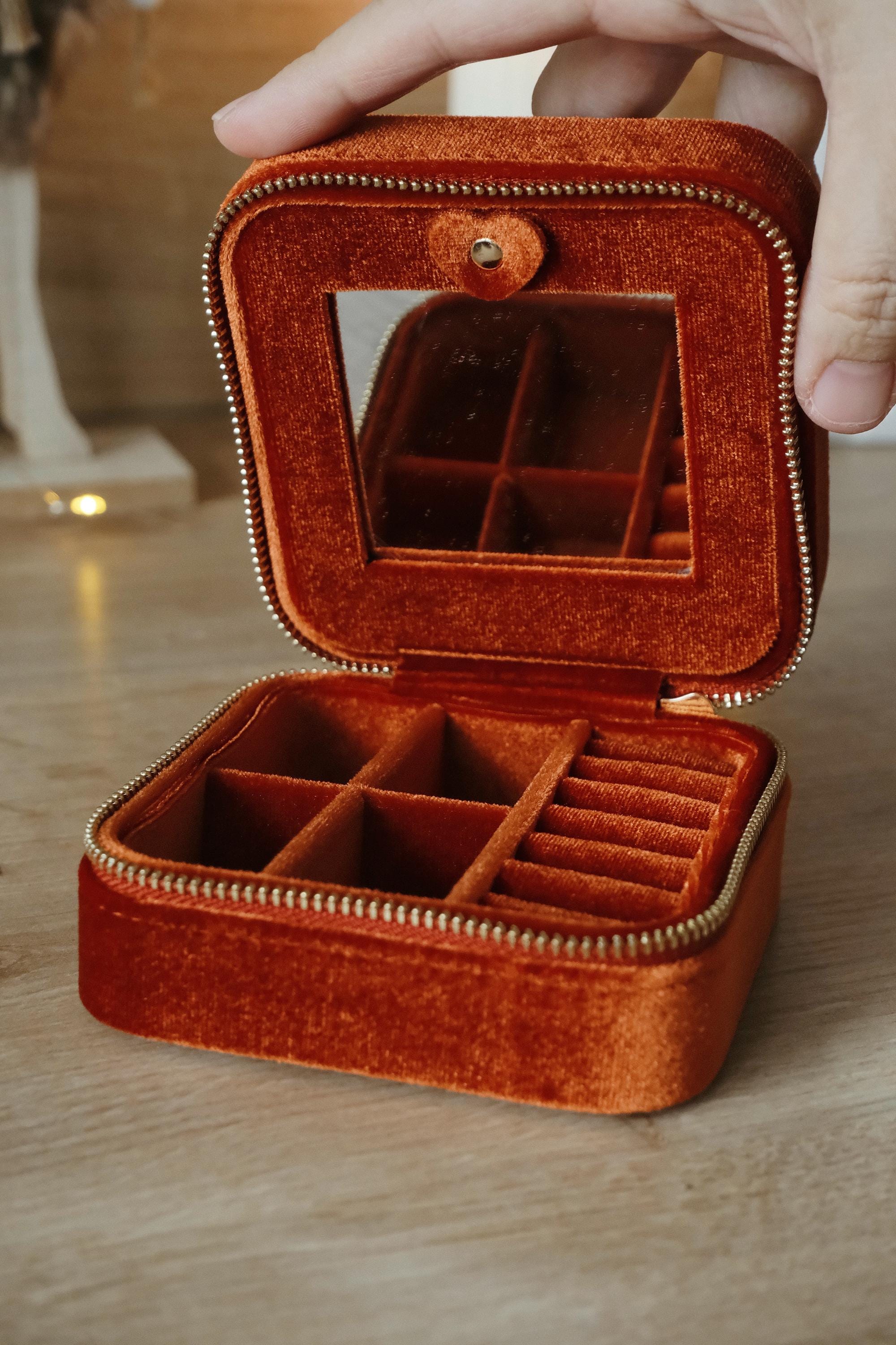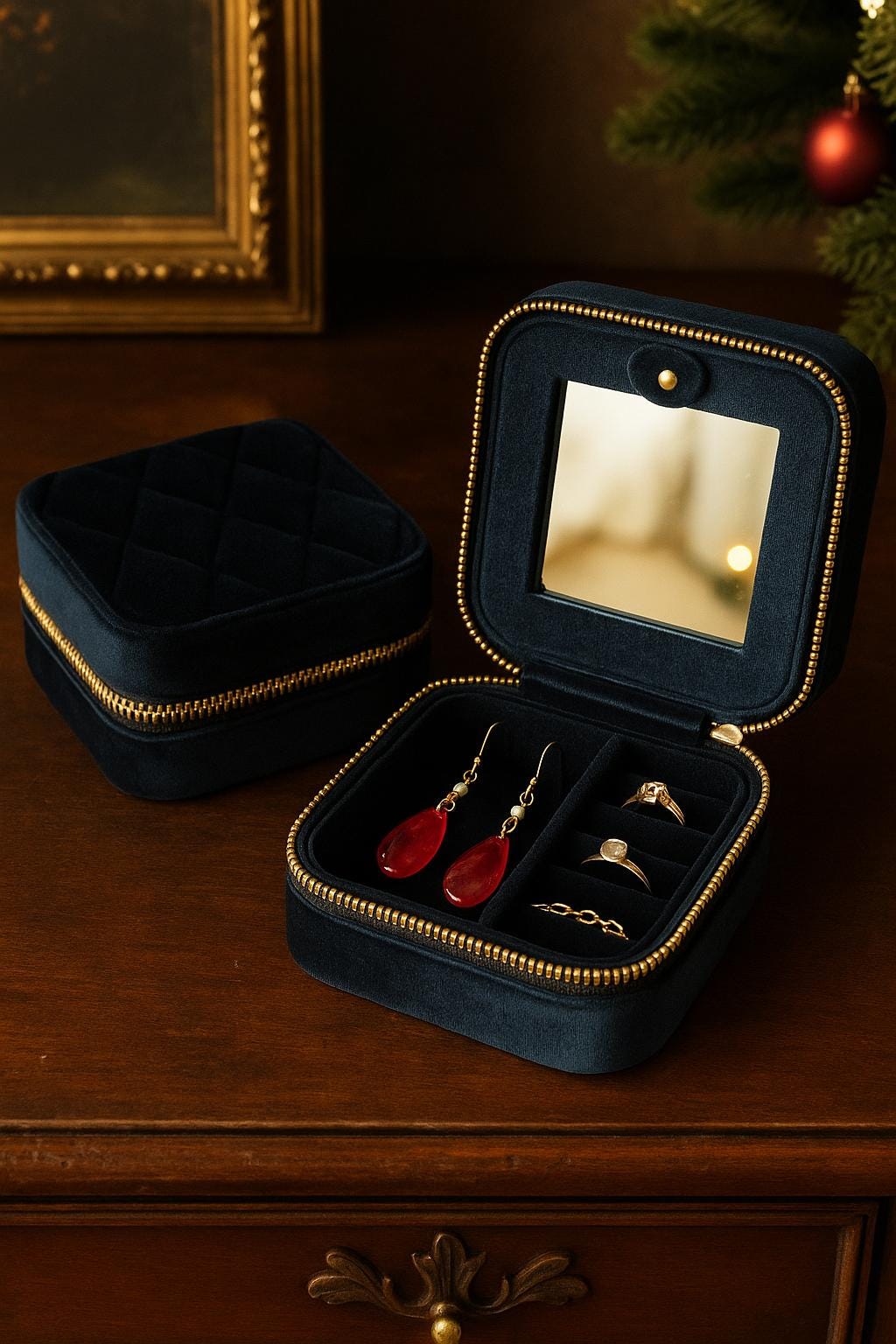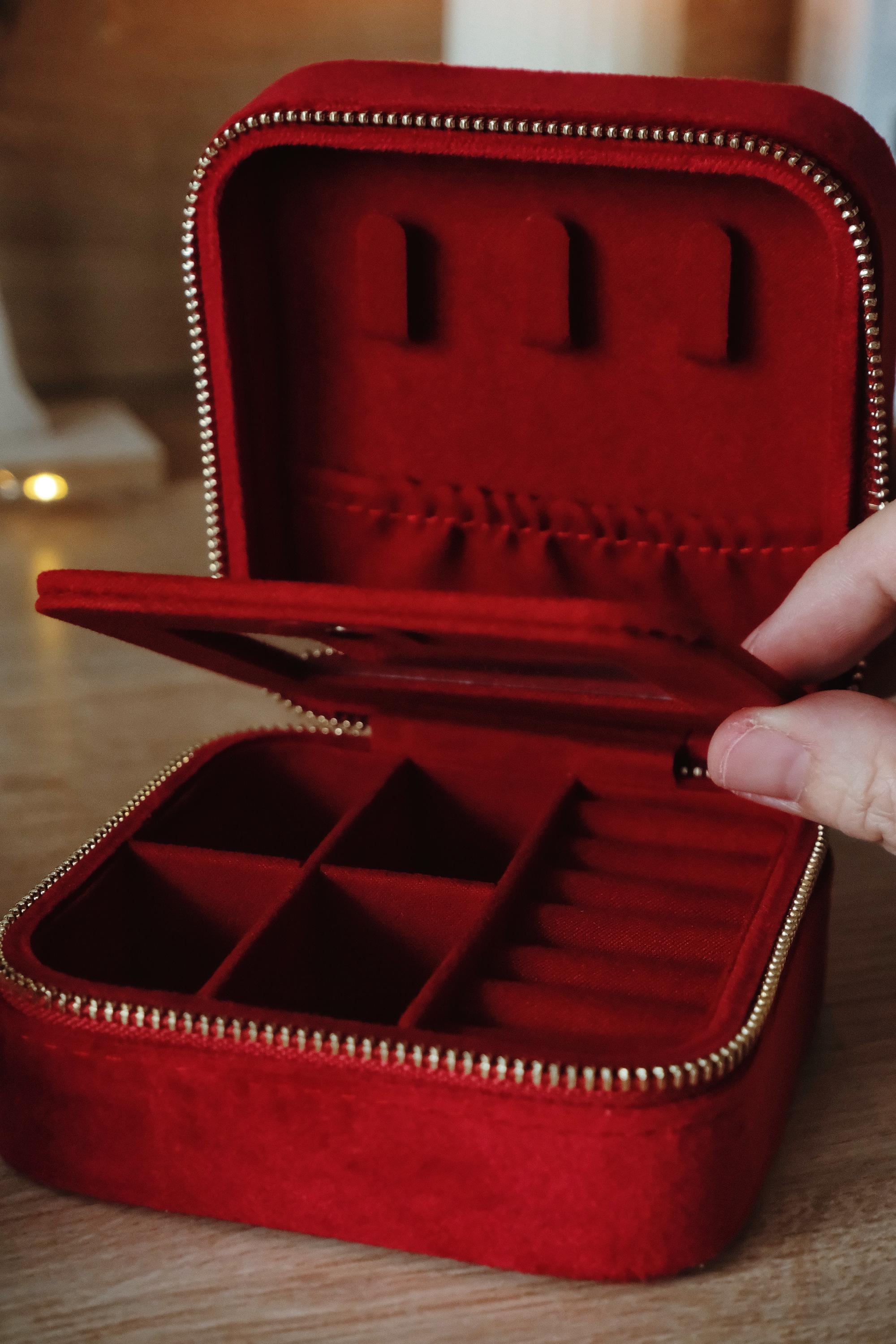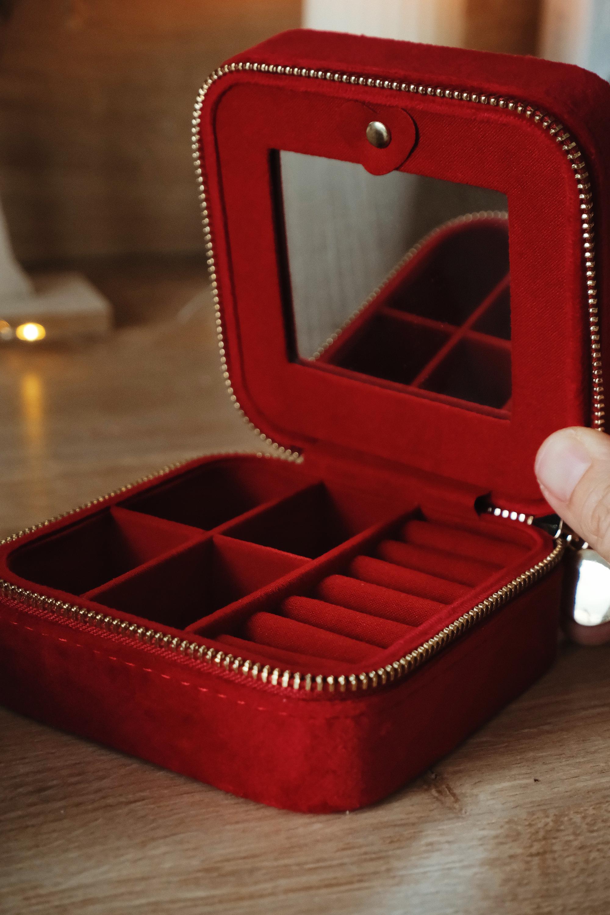 ✨ Product Features • Material: Premium soft velvet • Size: 100 × 100 × 50 mm • Built-in mirror • Two-layer interior design • Multiple compartments for rings, earrings, bracelets & small keepsakes • Smooth gold zipper for an elegant finish • Perfect for travel or daily organization