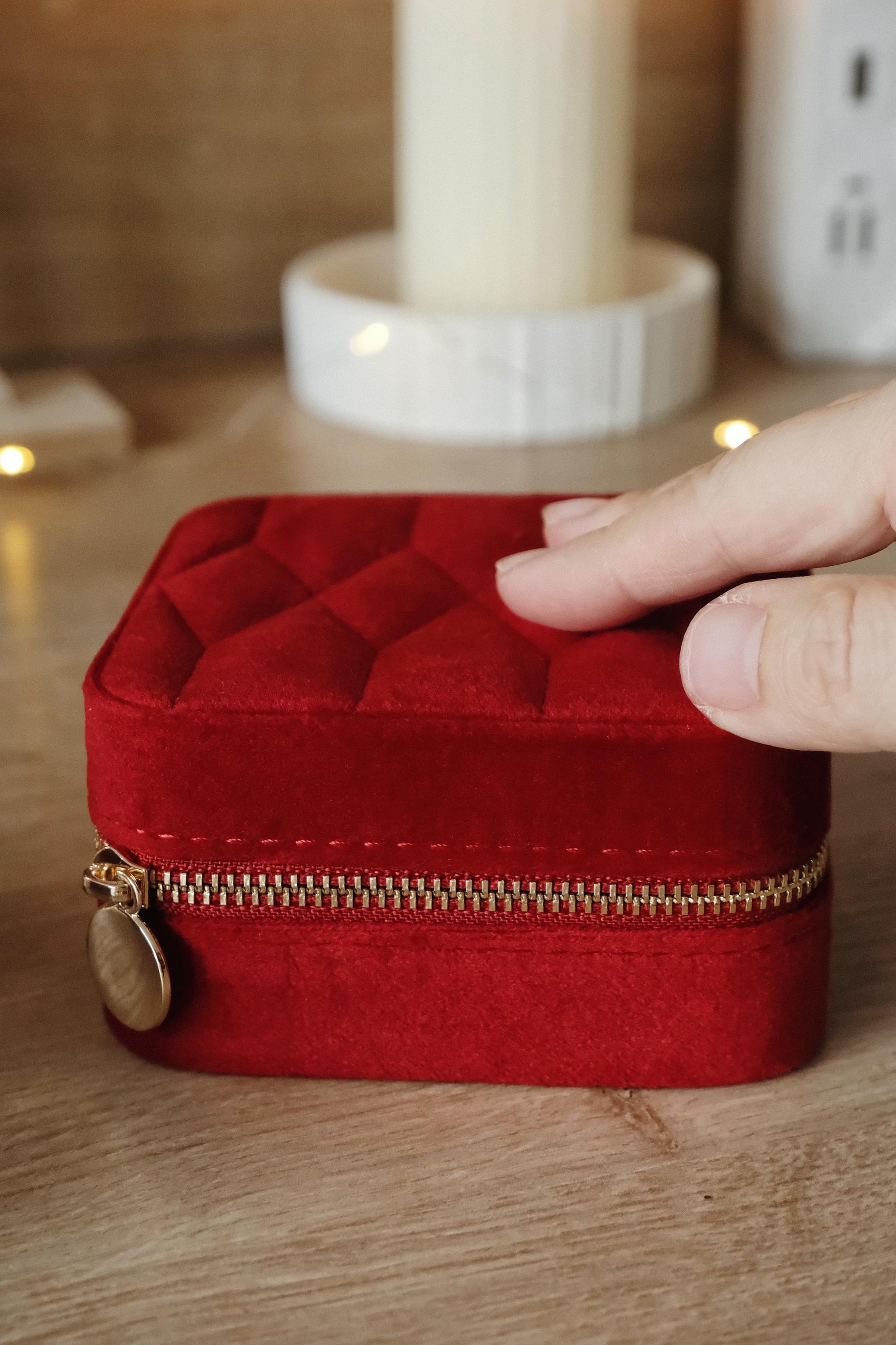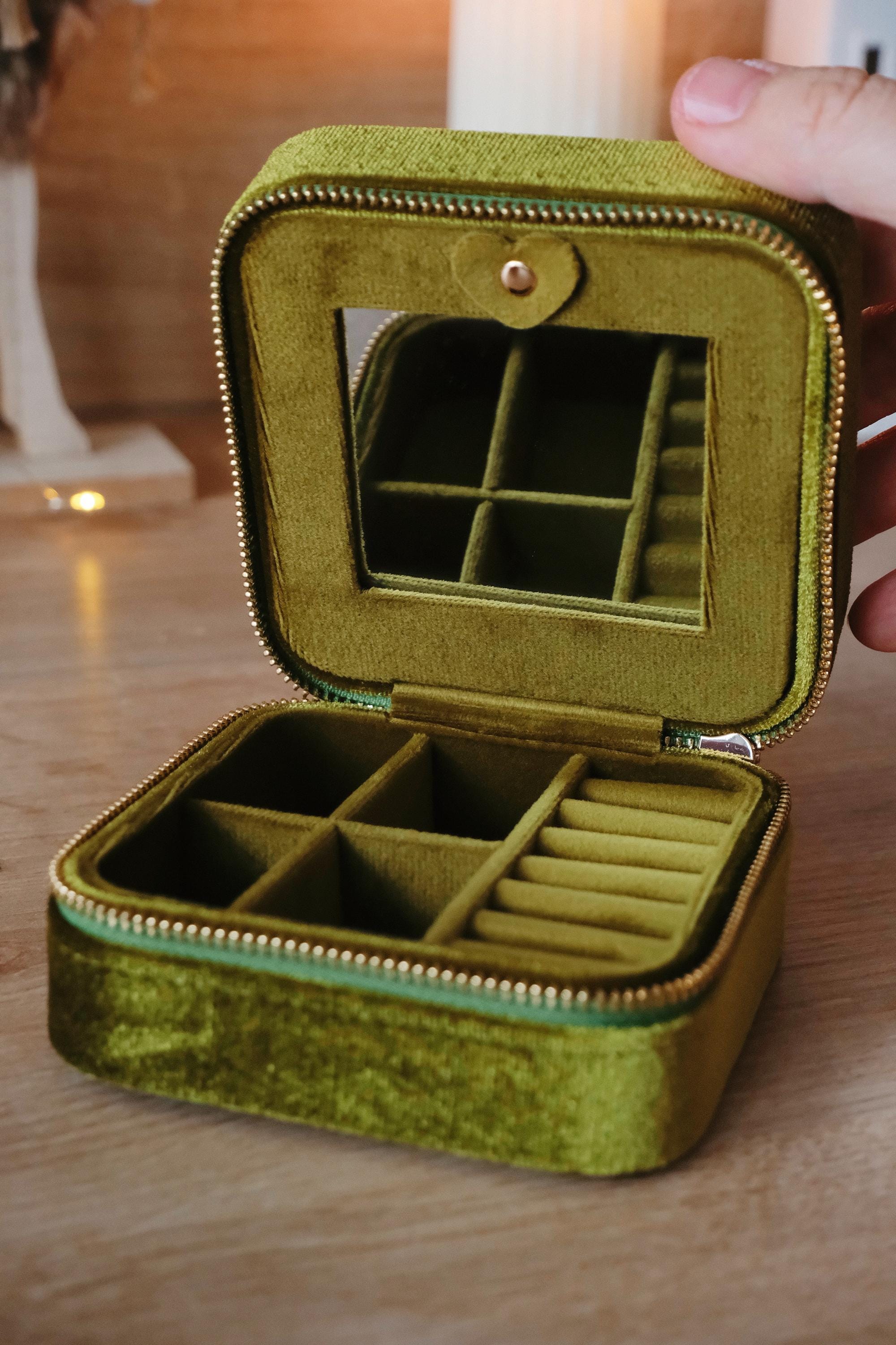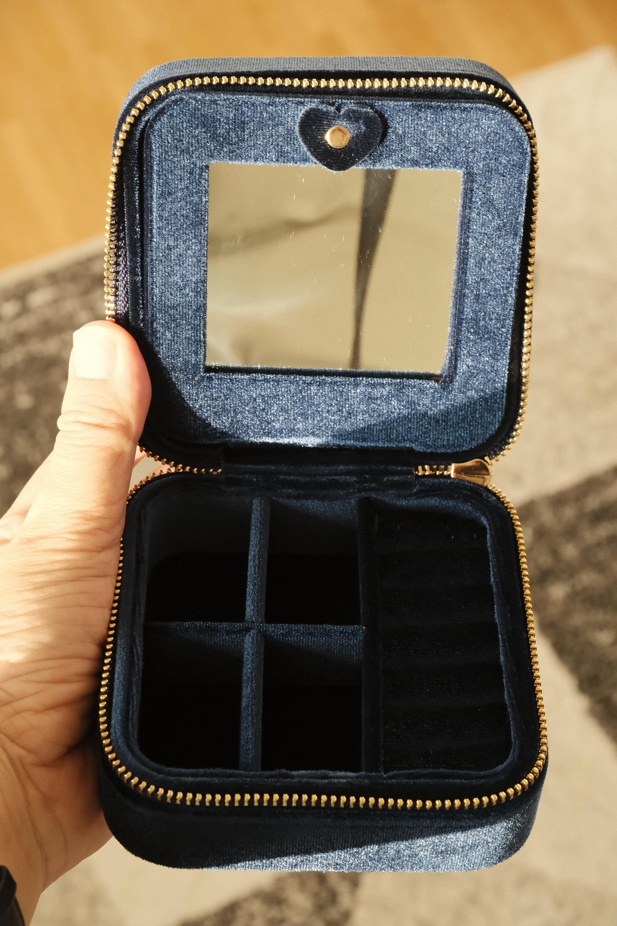✨ Product Features • Material: Premium soft velvet • Size: 100 × 100 × 50 mm • Built-in mirror • Two-layer interior design • Multiple compartments for rings, earrings, bracelets & small keepsakes • Smooth gold zipper for an elegant finish • Perfect for travel or daily organization