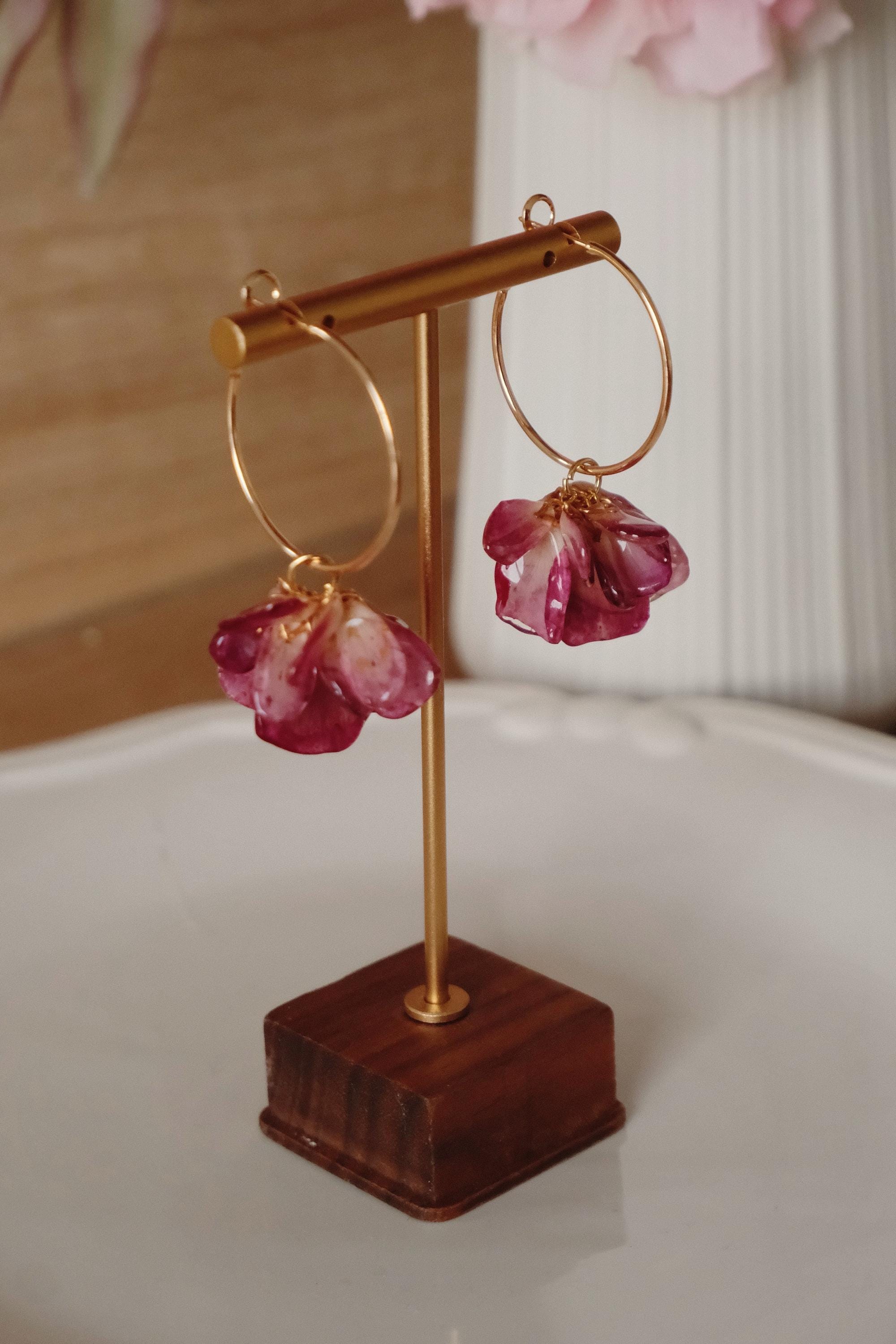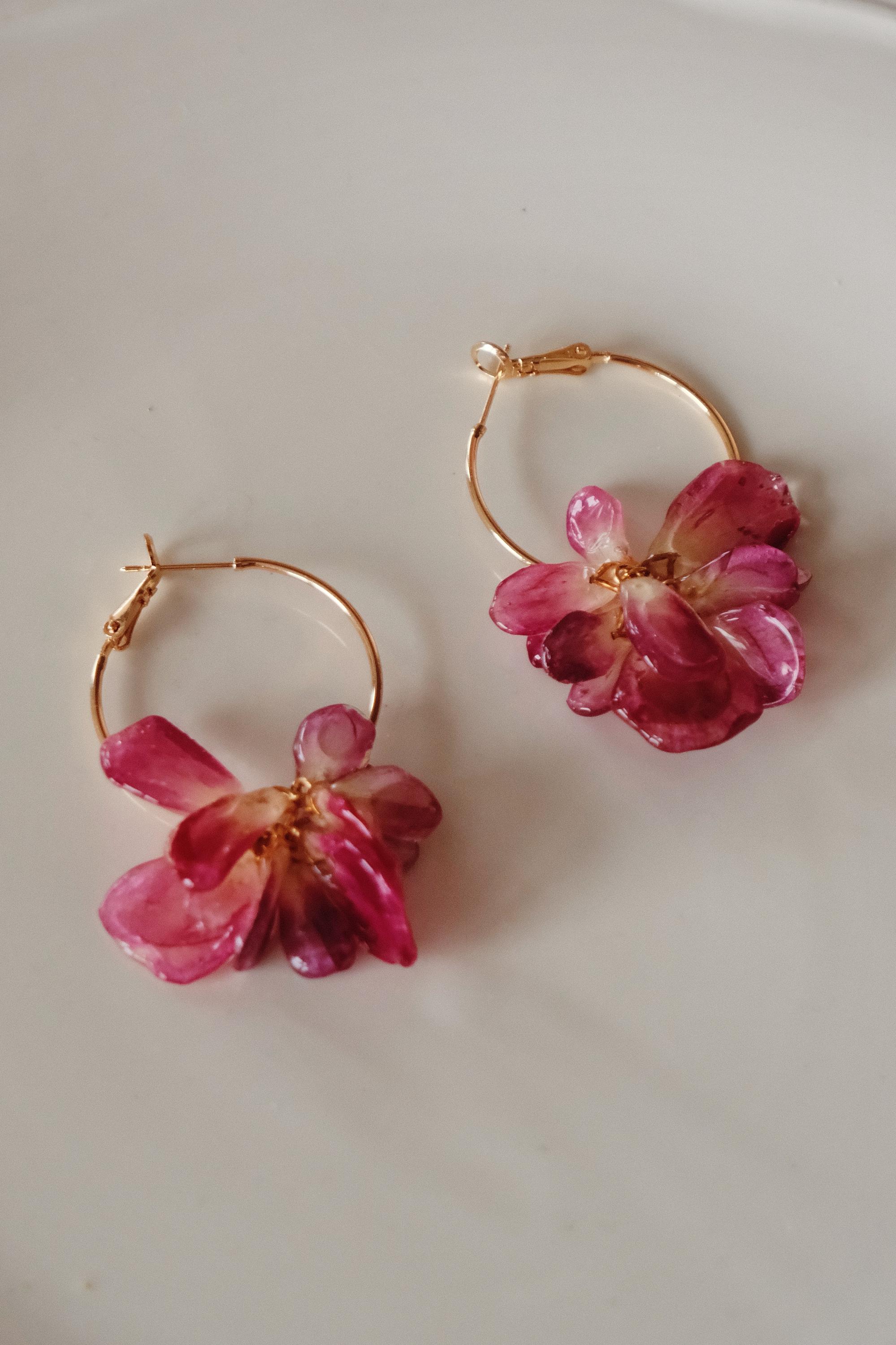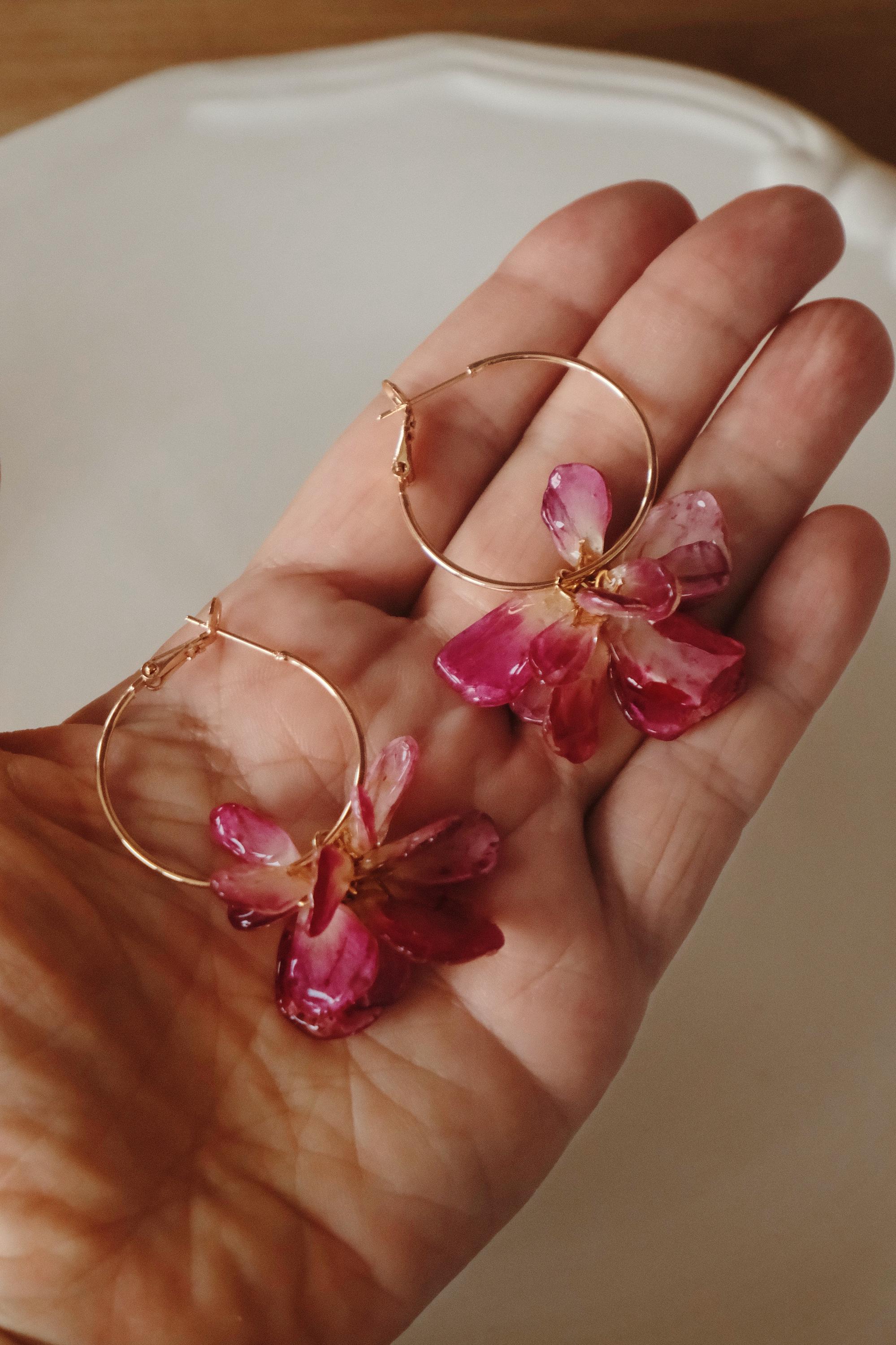 Handmade with Real Rose Petals — one-of-a-kind floral hoops. Each petal is carefully preserved in resin, keeping its natural color, shape, and soft gradients. No two petals are ever the same, making every pair completely unique — just like the person who wears them.
