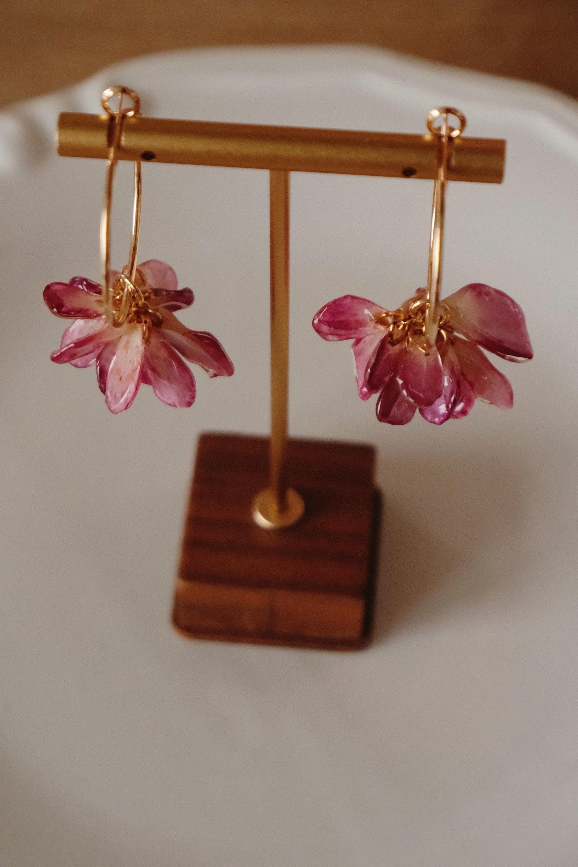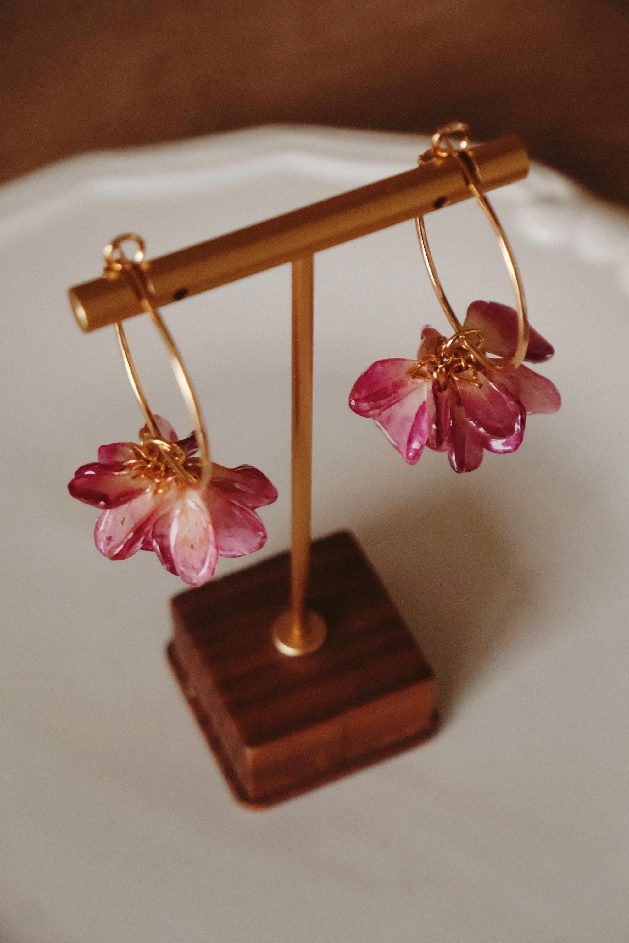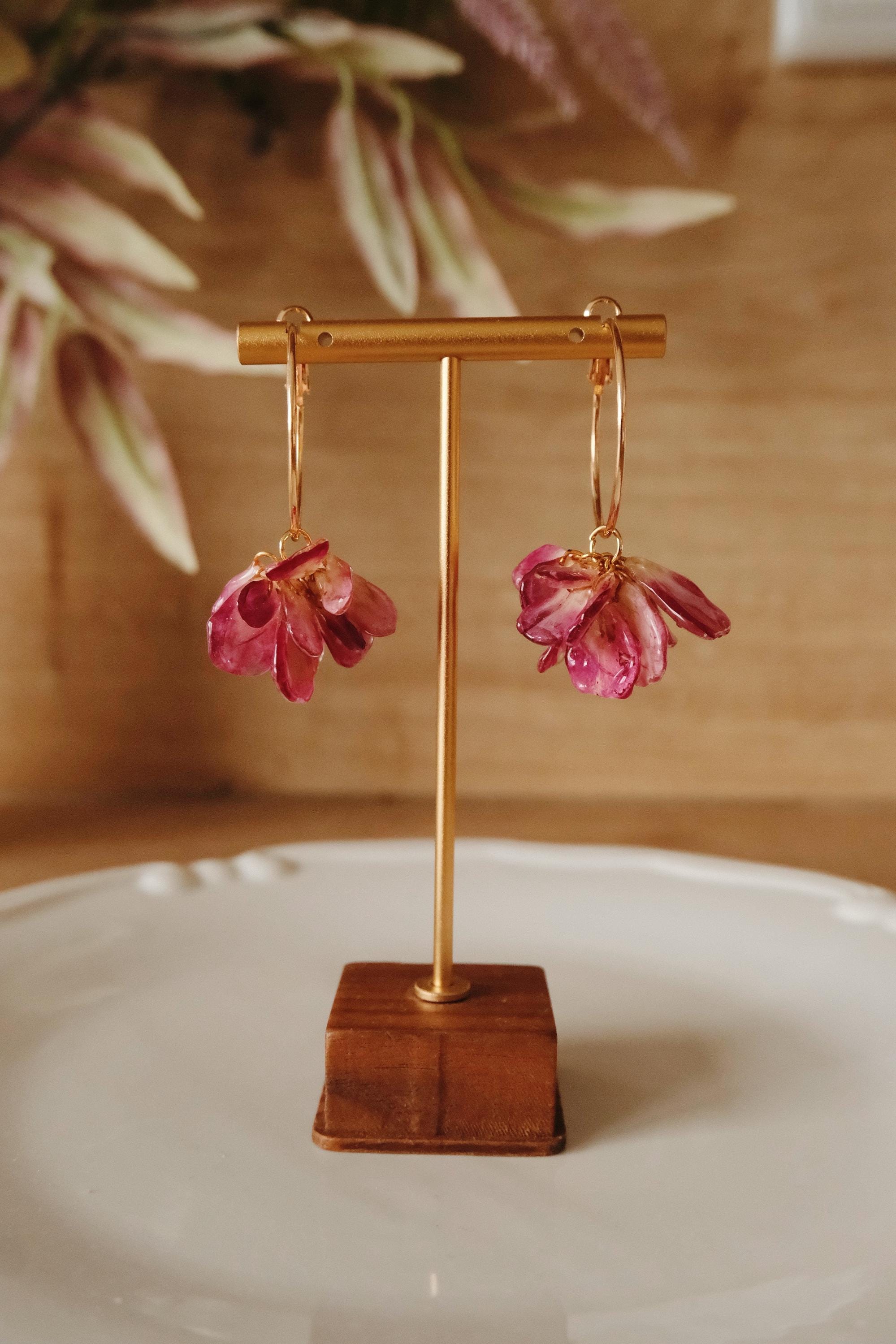 Handmade with Real Rose Petals — one-of-a-kind floral hoops. Each petal is carefully preserved in resin, keeping its natural color, shape, and soft gradients. No two petals are ever the same, making every pair completely unique — just like the person who wears them.