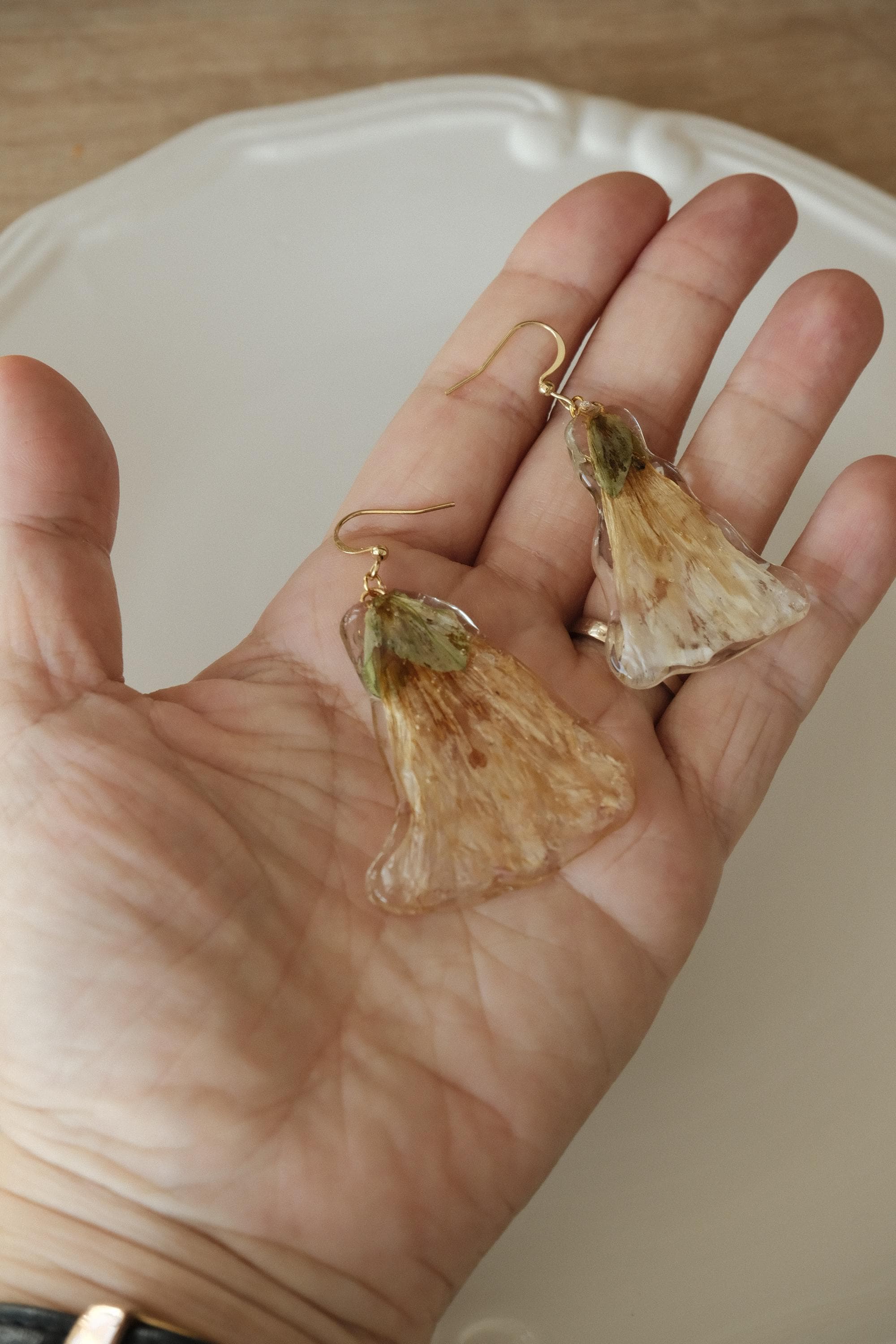 Each piece keeps the natural shape, veins, and soft color of the flower, making every pair one of a kind. Lightweight and gently translucent, they move naturally when worn and feel easy on the ears.